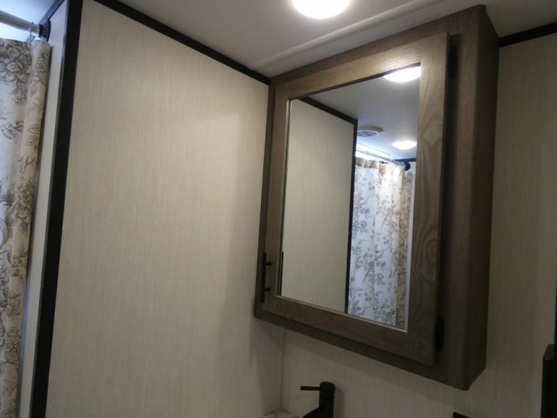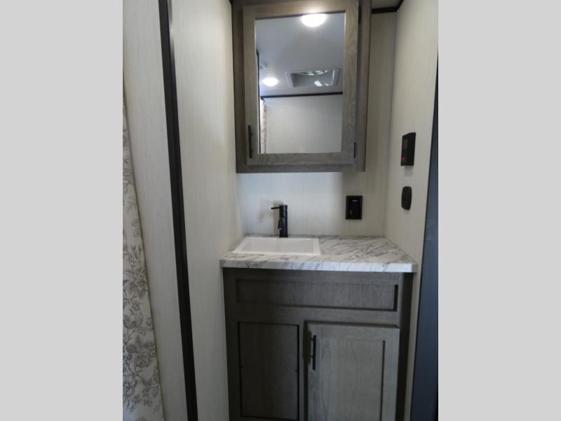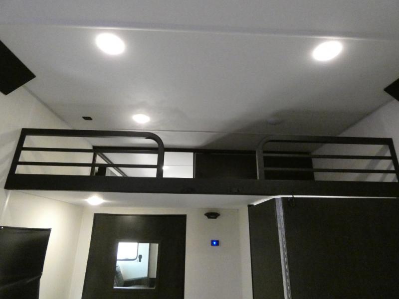 Fun at the campground begins with this dual entry toy hauler in tow! There is a 15' 6" separate garage with glass patio doors, a loft above for guests, a half bath with folding walls and a flip-down recessed bath sink. The combined kitchen and living room features a U-shaped kitchen with a flip-up countertop, a sofa slide out, and a bartop with two stools. There is even an outdoor kitchen on the other side of this counter so you can make breakfast as the sun comes up. A full bath lets you freshen up after a trail ride, and the front private bedroom gives you your own space at night. This unit also features washer and dryer prep in the bedroom so you can add those appliances if you wish!