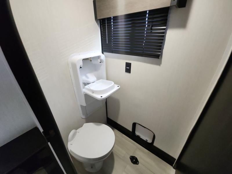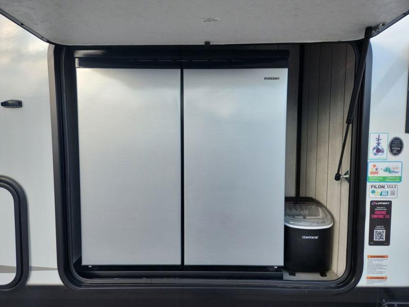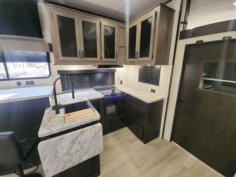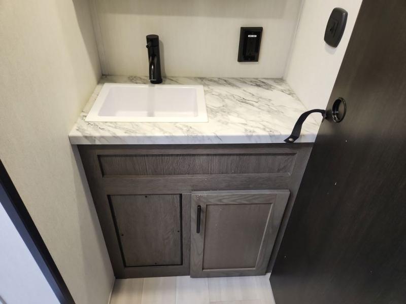 Fun at the campground begins with this dual entry toy hauler in tow! There is a 15' 6" separate garage with glass patio doors, a loft above for guests, a half bath with folding walls and a flip-down recessed bath sink. The combined kitchen and living room features a U-shaped kitchen with a flip-up countertop, a sofa slide out, and a bartop with two stools. There is even an outdoor kitchen on the other side of this counter so you can make breakfast as the sun comes up. A full bath lets you freshen up after a trail ride, and the front private bedroom gives you your own space at night. This unit also features washer and dryer prep in the bedroom so you can add those appliances if you wish!