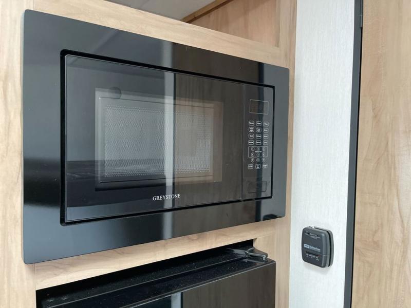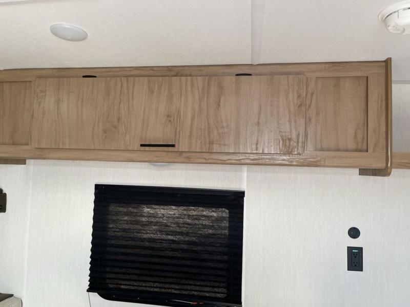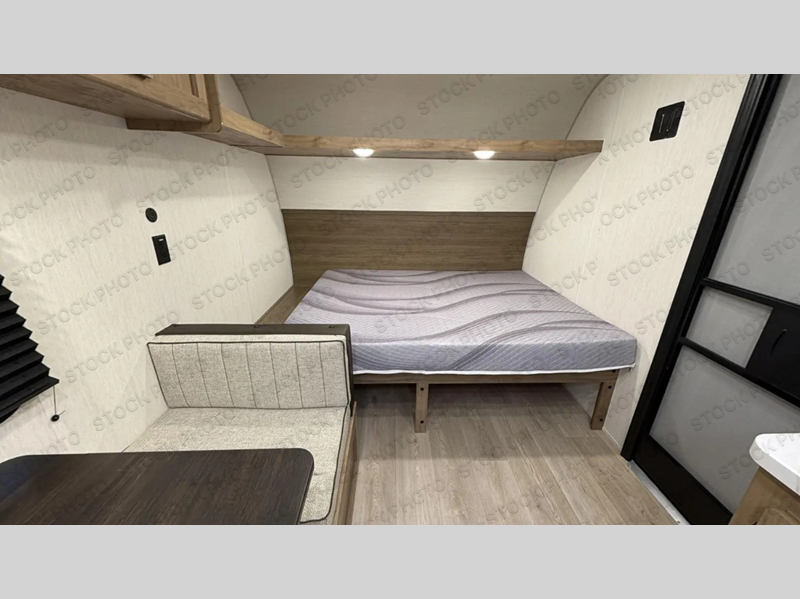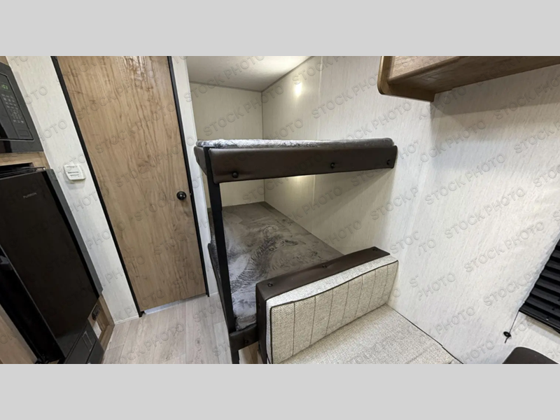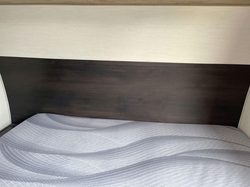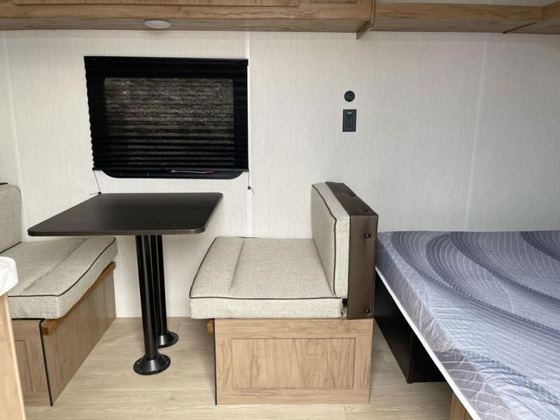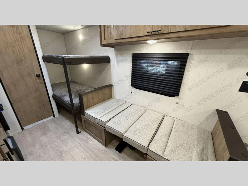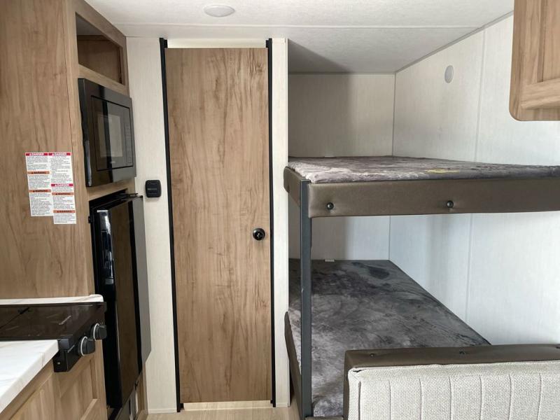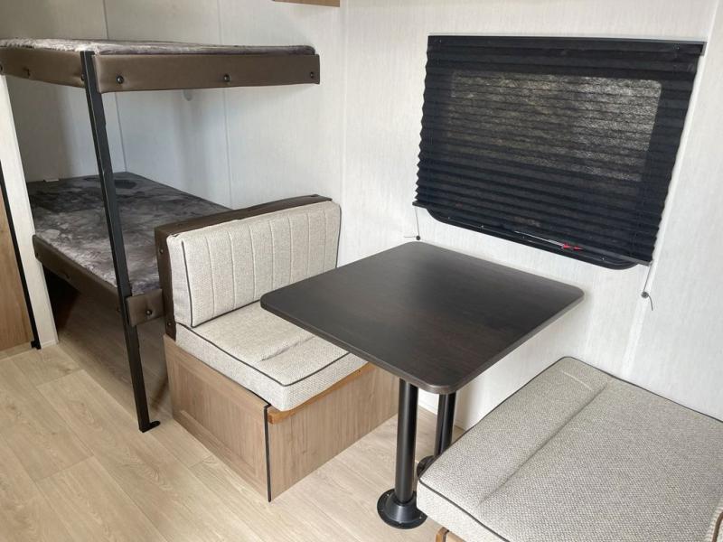 The whole family can sleep comfortably in this travel trailer! It has a set of bunk beds for the kids to sleep on, and you can sleep comfortably on the front queen bed with overhead cabinets and a shelf. The chef will enjoy preparing their best home cooked meals with the high output cooktop, and you can dine at the booth dinette. And the private bath onboard means you won't have to leave your camper in the middle of the night!