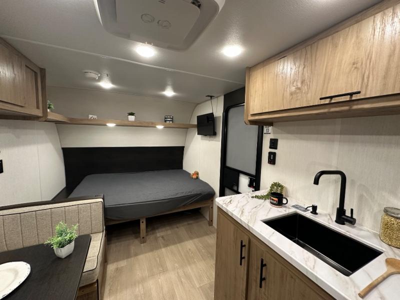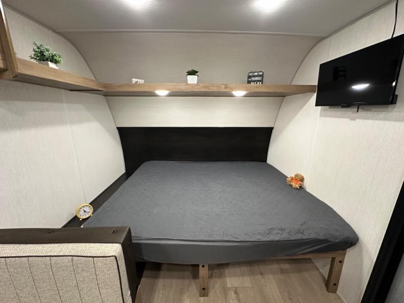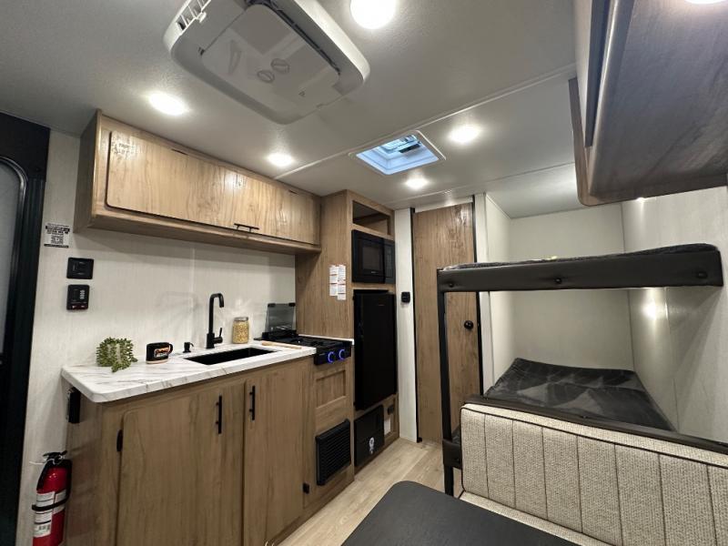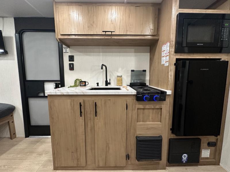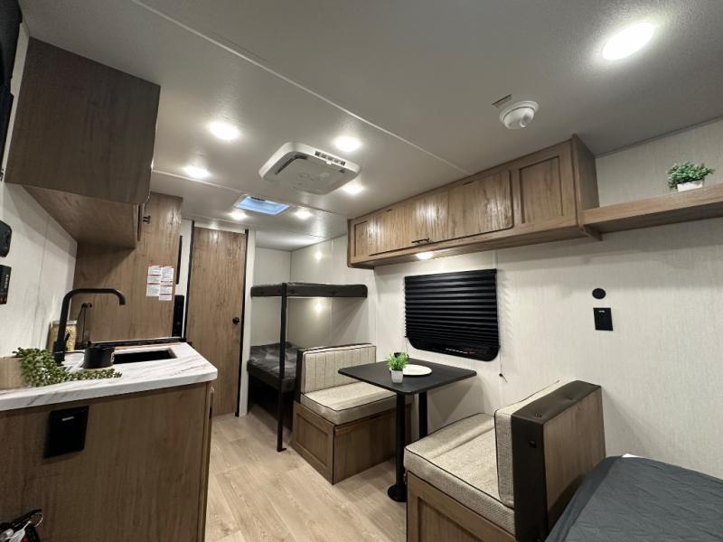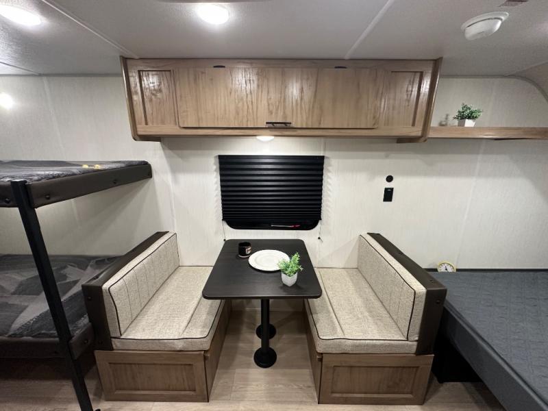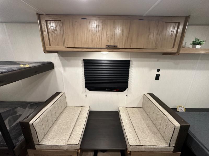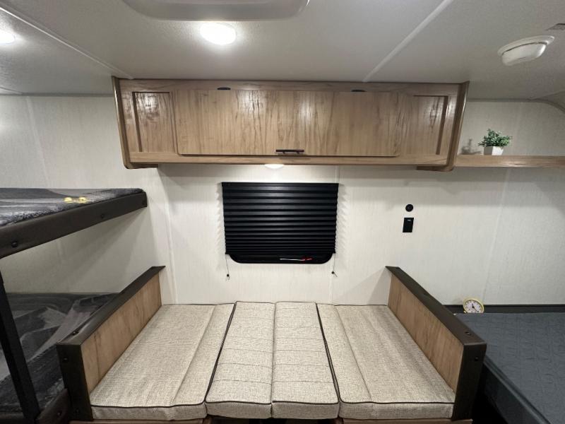 The whole family can sleep comfortably in this travel trailer! It has a set of bunk beds for the kids to sleep on, and you can sleep comfortably on the front queen bed with overhead cabinets and a shelf. The chef will enjoy preparing their best home cooked meals with the high output cooktop, and you can dine at the booth dinette. And the private bath onboard means you won't have to leave your camper in the middle of the night!