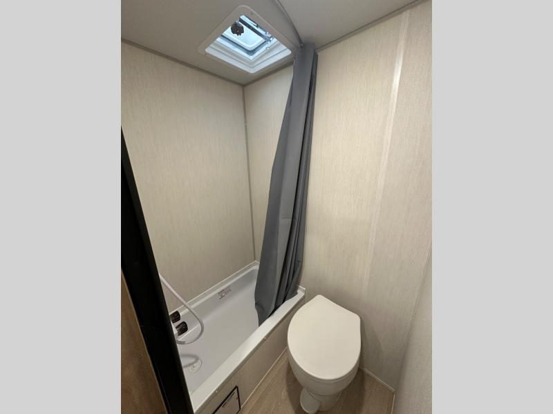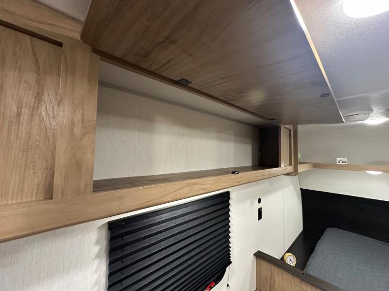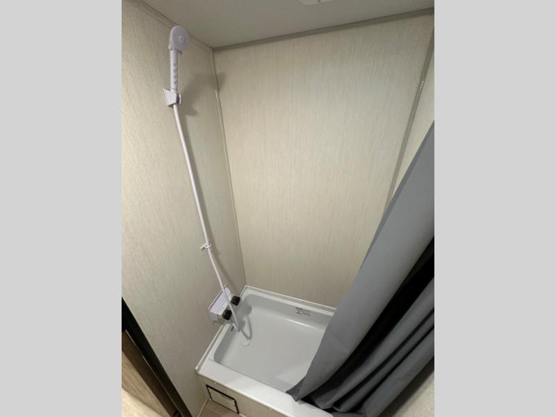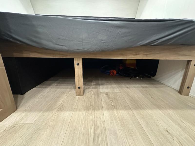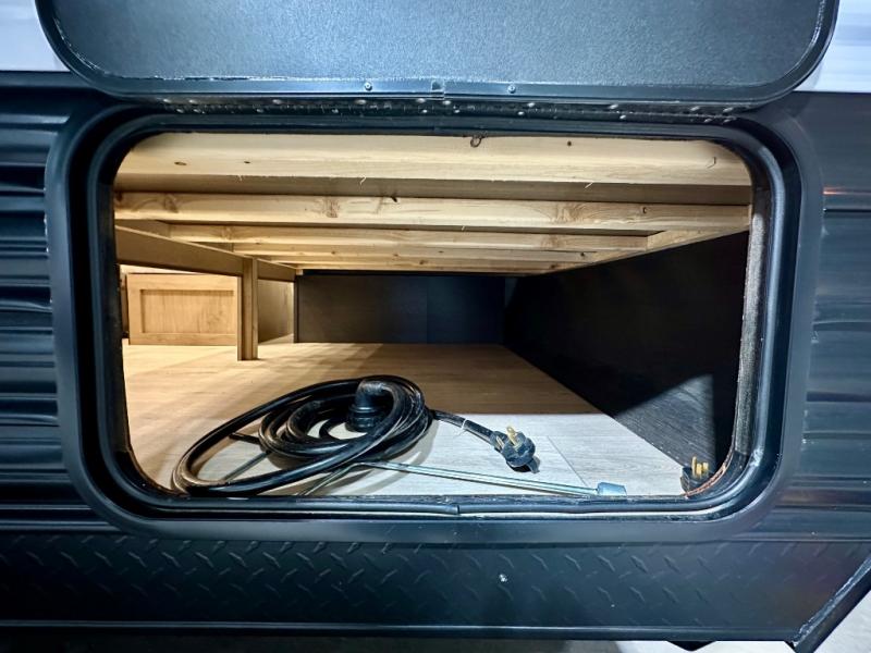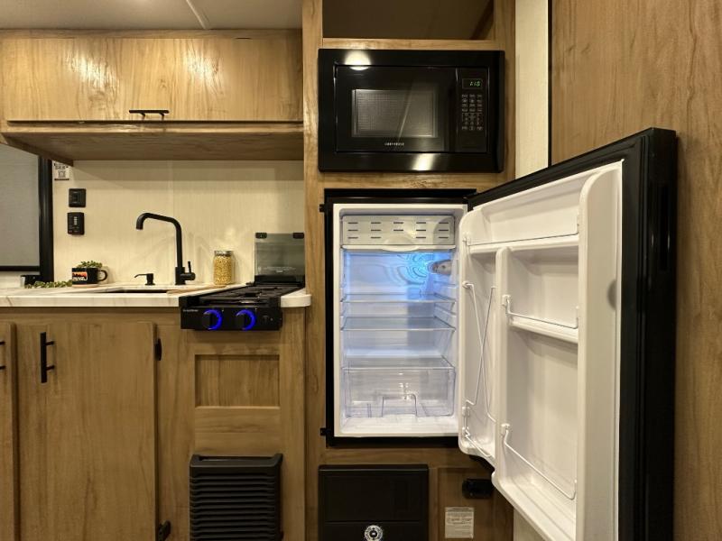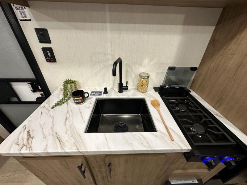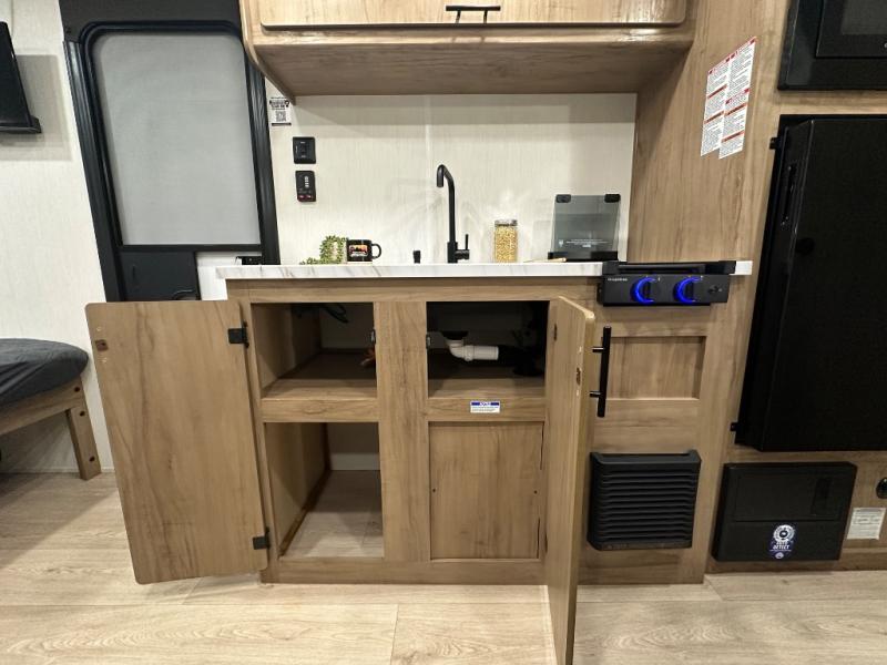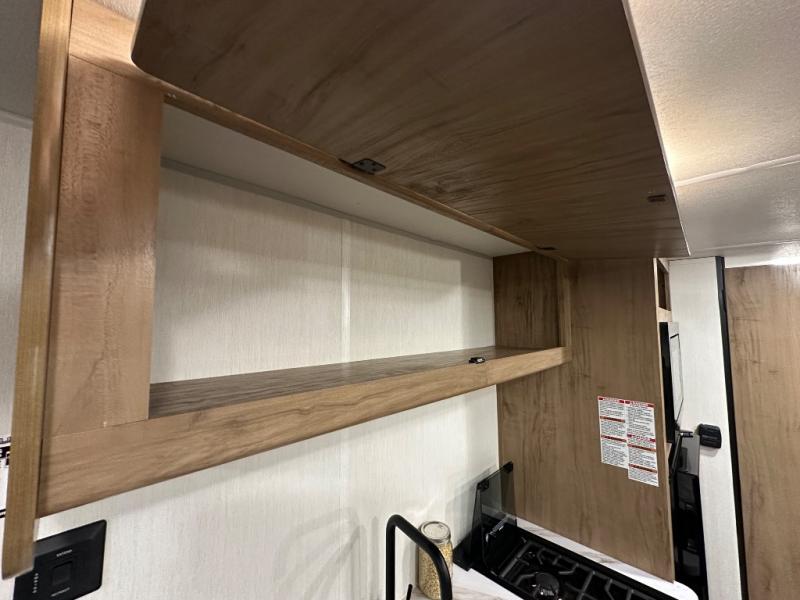 The whole family can sleep comfortably in this travel trailer! It has a set of bunk beds for the kids to sleep on, and you can sleep comfortably on the front queen bed with overhead cabinets and a shelf. The chef will enjoy preparing their best home cooked meals with the high output cooktop, and you can dine at the booth dinette. And the private bath onboard means you won't have to leave your camper in the middle of the night!