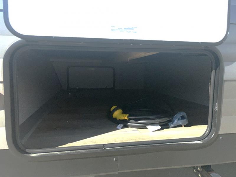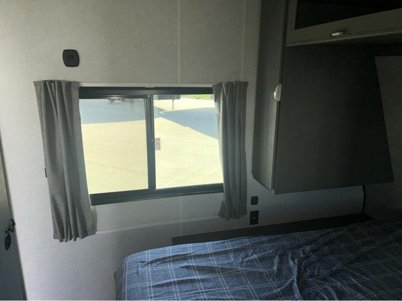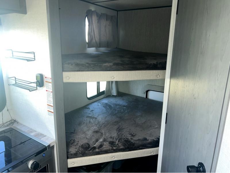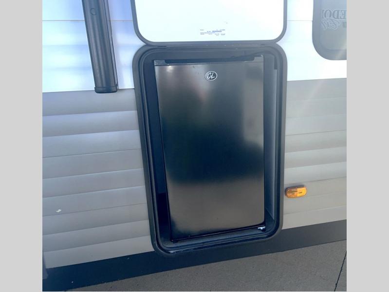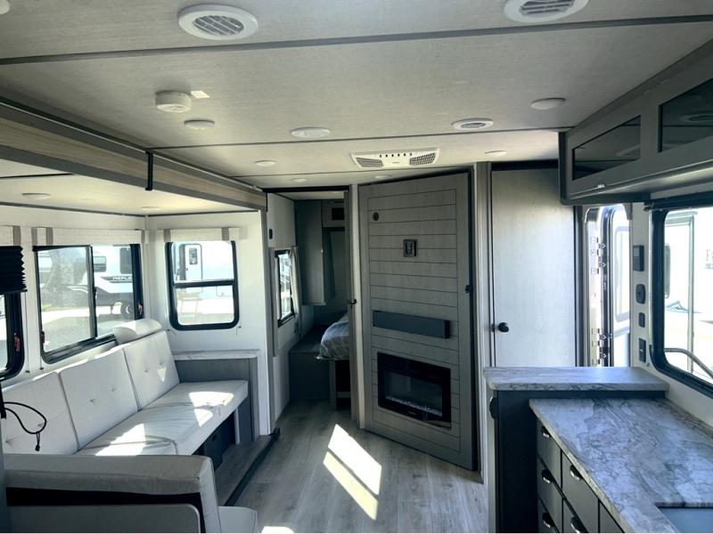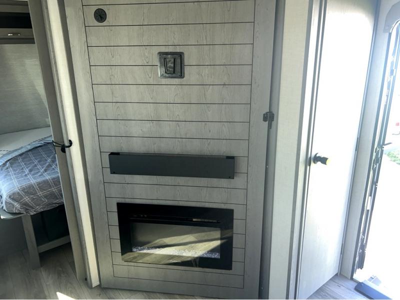 Trips to the lake just got sweeter in this travel trailer with a large slide for more space. Here, you'll find an L-shaped open lounge with a removable table, and the entertainment center with a fireplace will make it feel a little more like home. A full bath with a 36" x 30" shower will let you clean up each day without having to use the camp's facilities, and the double-size bunks with an exterior bike door will let you easily pack gear in. Head up front to enjoy the private bedroom all to yourselves with a king bed and dual wardrobes for wrinkle-free clothes!