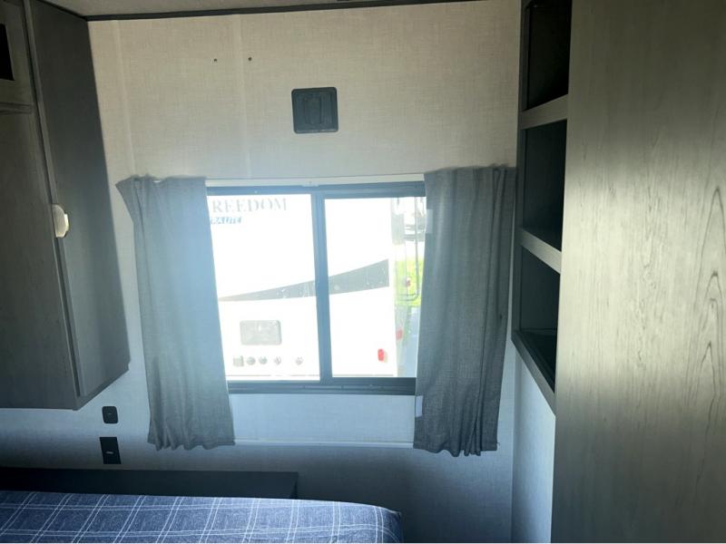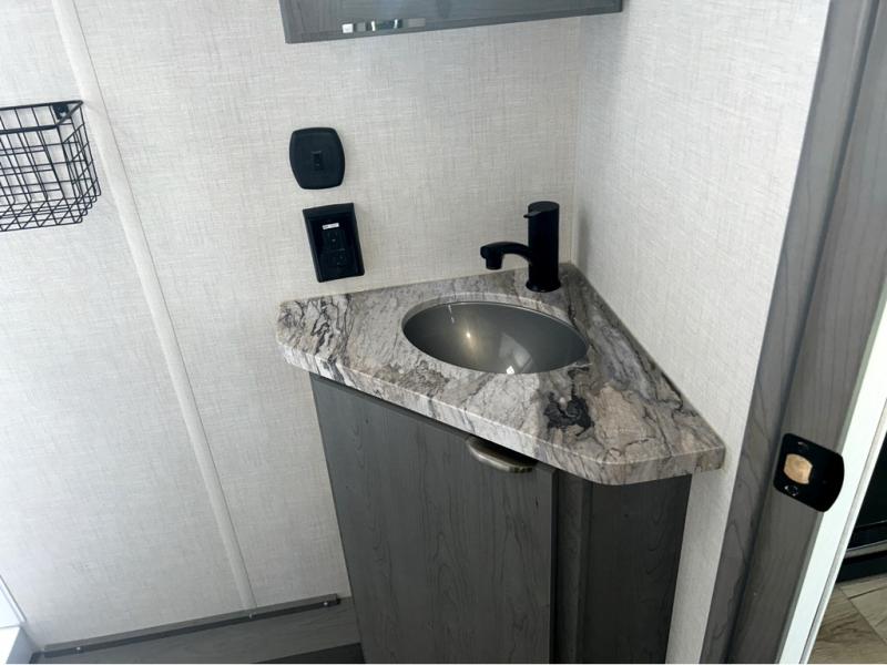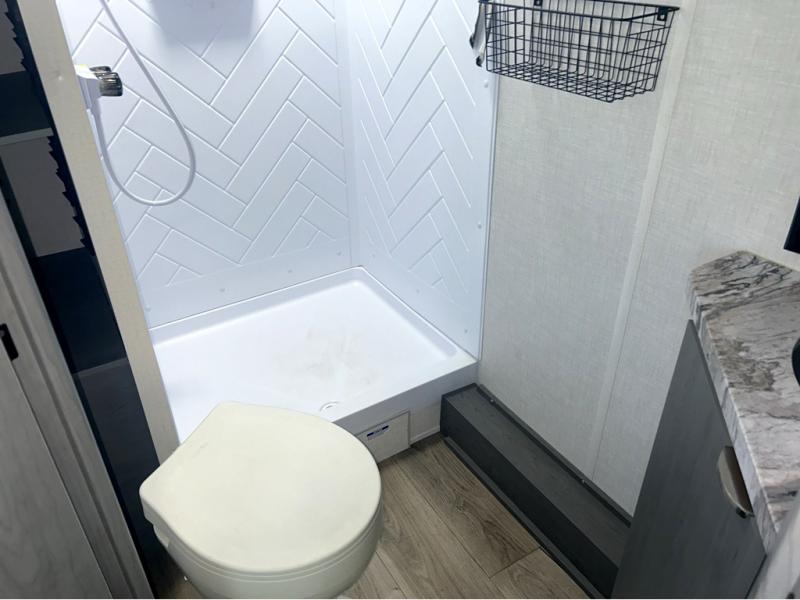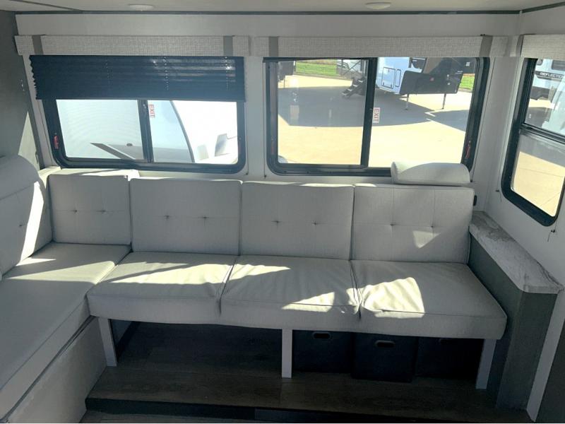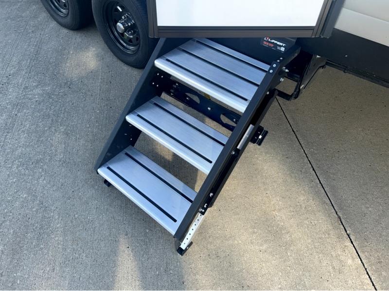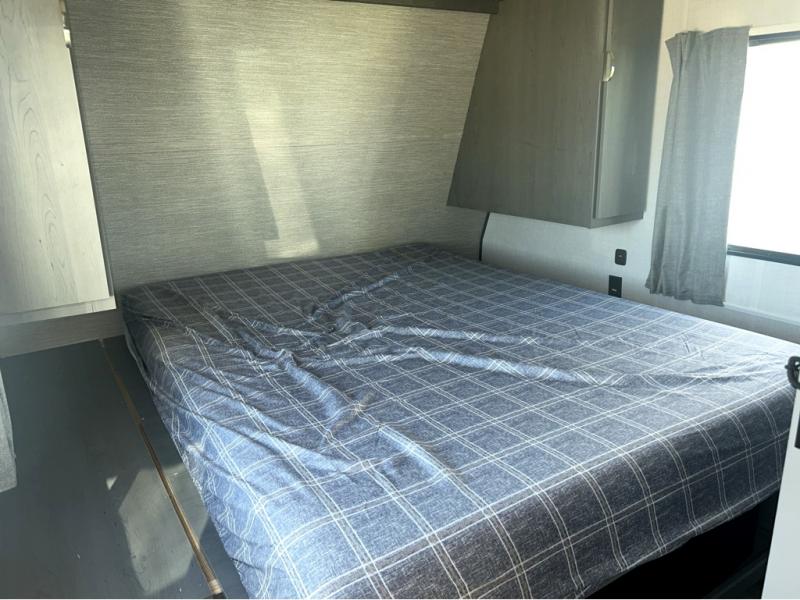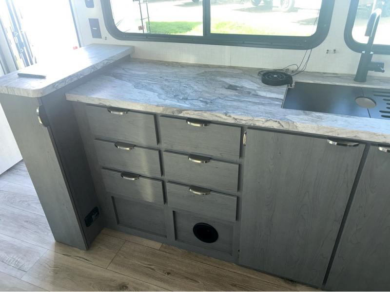 Trips to the lake just got sweeter in this travel trailer with a large slide for more space. Here, you'll find an L-shaped open lounge with a removable table, and the entertainment center with a fireplace will make it feel a little more like home. A full bath with a 36" x 30" shower will let you clean up each day without having to use the camp's facilities, and the double-size bunks with an exterior bike door will let you easily pack gear in. Head up front to enjoy the private bedroom all to yourselves with a king bed and dual wardrobes for wrinkle-free clothes!