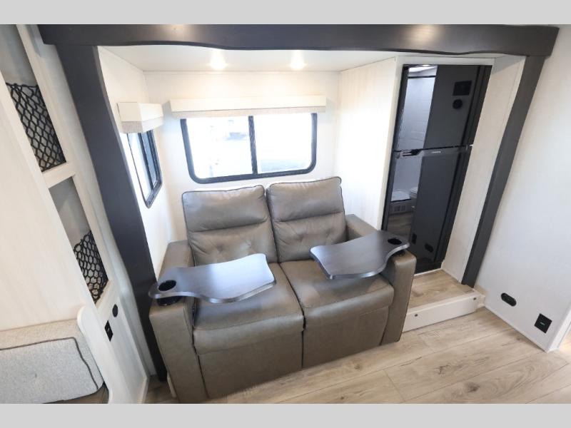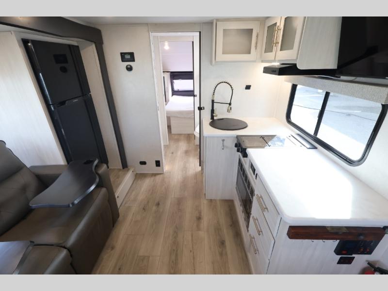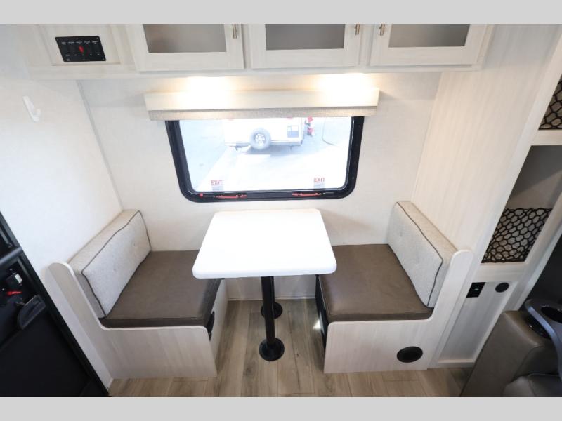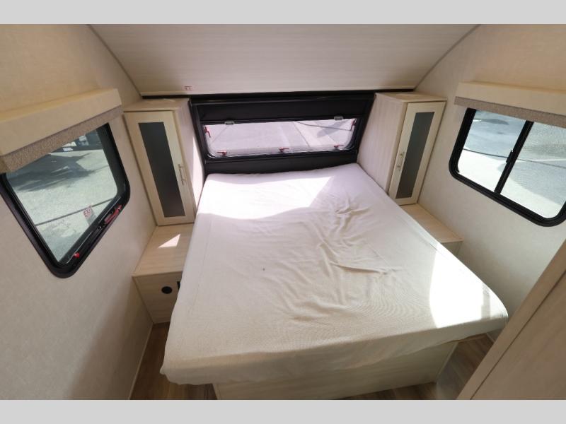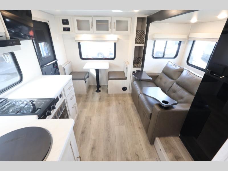 Whether you spend your days at the lake or in the woods, you'll be met with comfort in this spacious travel trailer. There is a rear dinette where you can enjoy your meals together, a 56" theater seat across from a 12V TV, and a slide out for added space. The walk-through bath includes a night light for easy nighttime use, and the front master bedroom includes a queen bed just like at home. There are also dual wardrobes and end tables plus an entertainment center if you want to add a TV. Outside, you'll find a rear accessory hitch, upgraded tires with TPMS, a 14' awning, and a slam latch cargo doors to keep your gear secure.
