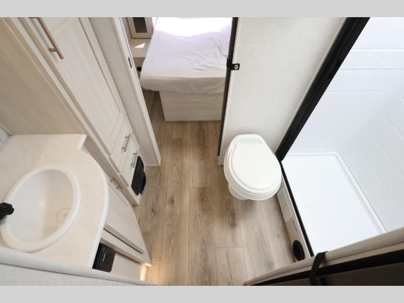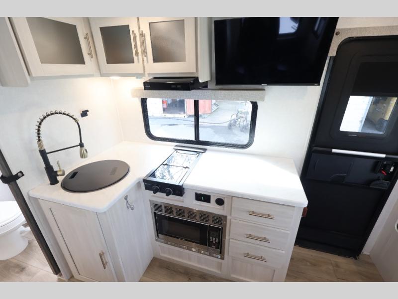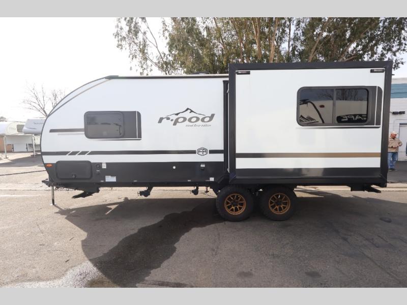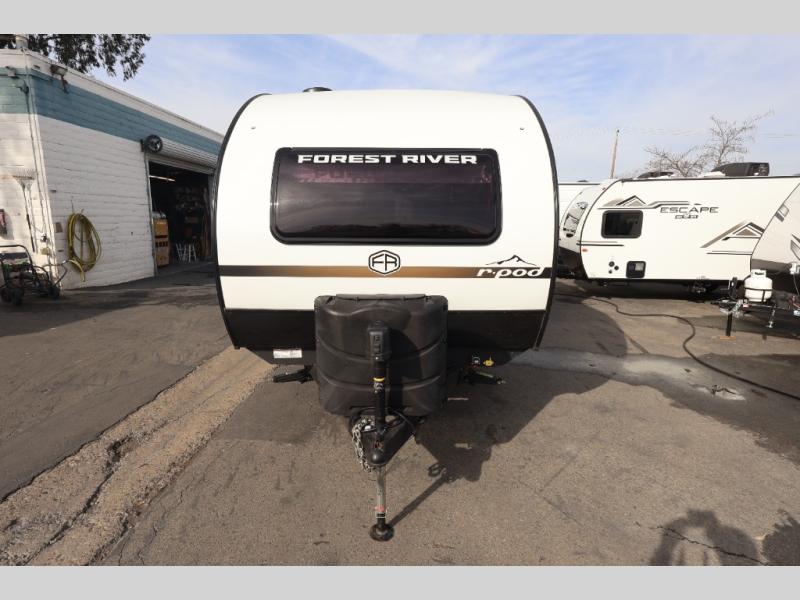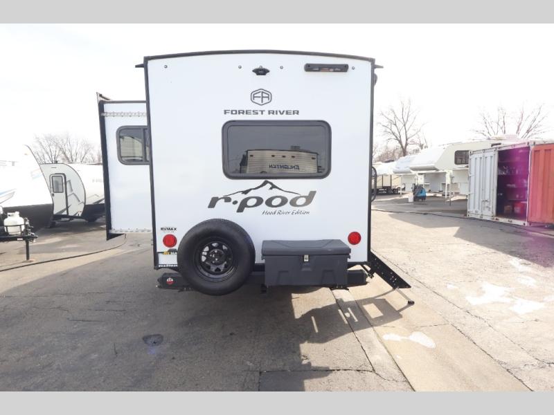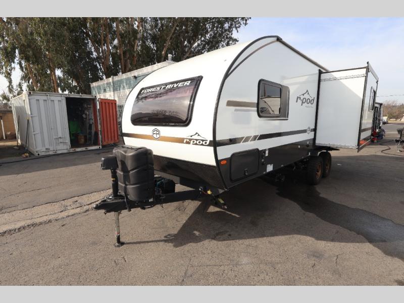With any R-Pod travel trailer by Forest River, you will enjoy affordable luxury at the lowest tow weight in its class! There is a sealed underbelly with forced heat, a curved dual-pane acrylic front window with a bug screen and night shade, plus a large roof mounted solar panel for off-grid capabilities. The 15K A/C unit will keep you comfortable during the summer camping months, and the tankless water heater will provide endless hot showers after hiking, biking, swimming and more! Each model also includes a black glass friction hinge entrance door, roof ladder prep, exterior motion lighting, plus a hot and cold exterior spray port to wash off sand from the beach. Inside, you'll enjoy seamless Surf-X kitchen countertops, blackout roller shades, and a central vacuum system for hassle-free cleaning!