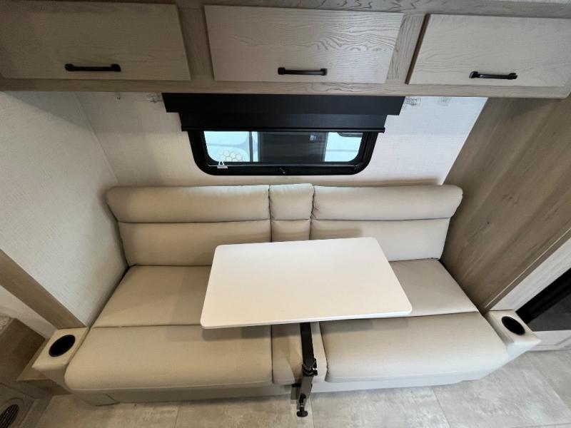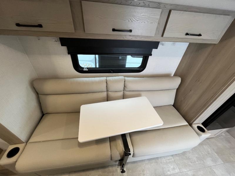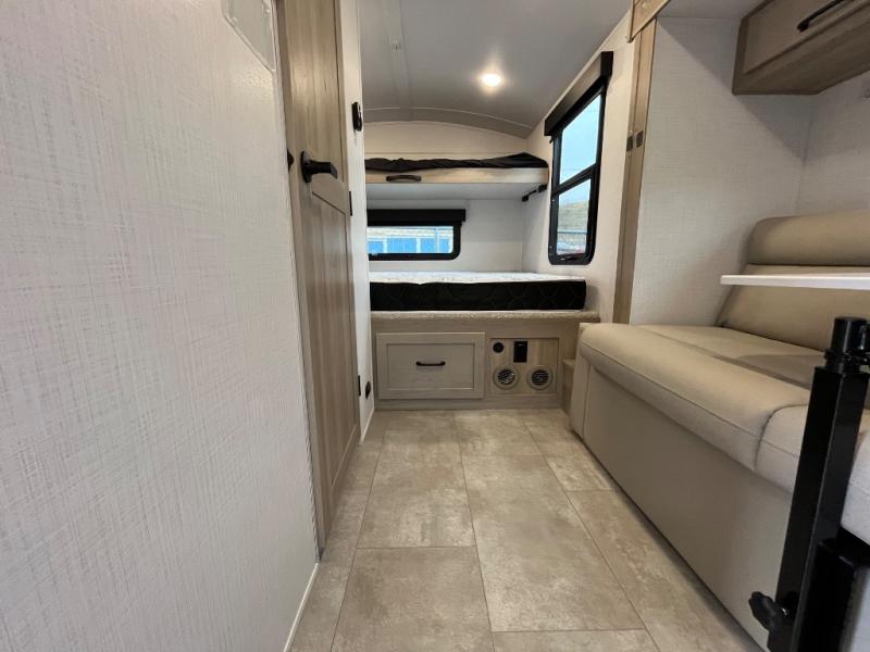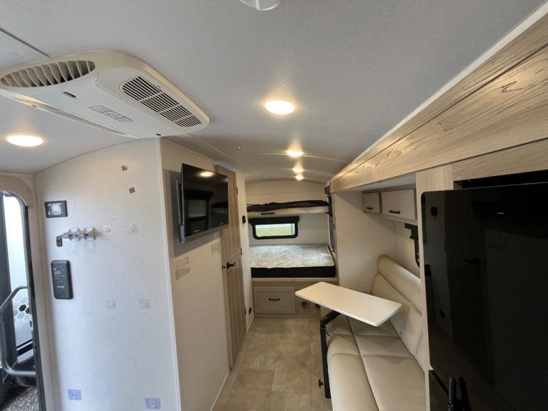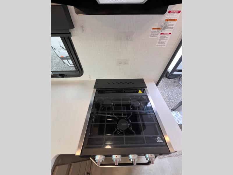 Are you looking for a lightweight trailer with at-home comforts? Take a look at this single slide out unit that can sleep three to four each night. There is a queen-size bed in the back with a 26" x 80" flip-up bunk for cozy sleeping space, a 72" sofa with cupholders to relax on, plus a 32" 12V TV for movie nights! The front kitchen includes a 12V refrigerator to store food, plus a microwave oven and a gas oven to cook meals each day.