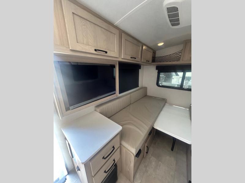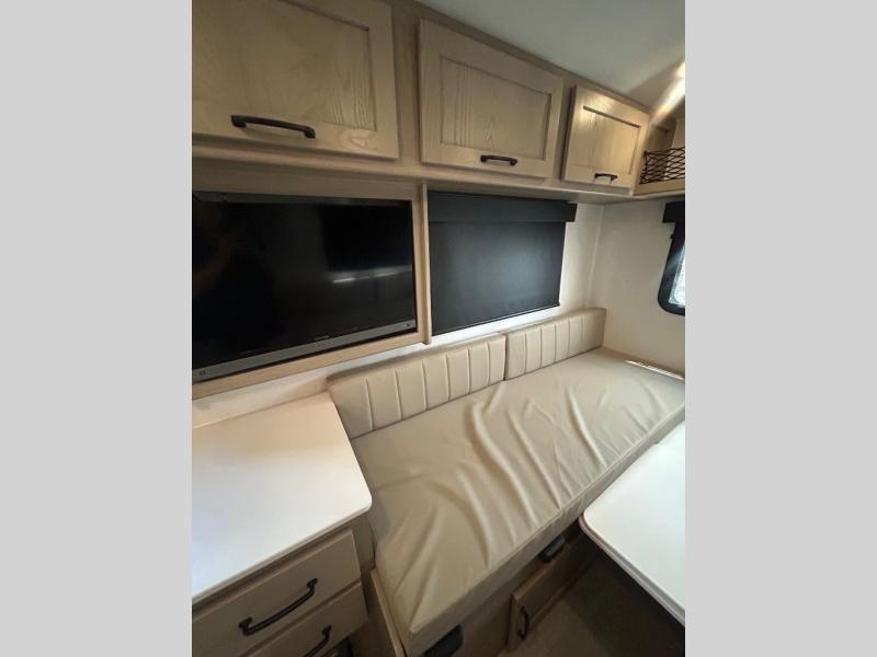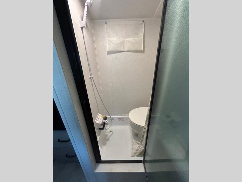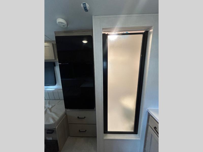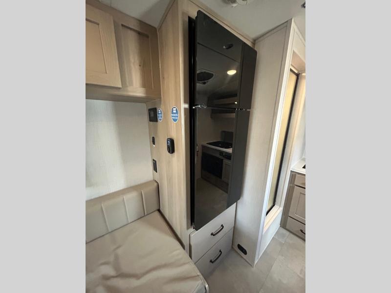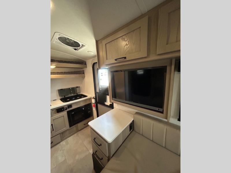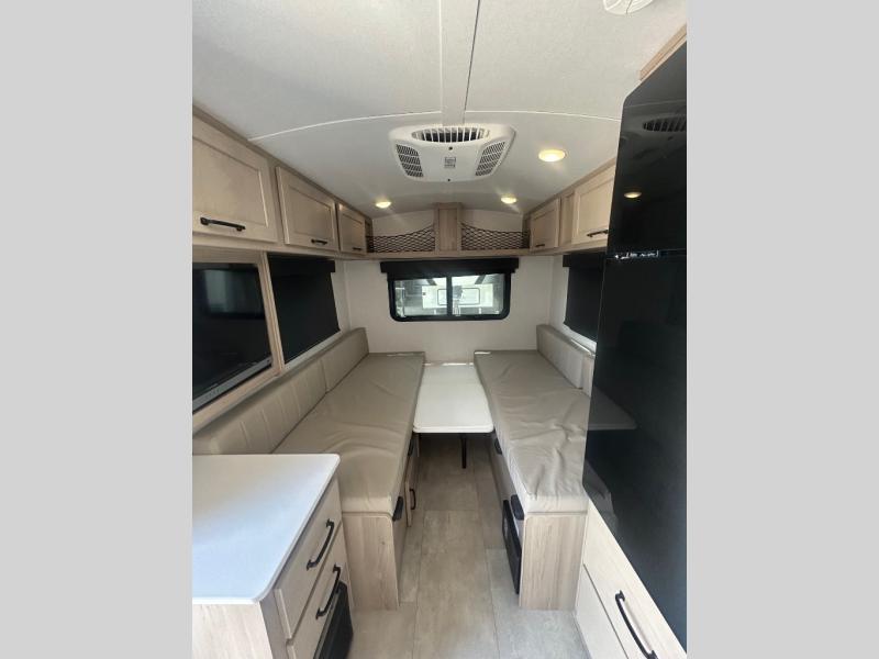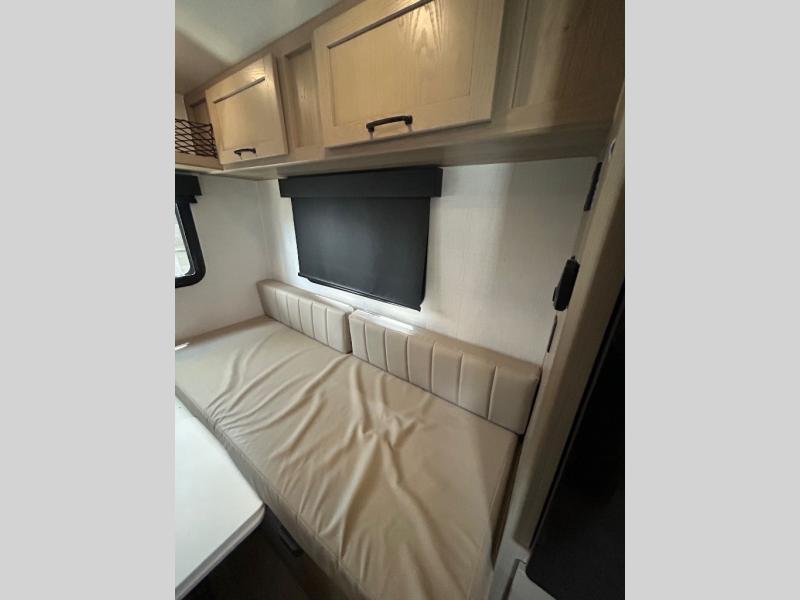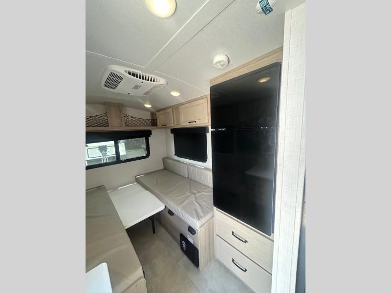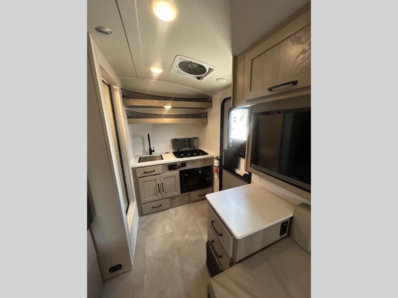 It won't be hard to find comfort in this travel trailer. It may be smaller on size, but it doesn't skim on features. The twin beds convert to a king-size bed for your comfort, and there is even a 32" 12V TV to enjoy in the evenings. The kitchen includes a three burner cooktop, a convection microwave, plus a 12V refrigerator for perishables. You'll find overhead compartments for your valuables and exterior storage for your hiking gear!
