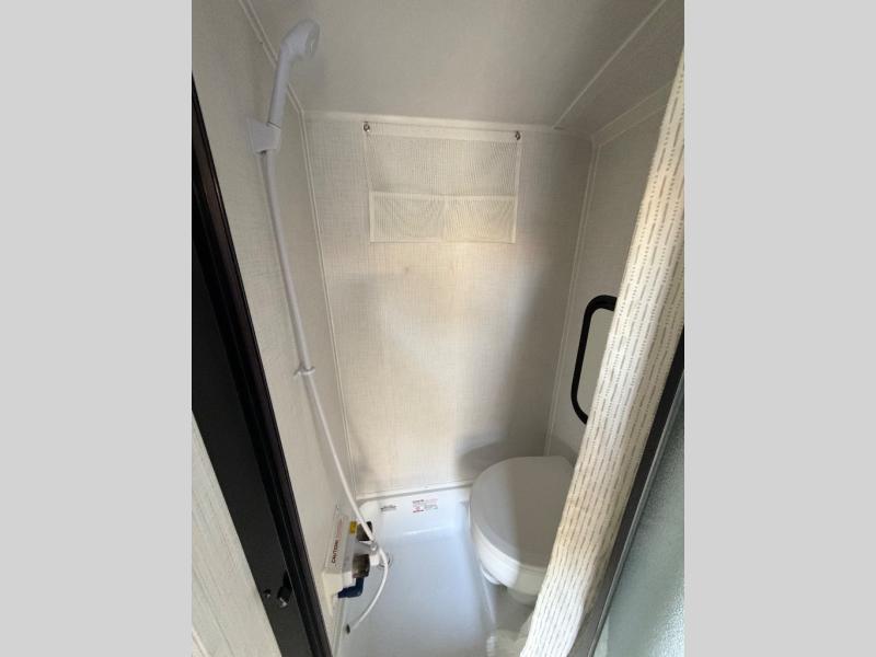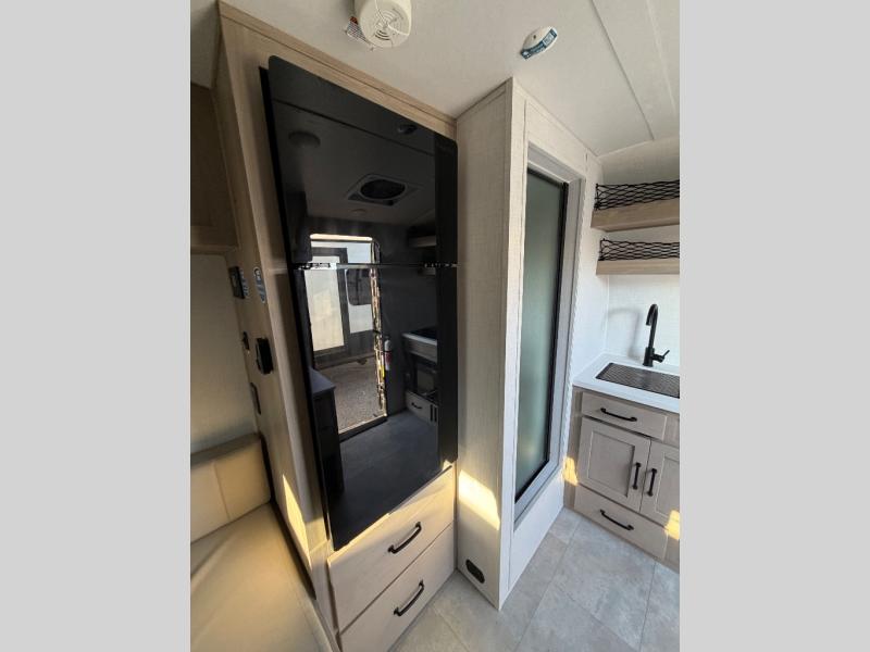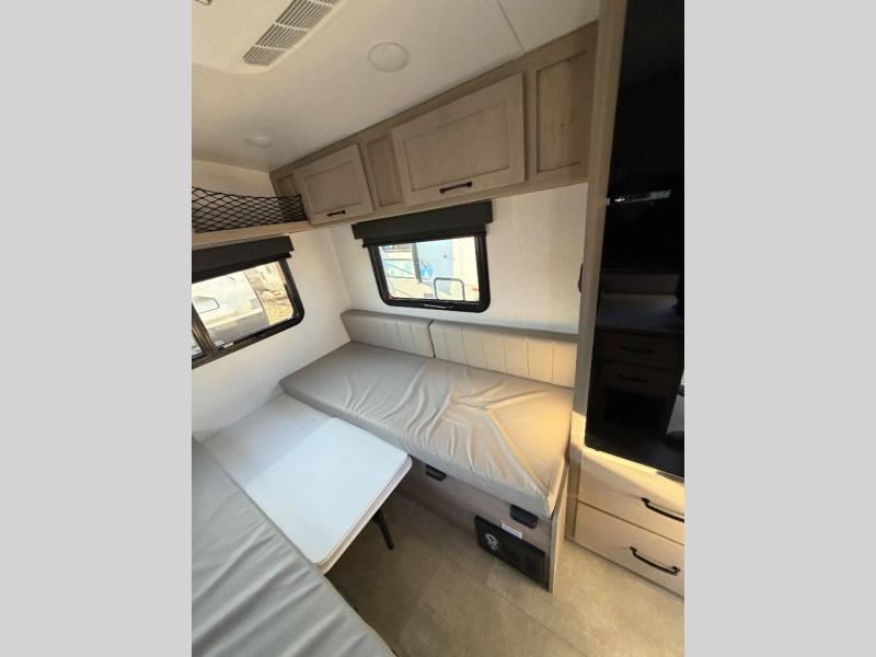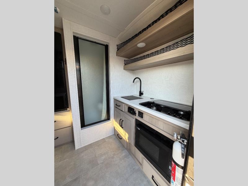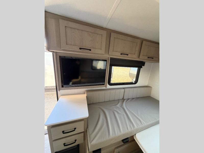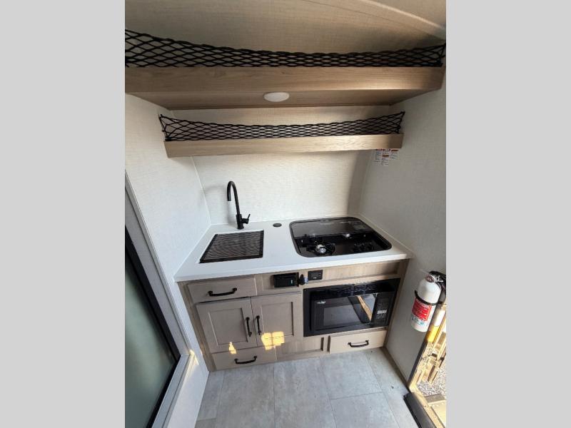 It won't be hard to find comfort in this travel trailer. It may be smaller on size, but it doesn't skim on features. The twin beds convert to a king-size bed for your comfort, and there is even a 32" 12V TV to enjoy in the evenings. The kitchen includes a three burner cooktop, a convection microwave, plus a 12V refrigerator for perishables. You'll find overhead compartments for your valuables and exterior storage for your hiking gear!