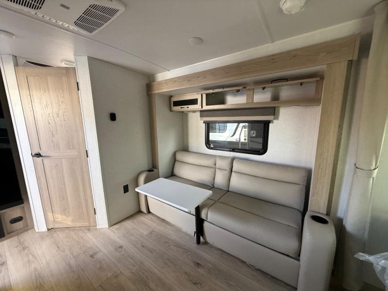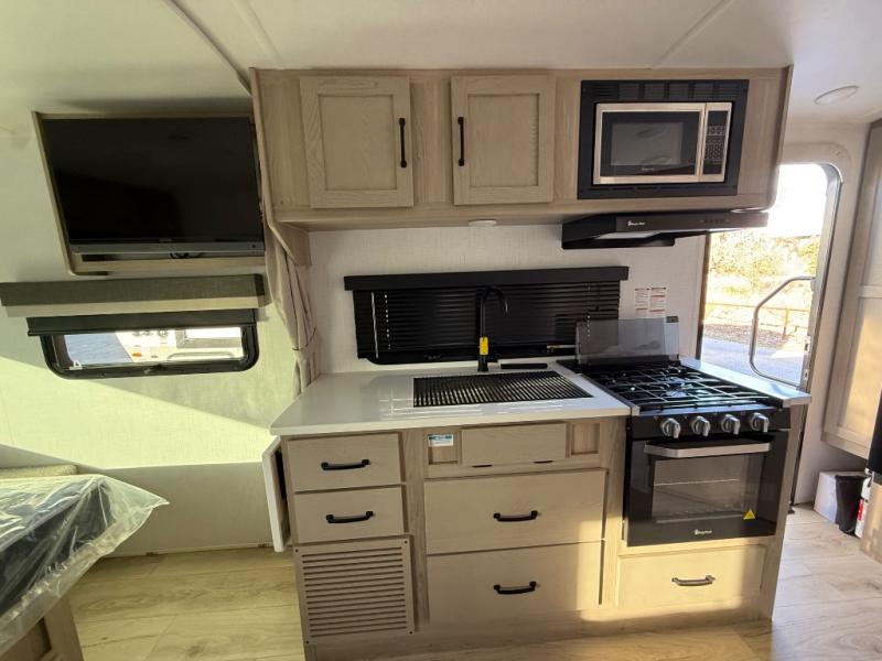 Wherever you decide to camp, you will love every minute in this cute couple's trailer. The sofa slide with a table will provide a place to relax, eat, and even sleep an extra guest if you have one, and the front RV queen bed includes a privacy curtain to enjoy your own space. There are dual bedroom wardrobes to keep your clothes tidy, and you'll find two pass-through storage compartments for your larger gear. An outside griddle with an LP hookup will allow you to make breakfast outdoors, and there is a three burner cooktop indoors if the weather isn't cooperating. Since there is a full bath on board you won't have to use the camp's facilities, and you can make it a movie night with the 32" TV in the main living area!