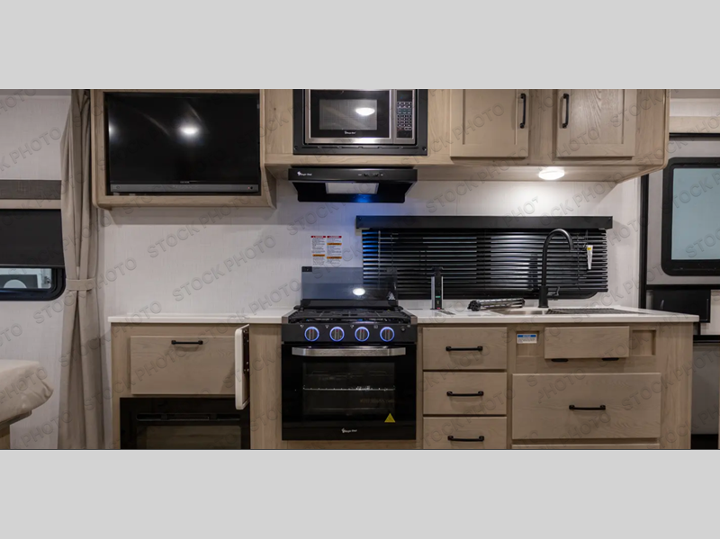 Enjoy the camping season with your spouse, friend, or significant other in this cozy travel trailer for two. Each morning, you can have your coffee on the 67" theater seats with a table within the slide out, then head outdoors to make pancakes on the outdoor griddle with an LP hookup. The interior kitchen includes a three burner cooktop, a microwave oven, plus a 12 volt refrigerator for perishables. An entertainment center with a fireplace will make your space feel more like home, and what's better than sleeping on your own queen bed with dual bedroom wardrobes for your clothes!?