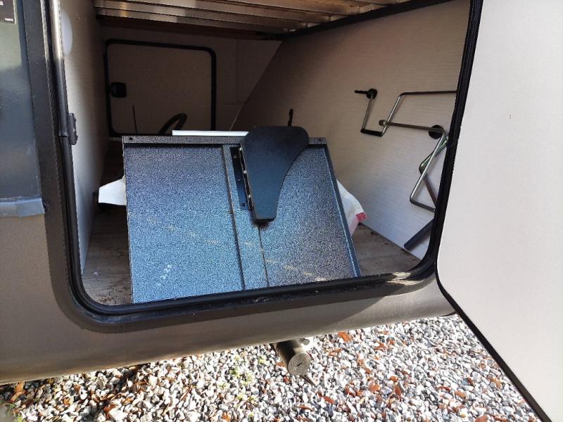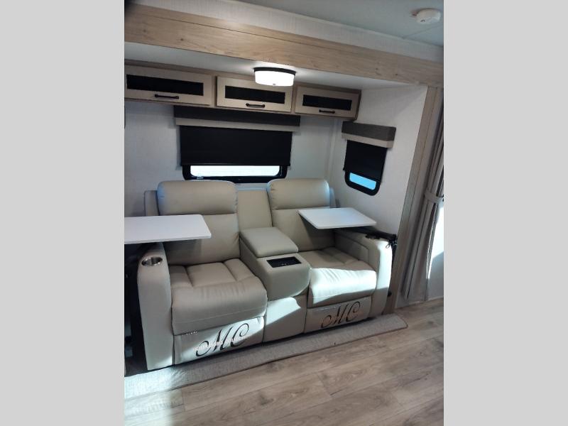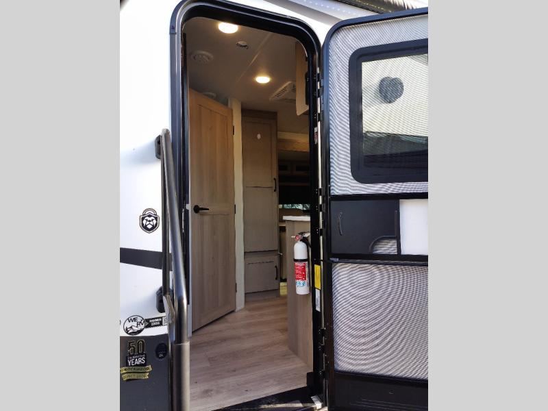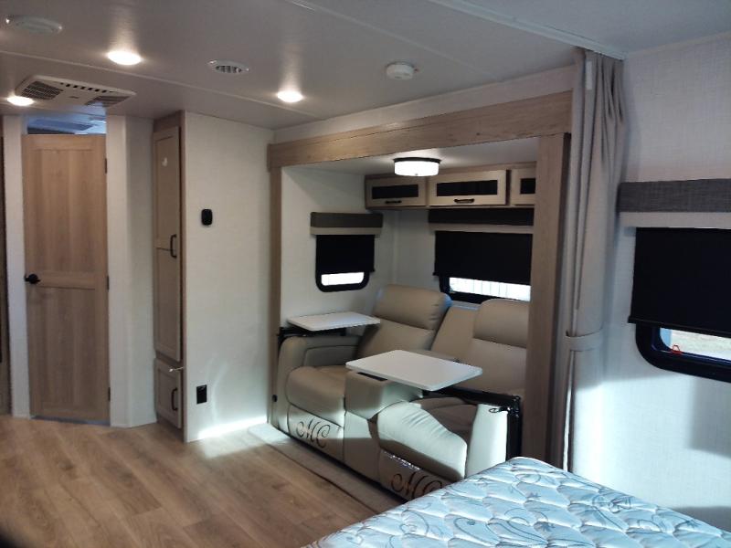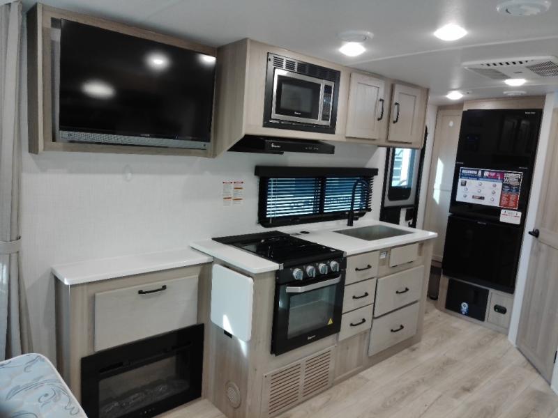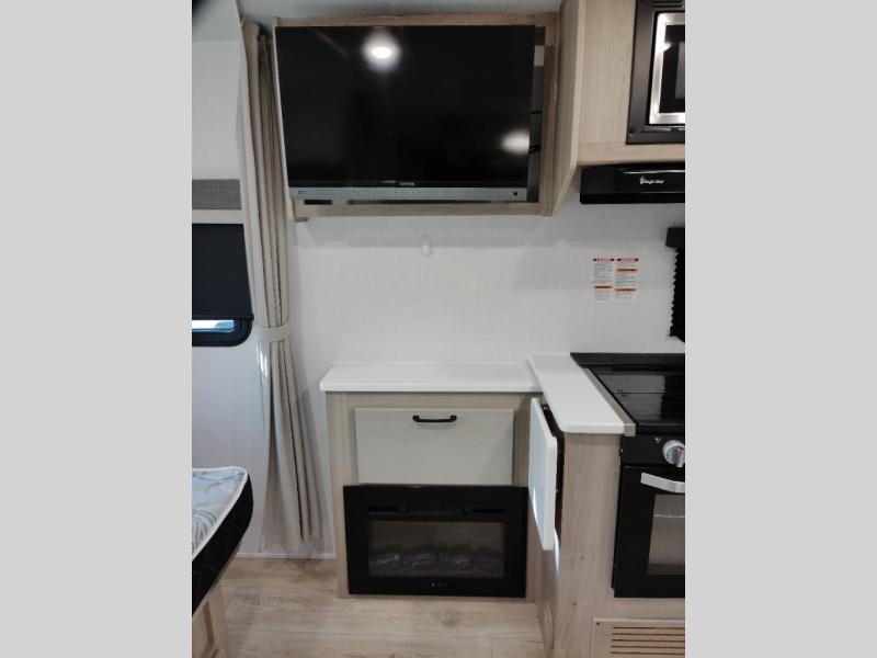 Enjoy the camping season with your spouse, friend, or significant other in this cozy travel trailer for two. Each morning, you can have your coffee on the 67" theater seats with a table within the slide out, then head outdoors to make pancakes on the outdoor griddle with an LP hookup. The interior kitchen includes a three burner cooktop, a microwave oven, plus a 12 volt refrigerator for perishables. An entertainment center with a fireplace will make your space feel more like home, and what's better than sleeping on your own queen bed with dual bedroom wardrobes for your clothes!?