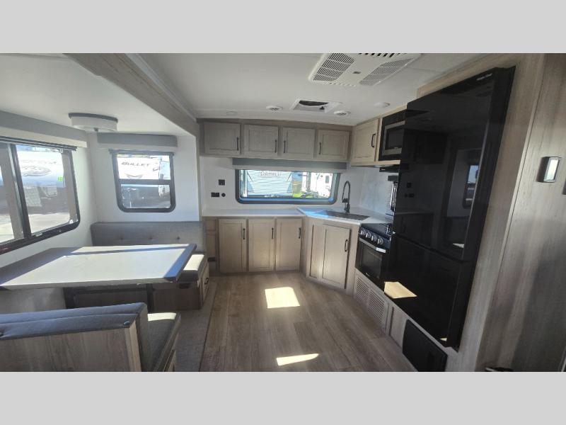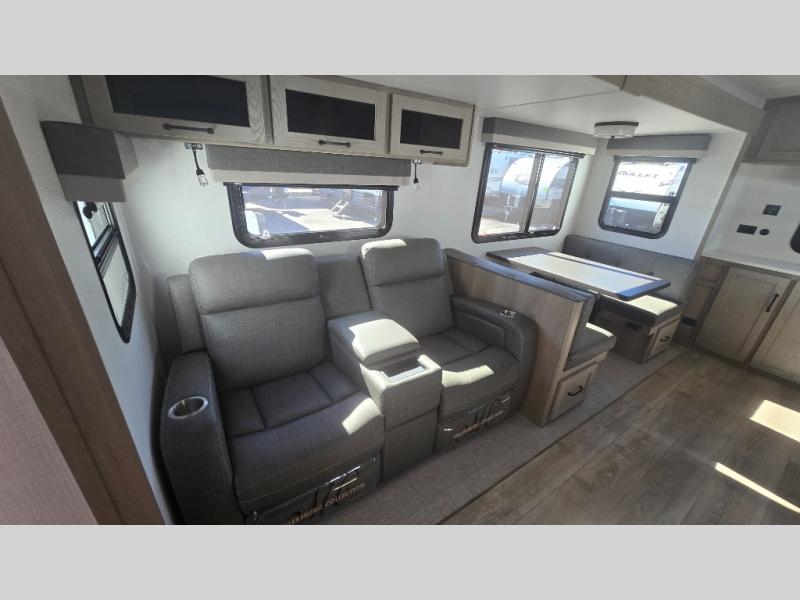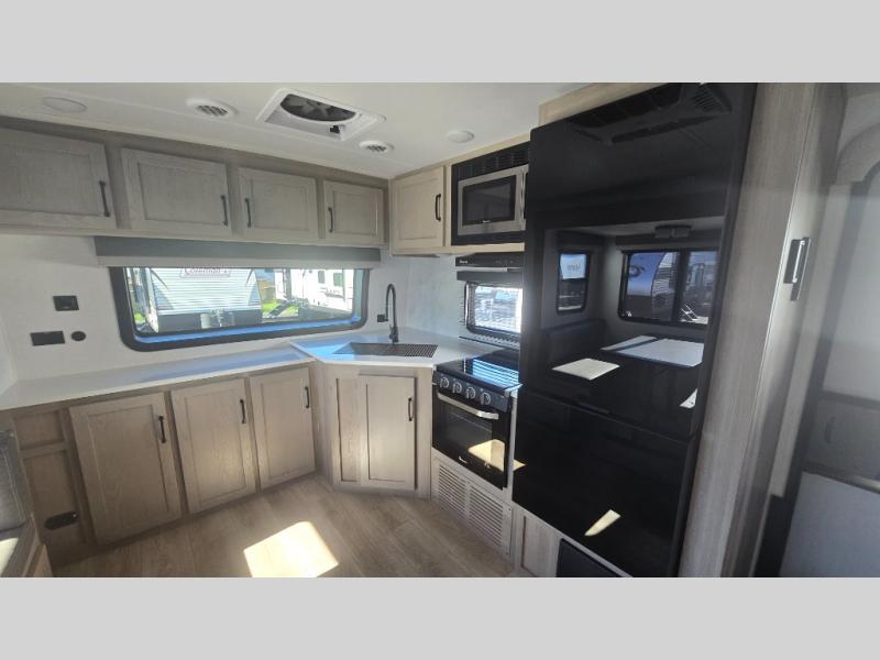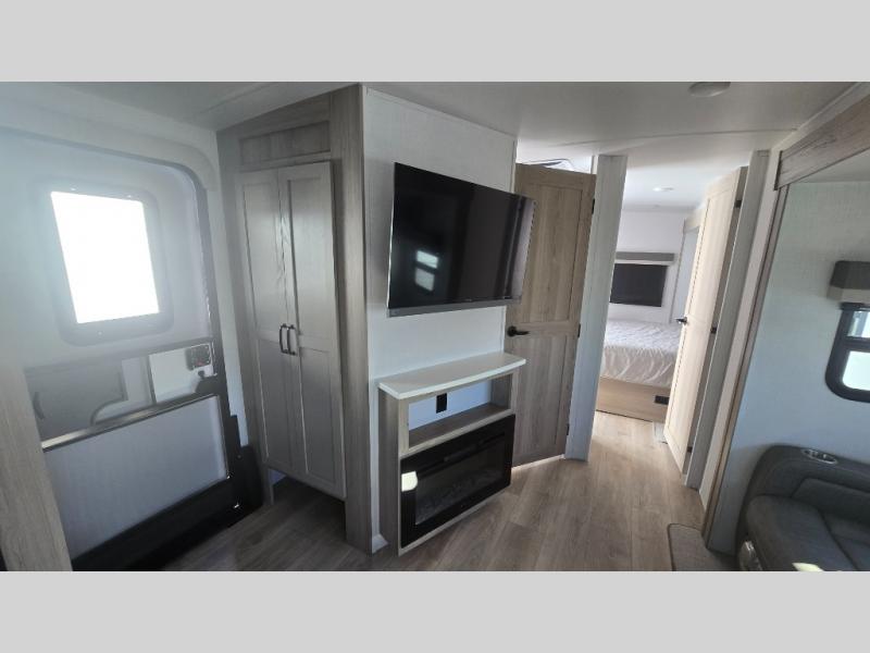 When you are outside this trailer you can enjoy the protection from the 21' power awning, and whip up a meal using the outside griddle. You will find exterior storage for your extra gear, and a ladder at the rear. You get to choose which entrance to step up into, be it the spacious rear bedroom with a queen bed slide and a wardrobe, or the main entry into the kitchen and living area. The furniture slide includes a booth dinette to eat your meals at, and theater seating to watch the Smart TV with a fireplace below. And the cook will love the front kitchen with extra counter space, a three burner range, plus a 12V refrigerator and pantry for food storage!