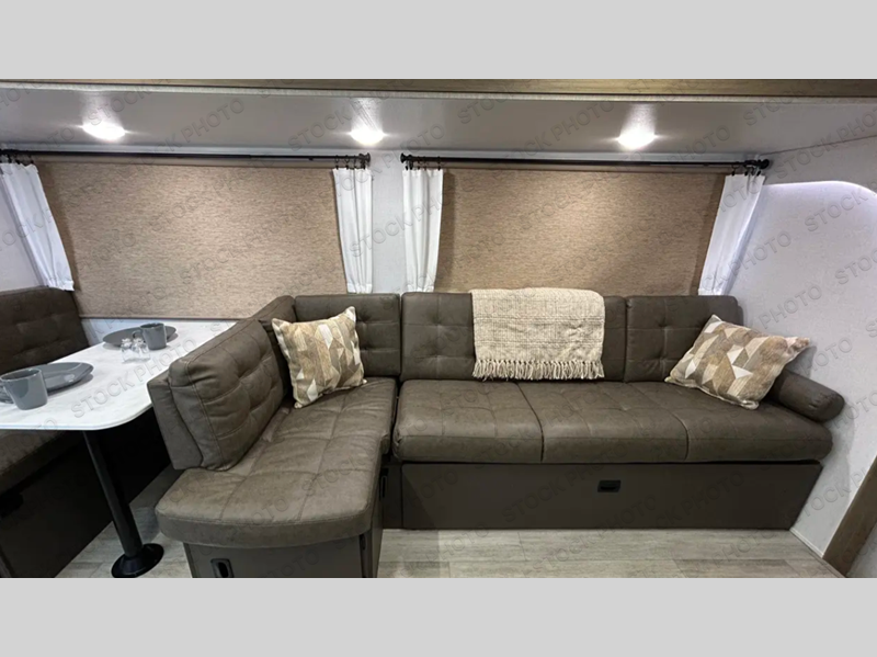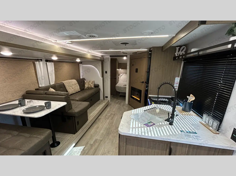 You're sure to make camping memories in this spacious travel trailer! You can sleep four to five people each night thanks to the the custom king bed with Versa Tilt in the front bedroom plus the Versa-Lounge and booth dinette within the large slide out! The full kitchen will let you make meals each day, and you'll appreciate the hidden pantry with shelves behind the fireplace. And don't overlook the full rear bath, complete with a tub/shower and ample counter space for your things.