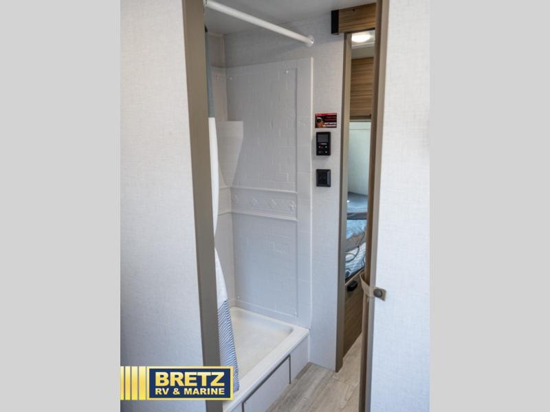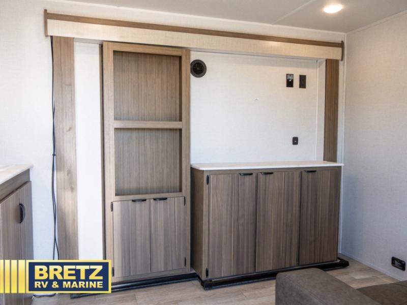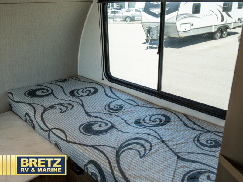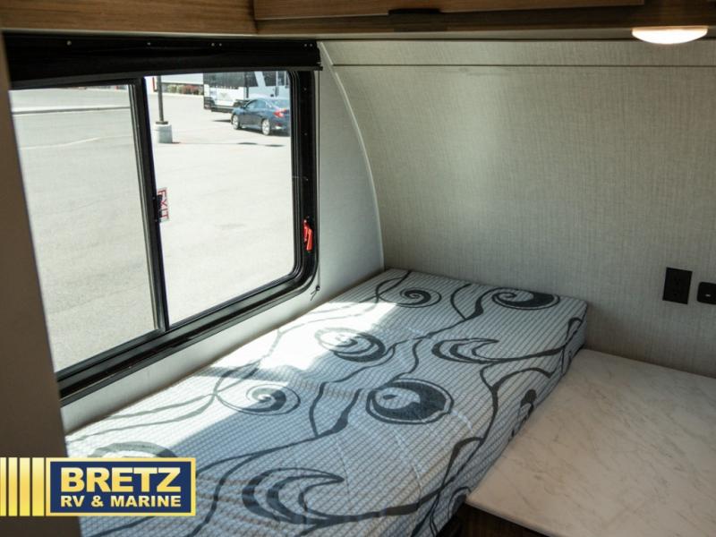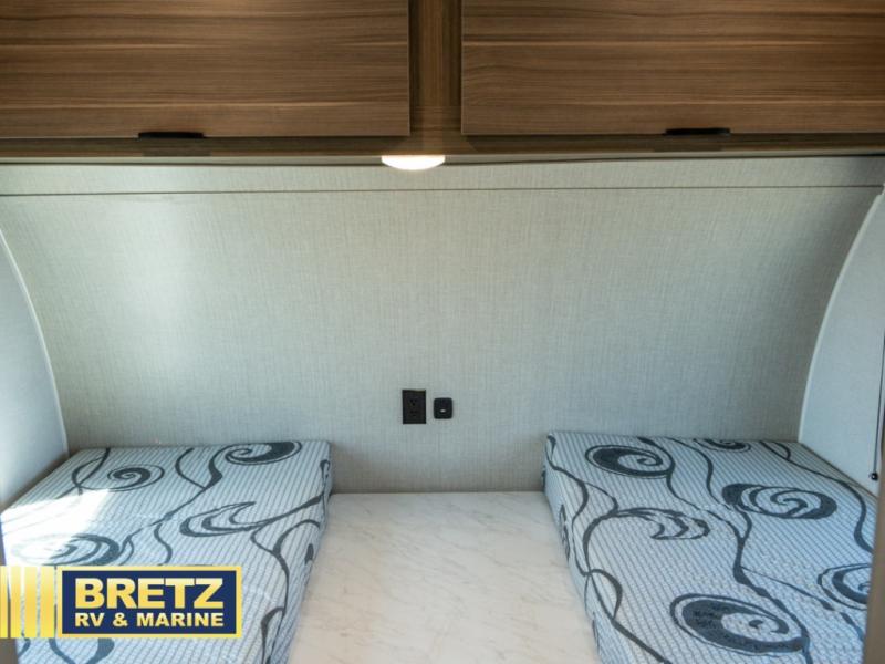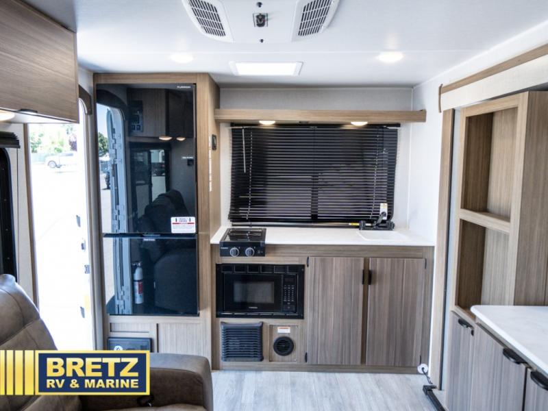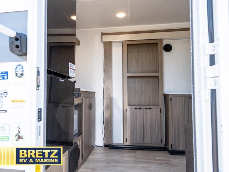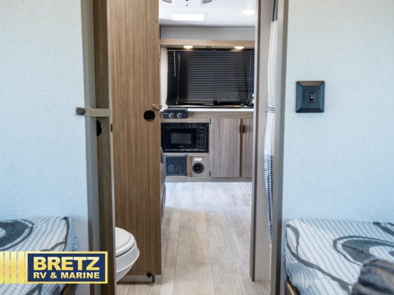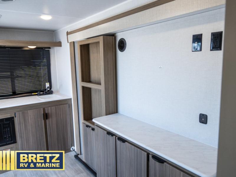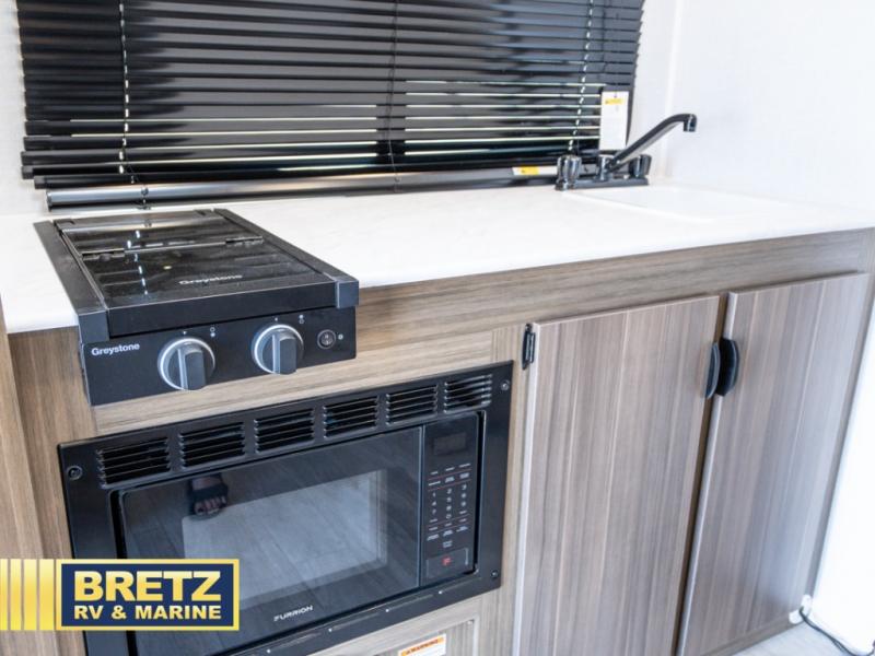 This compact travel trailer features a front bedroom with twin beds, or you can convert them to a king-size bed, depending on your needs. The slide out in the main living area features a split bunk bed hidden behind a spice door. There is also theater seating here for a place to relax, and everyone will have easy access to the walk-thru bath. And don't overlook the rear kitchen with all the appliances needed to create your best meals!