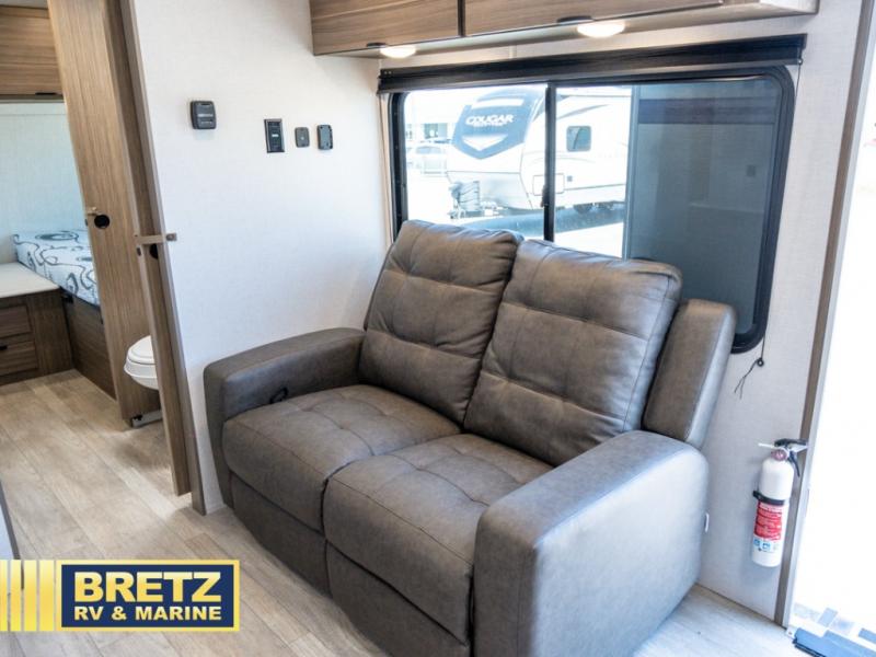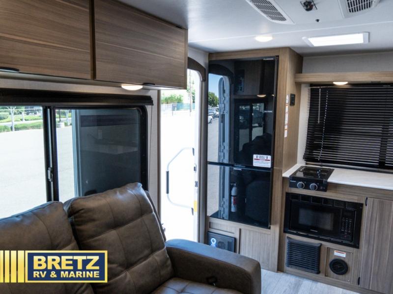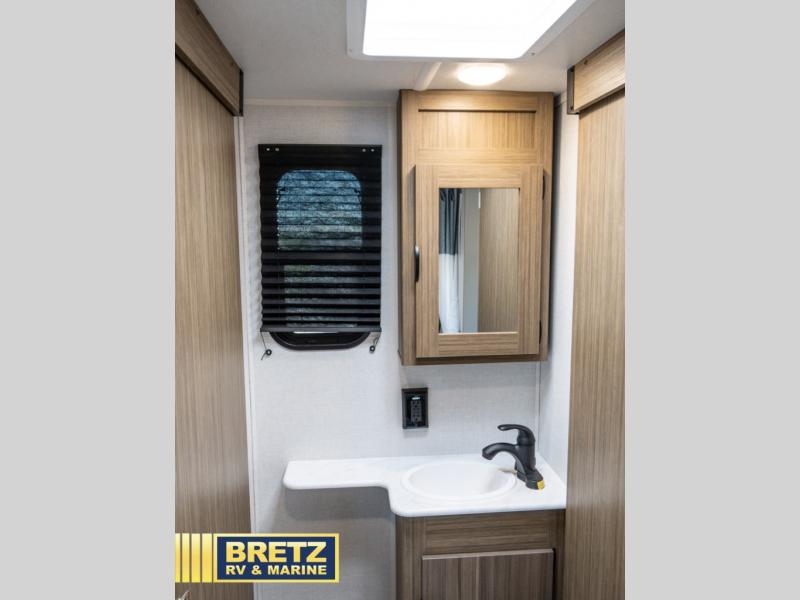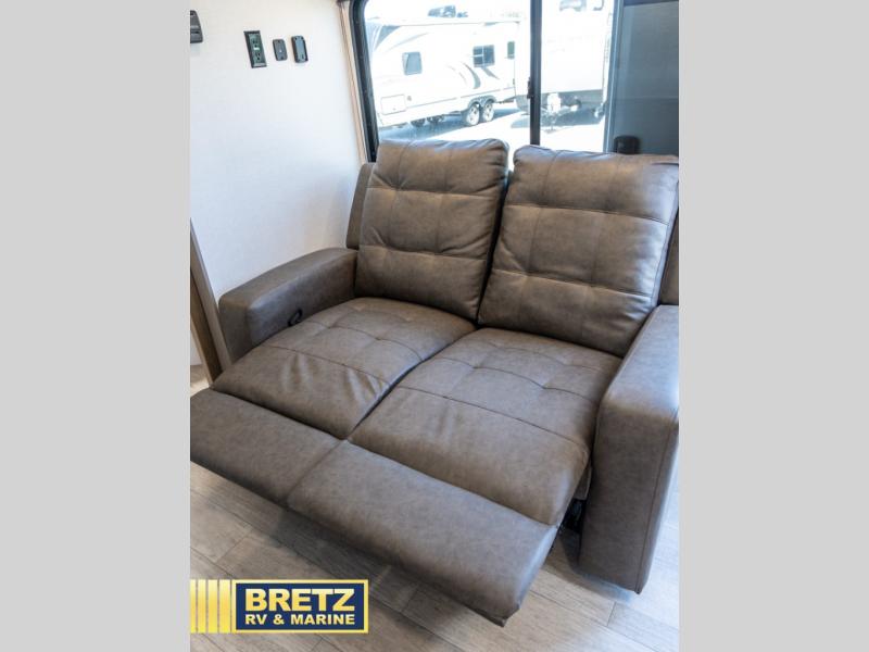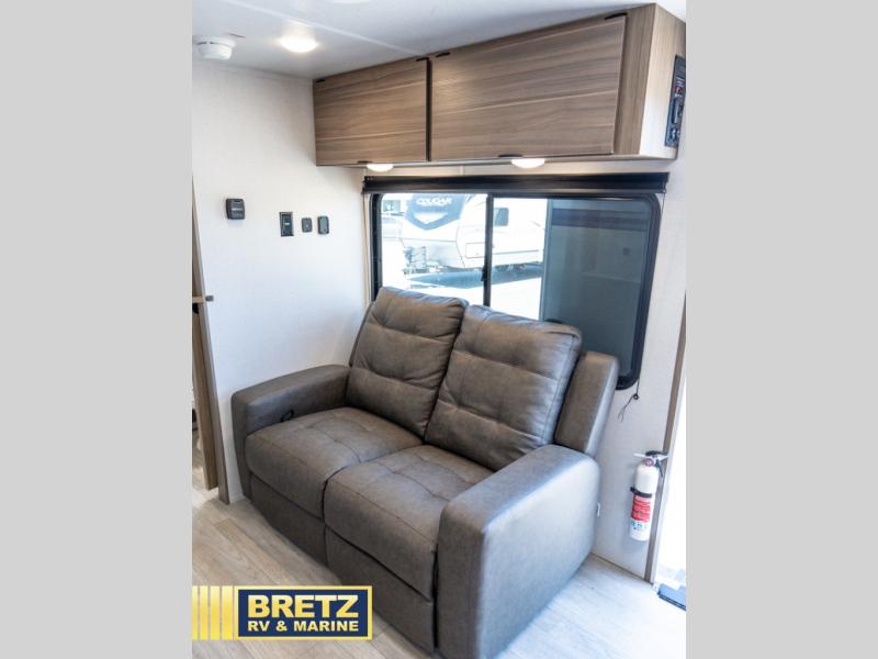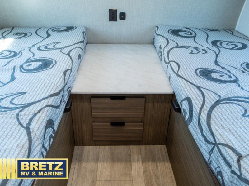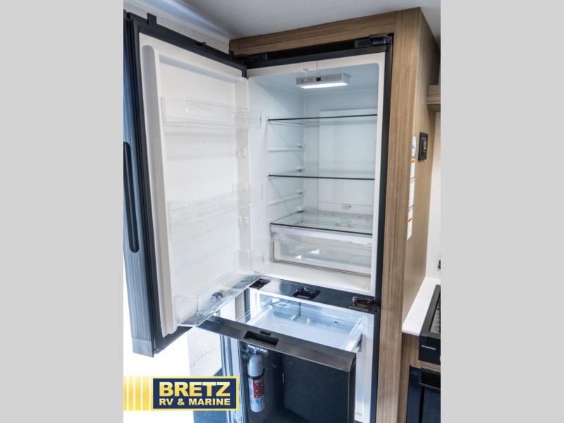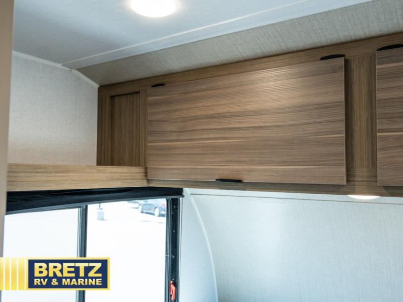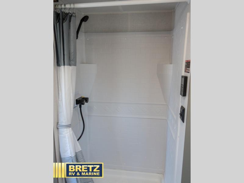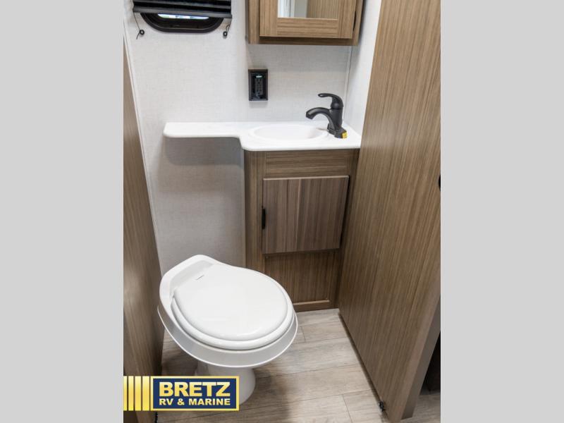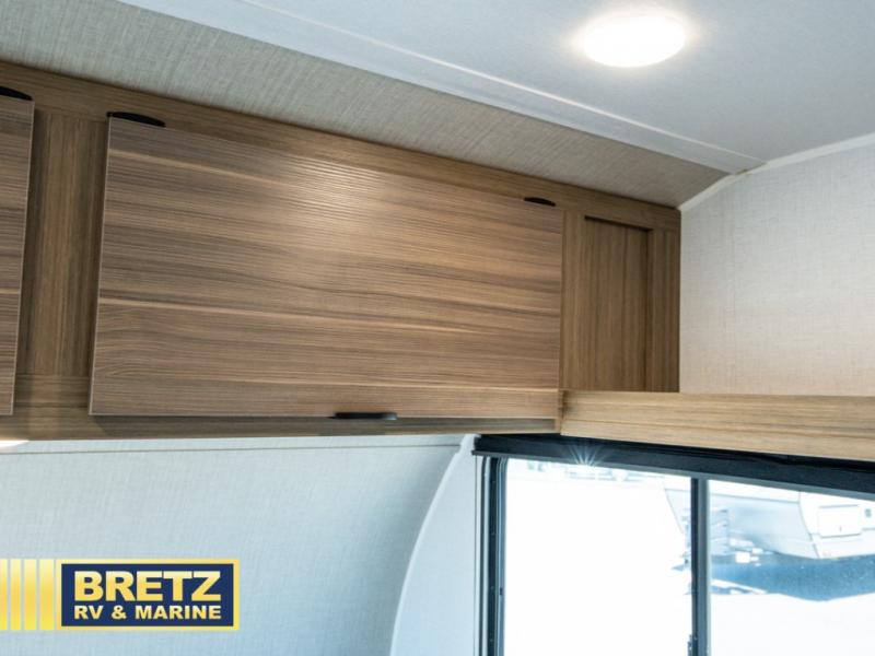 This compact travel trailer features a front bedroom with twin beds, or you can convert them to a king-size bed, depending on your needs. The slide out in the main living area features a split bunk bed hidden behind a spice door. There is also theater seating here for a place to relax, and everyone will have easy access to the walk-thru bath. And don't overlook the rear kitchen with all the appliances needed to create your best meals!