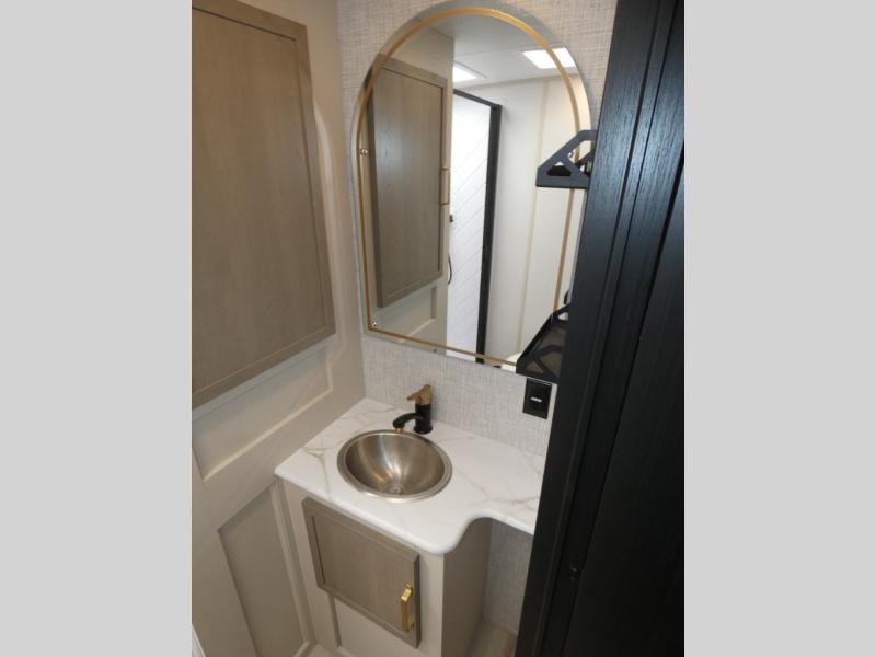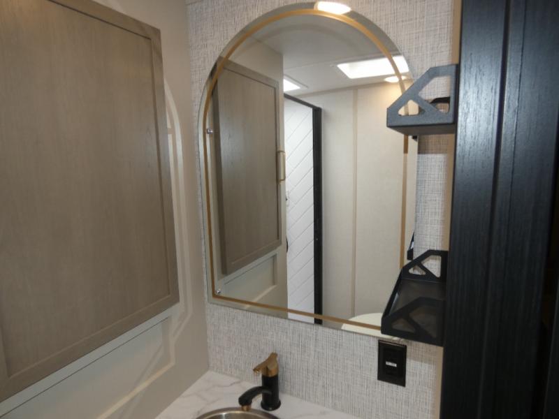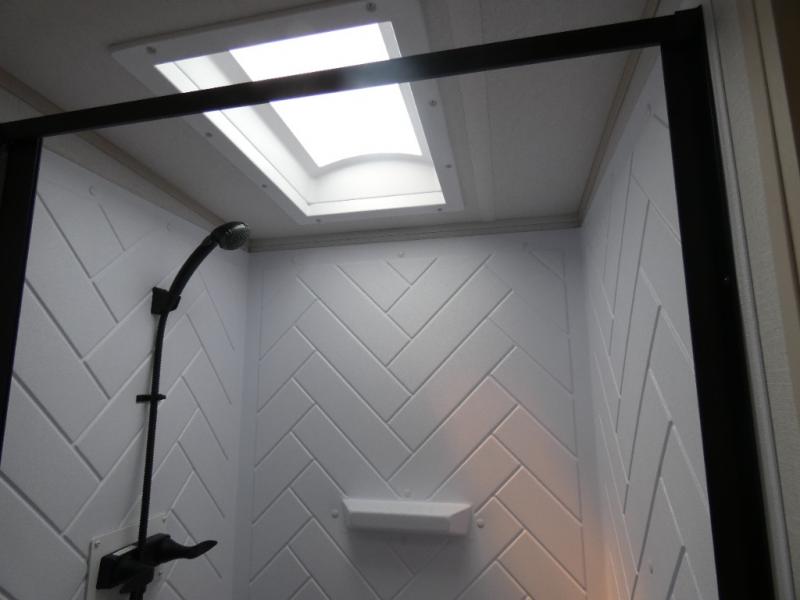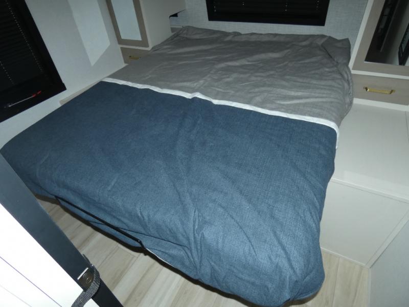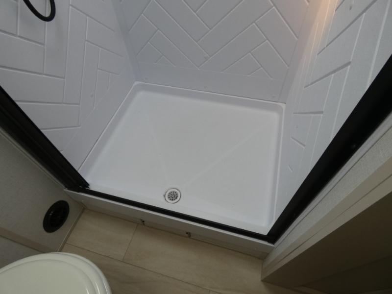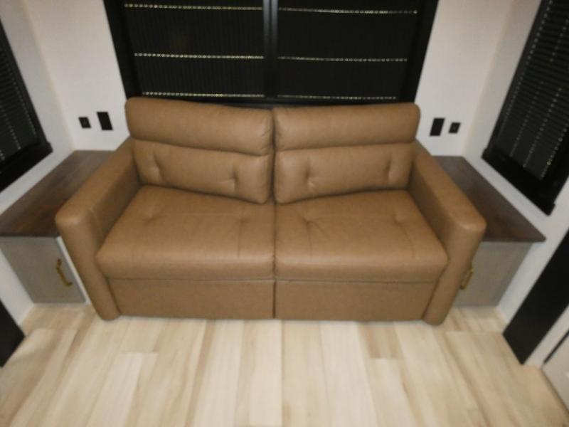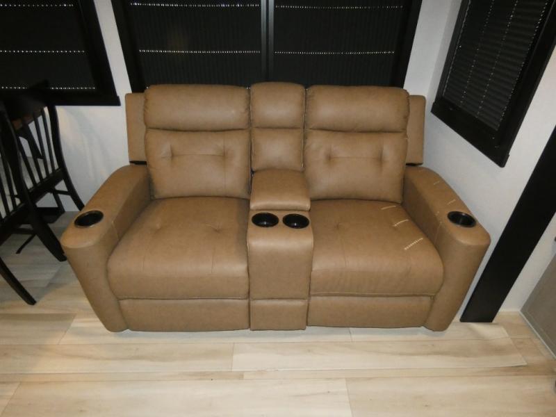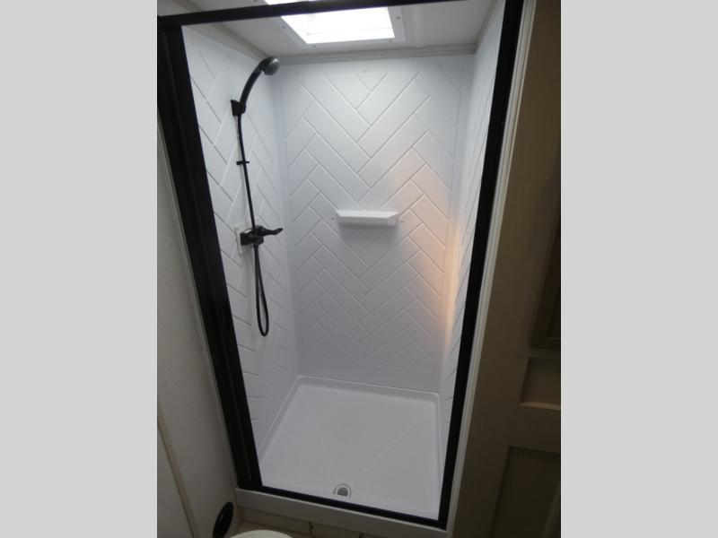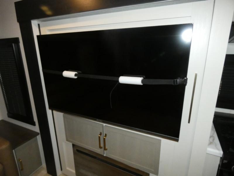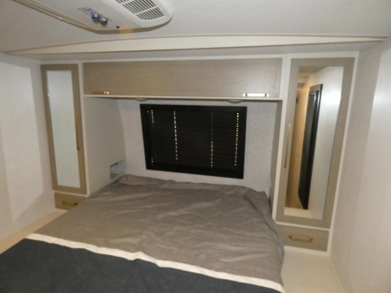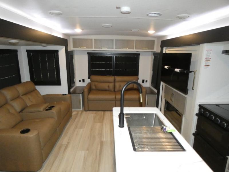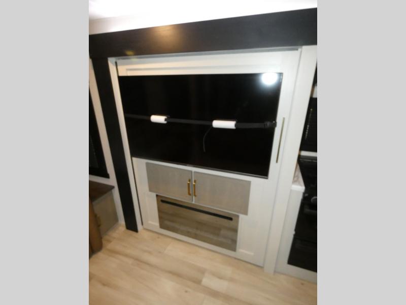 Step inside this luxurious travel trailer and see all that it has to offer! You will enjoy a good night's rest each night on the queen bed with Versa Tilt with wardrobes on either side to keep your clothes wrinkle free, and if you have a couple of guests then you can convert the rear tri-fold sofa into a sleeping space. The 30" x 36" walk-in shower with a skylight above invites you to take a hot, steamy shower after a fun-filled day outdoors. Once you're cleaned up, you can grab some leftovers from the 10 cu. ft. 12V black refrigerator and warm it up in the microwave. There is also theatre seating across from the 50" LED TV with a fireplace below!