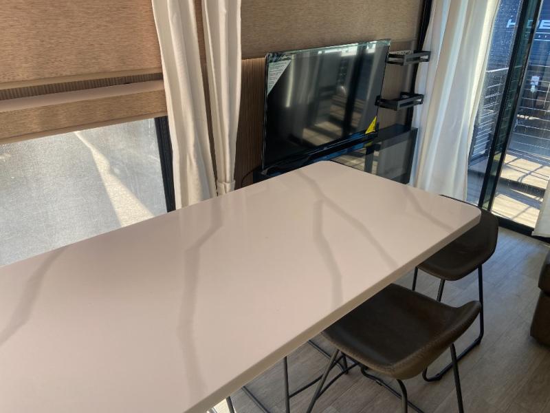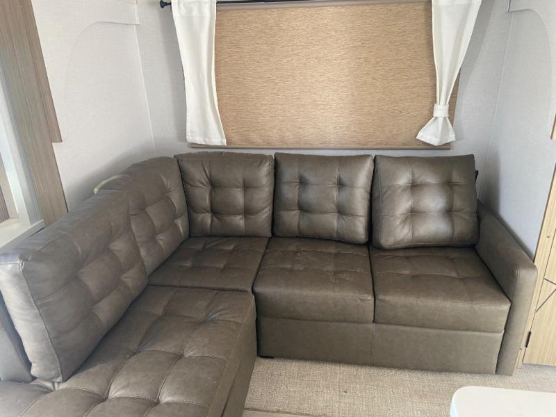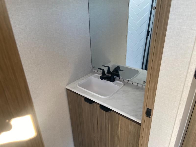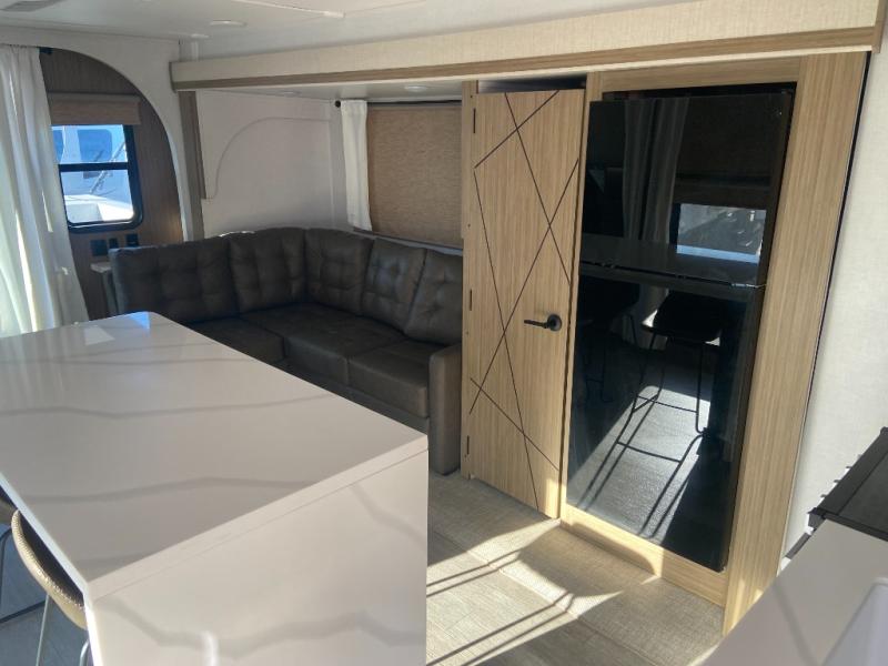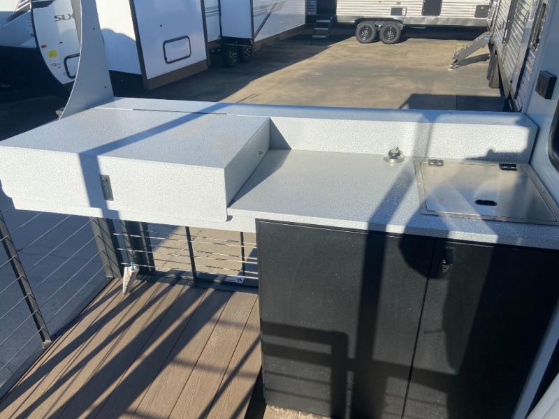 This travel trailer will feel more like home with its rear veranda/porch, dual entry doors, and front private bedroom! There is an outdoor kitchen on the back porch so you can make lunch in the fresh air, and the patio doors lead right into the main living area. Your crew can relax on the L-shaped sofa across from the fireplace, which will make your space more cozy. A kitchen island with four chairs will provide a place to dine at, and there is a spacious pantry and refrigerator for food storage. You will love having your own space in the private bedroom, and the Versa-Tilt custom king bed will let you sit up in bed to read your book at night.