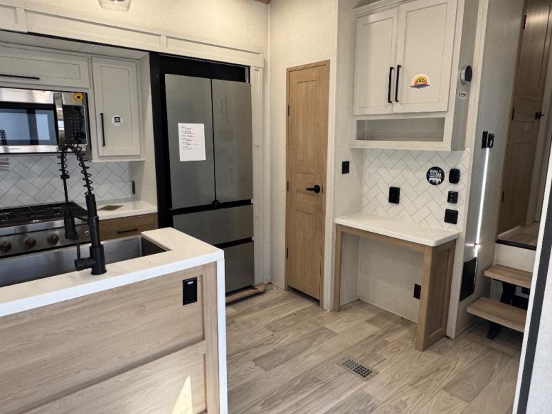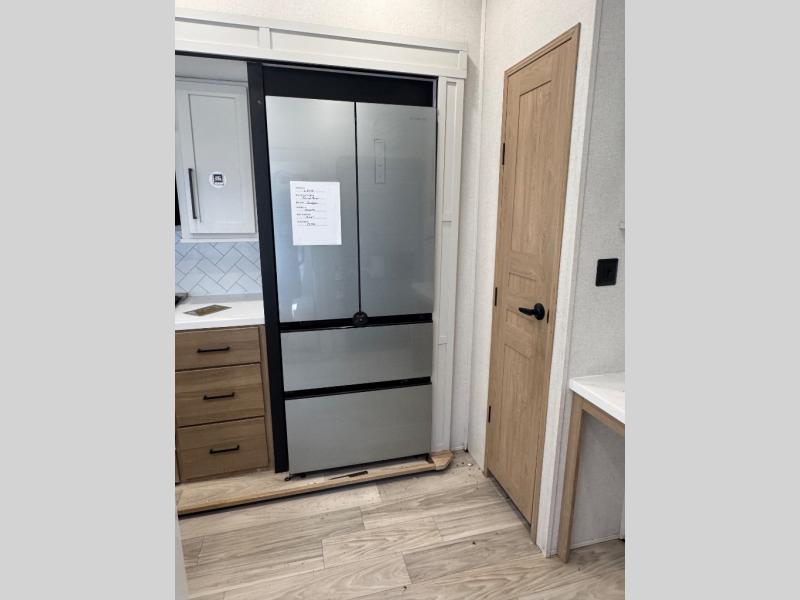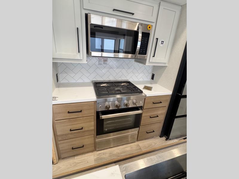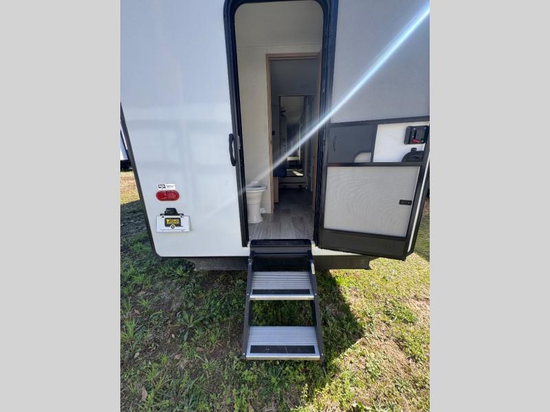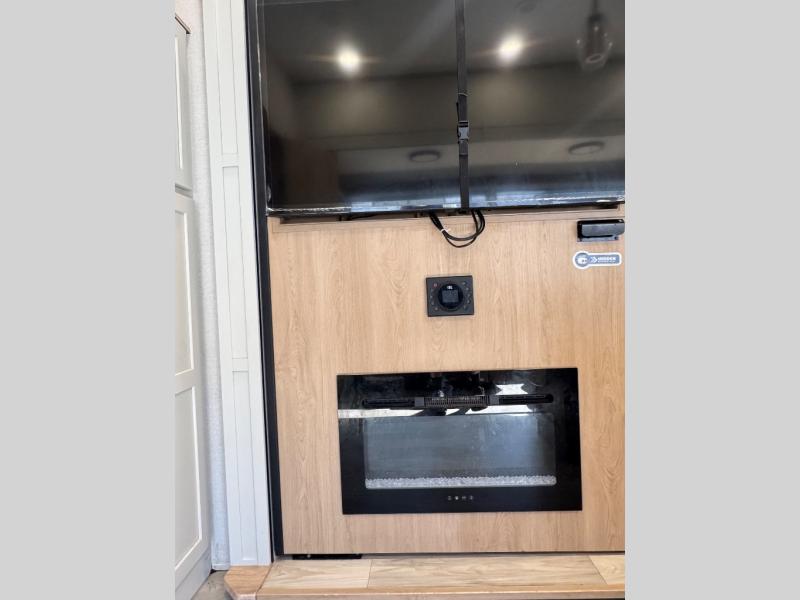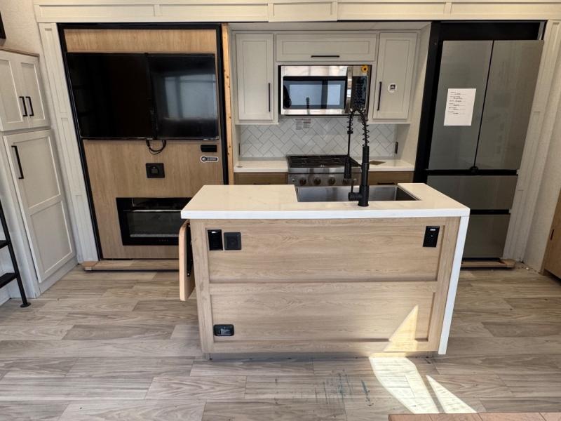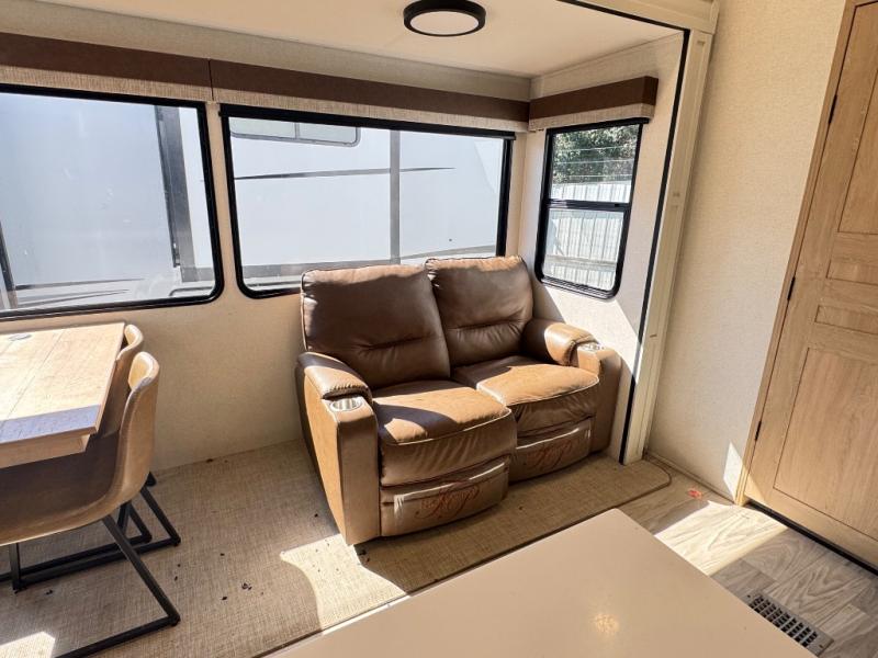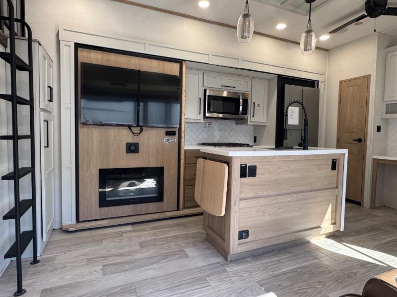 Weekend camping trips and full-time RV living is made complete in this quad slide out fifth wheel. Your crew can relax under the two power awnings, or head inside to enjoy the fireplace. There is also a 50" flat screen TV across from the theater seating, plus a free-standing dinette to dine at. There are two full baths with the front bath including a walk-in shower with a seat for your comfort, and the front private bedroom will feel just like home with its queen bed and large front wardrobe. There is even washer and dryer prep to make laundry day easier than ever. The master bedroom in back includes a second queen bed slide out, and the rear full bath has another convenience with it's exterior entry door, and