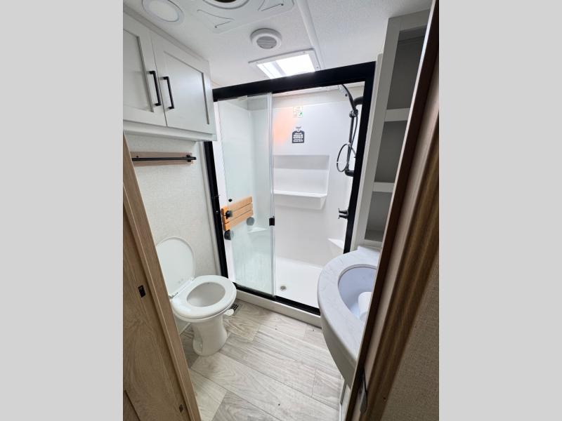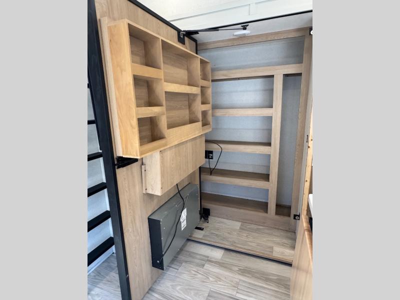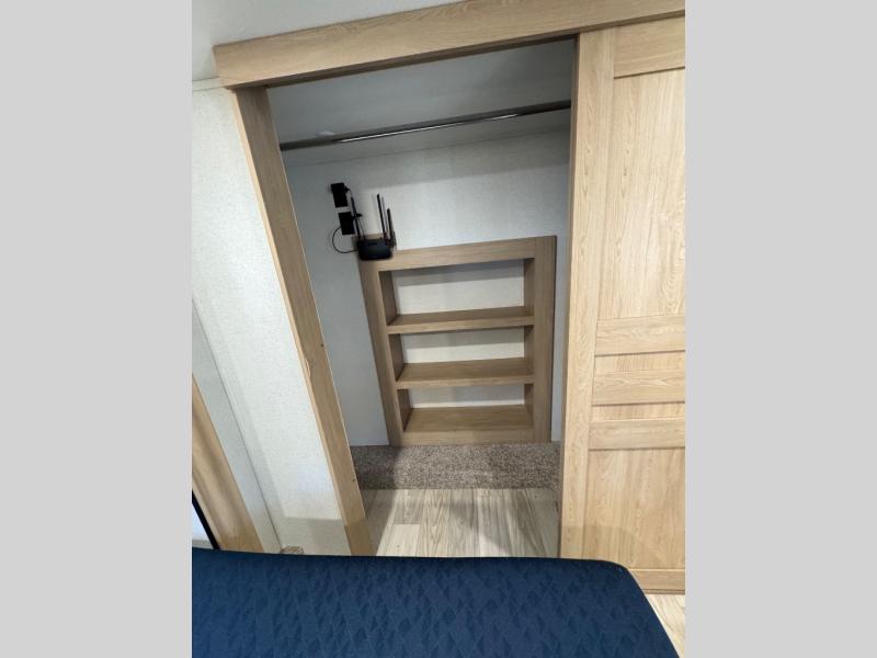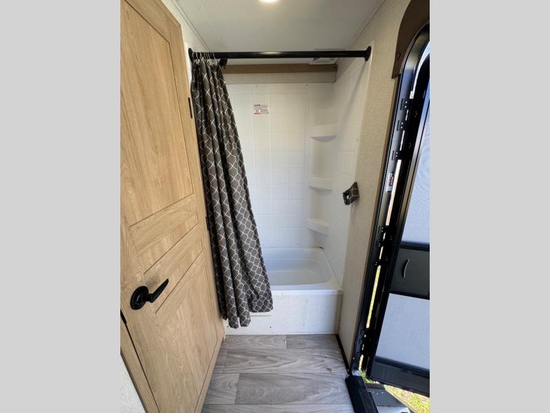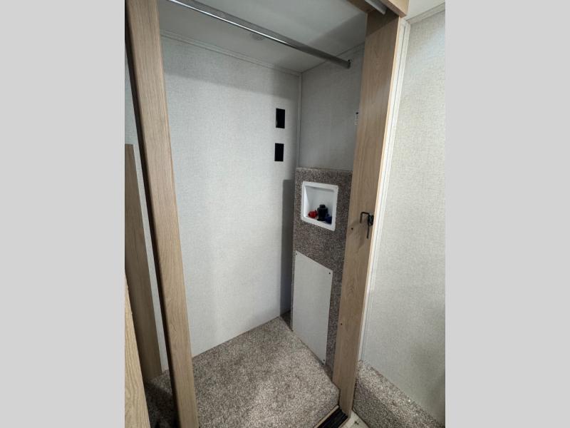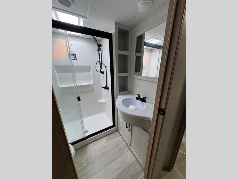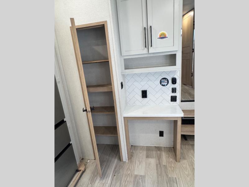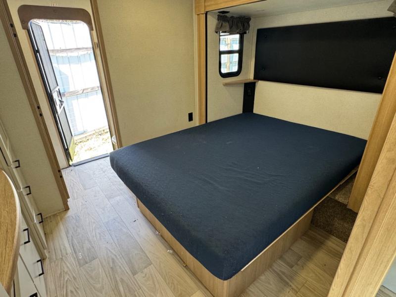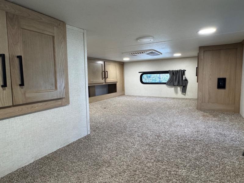 Weekend camping trips and full-time RV living is made complete in this quad slide out fifth wheel. Your crew can relax under the two power awnings, or head inside to enjoy the fireplace. There is also a 50" flat screen TV across from the theater seating, plus a free-standing dinette to dine at. There are two full baths with the front bath including a walk-in shower with a seat for your comfort, and the front private bedroom will feel just like home with its queen bed and large front wardrobe. There is even washer and dryer prep to make laundry day easier than ever. The master bedroom in back includes a second queen bed slide out, and the rear full bath has another convenience with it's exterior entry door, and