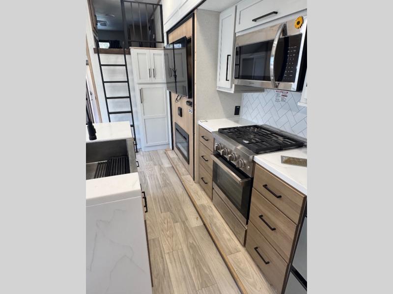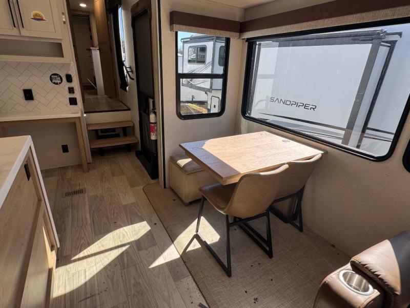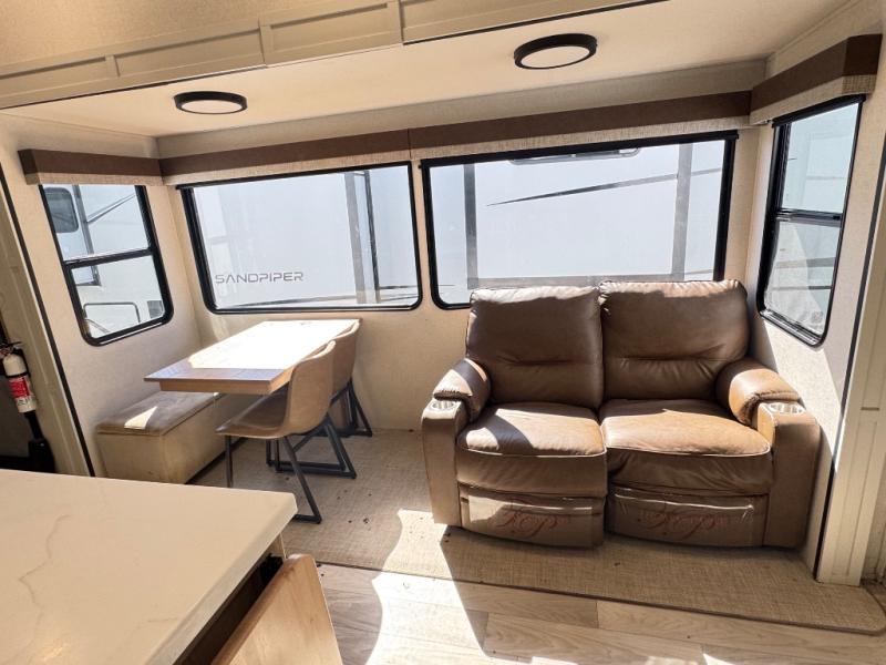 You will find the perfect balance of size, space, features, and luxury with any one of these Forest River Sandpiper fifth wheels! They are constructed with a welded aluminum framed vacuum bonded laminated superstructure, a cambered powder coated frame with rust prohibitor, and a fully enclosed underbelly for added protection against the elements. The large tinted windows come with a 80/20 UV prohibitor or you can choose the optional dual pane windows. Some hassle-free amenities include a 60k BTU on-demand water heater, full coach water filter system, tire pressure monitor system, and an electric leveling system! Inside, you'll enjoy stainless steel appliances, solid surface countertops, Beachside Sundance linoleum, recessed residential lighting, and many more comforts!