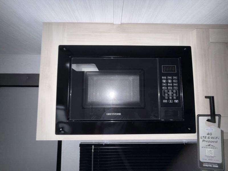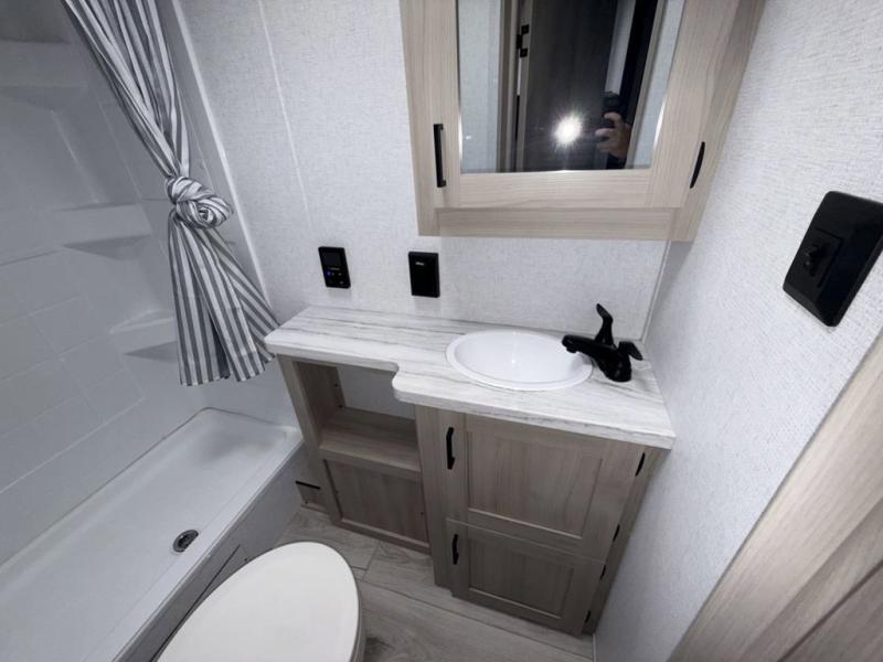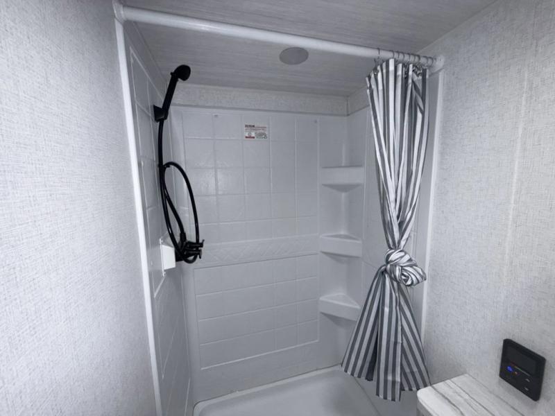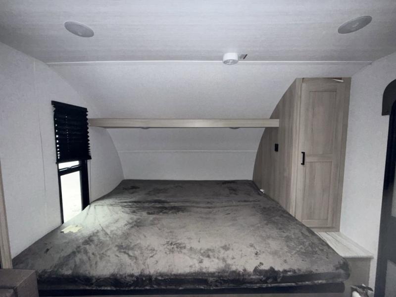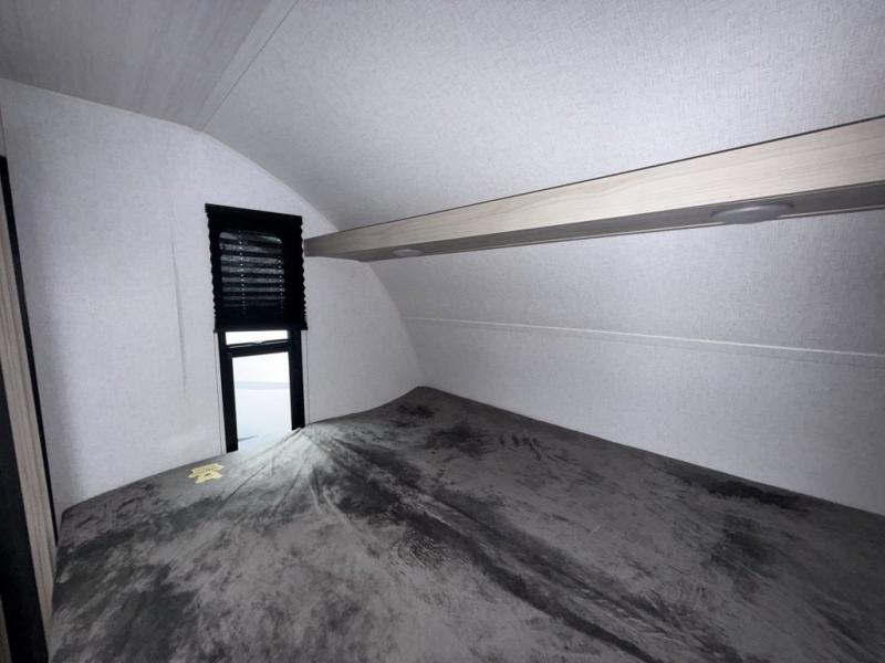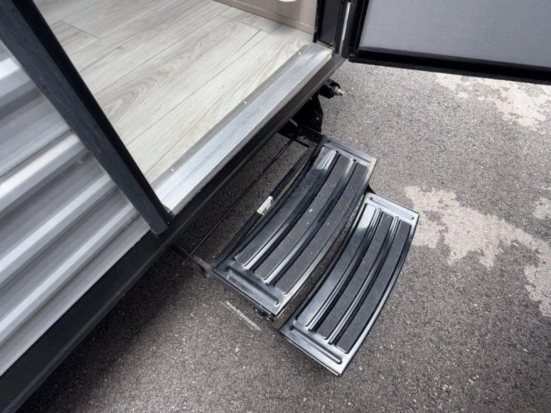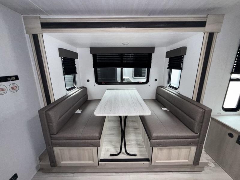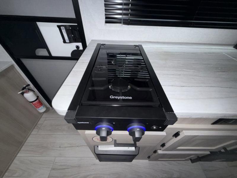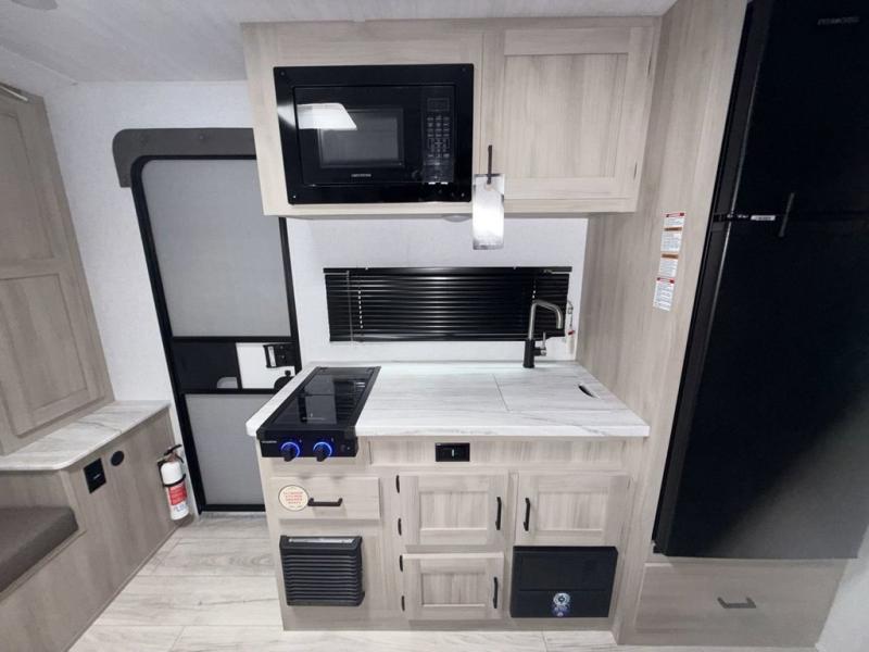 You'll love every minute camping in this single axle travel trailer. Once you arrive at the campground, you can unload the pass-through storage and put out the 14' power awning with adjustable legs and LED light strip. The two burner cooktop and microwave oven will let you make meals each day, and you can dine at the booth dinette slide out once dinner is made. If you have an overnight guest or two little ones, they can sleep here at night, while you take the front queen-size Murphy bed. There are also double-size bunks with storage for even more sleeping space!