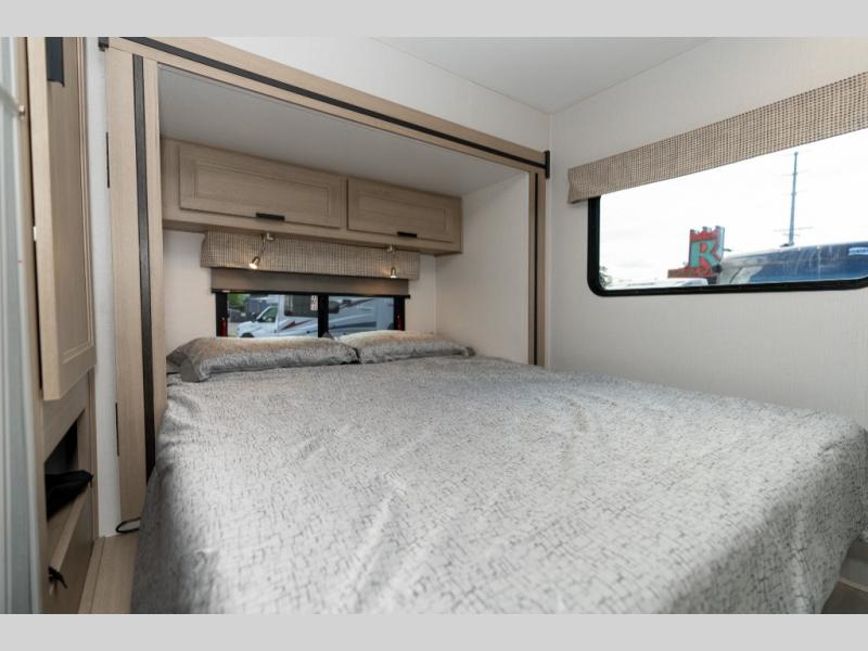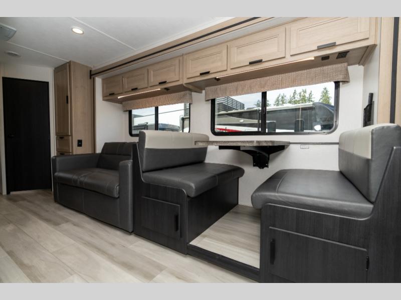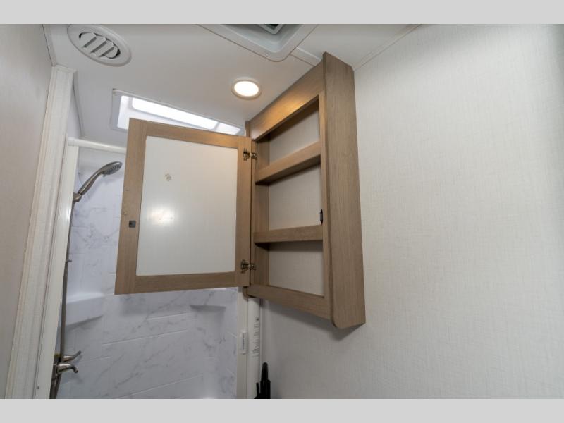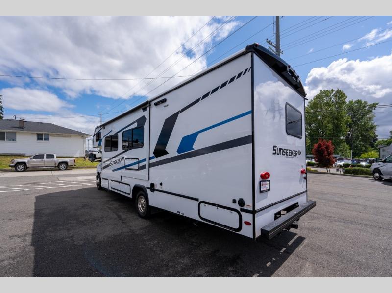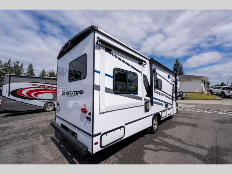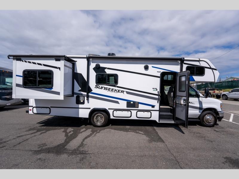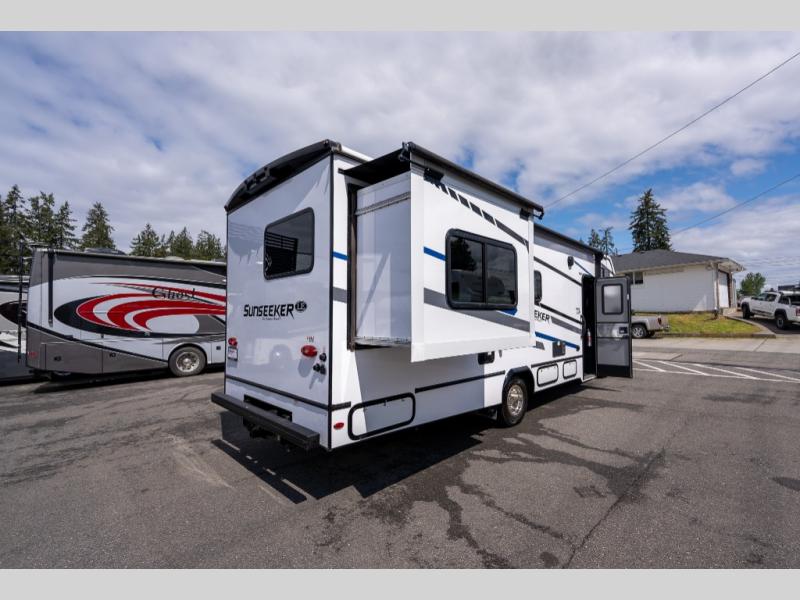 Don't make the mistake of passing up this Sunseeker LE Class C gas motorhome! There is a full bathroom with a shower skylight, oxygen-infused shower head with flexible extension, and an electric roof fan, and the bathroom is right next to the bedroom for convenience. The pantry, linen closet, wardrobe, and overhead storage offer you places to tuck away your belongings, and there are also two large storage drawers in the booth dinette as well. While you're resting on the sofa, you can watch the 12V LED TV, or you can chat with the chef who is preparing dinner on the recessed three-burner range or in the convection microwave.