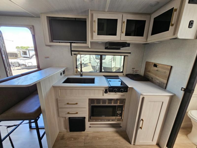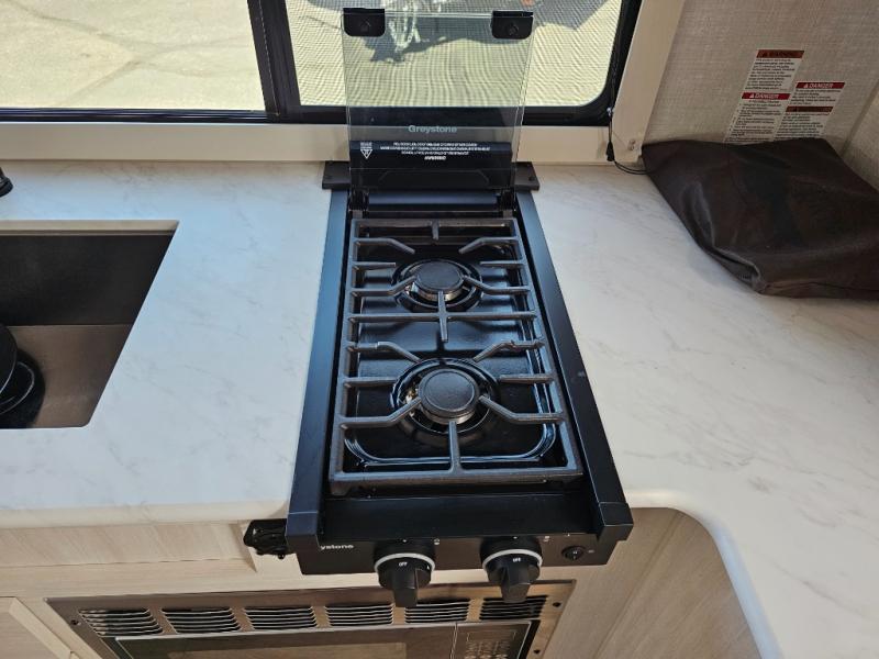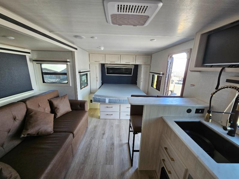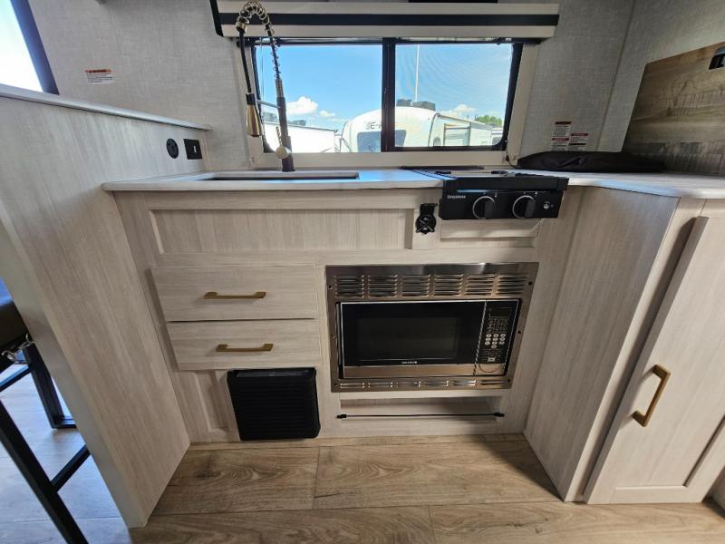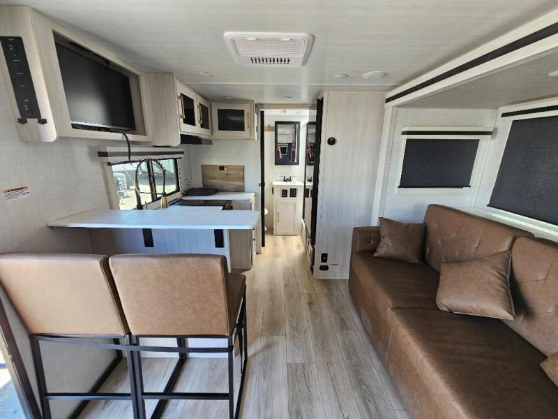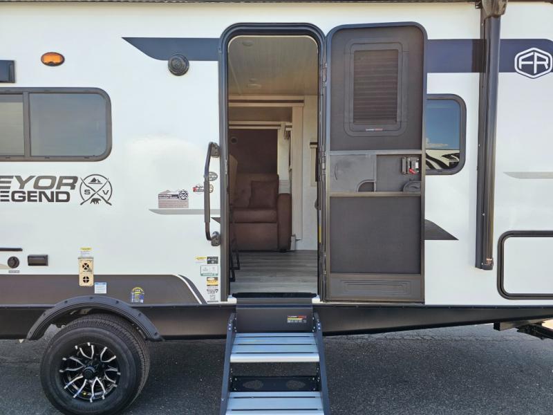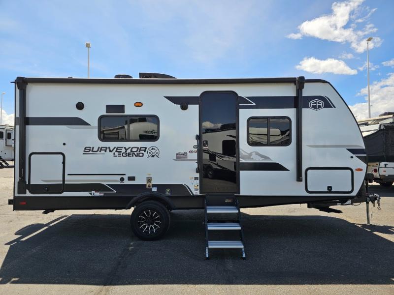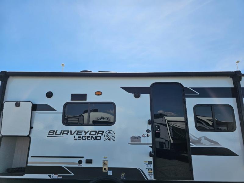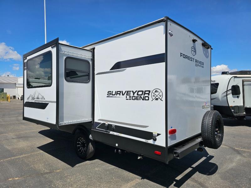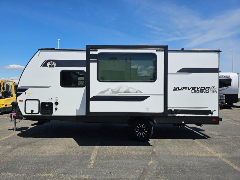 Hit the road with this Surveyor Legend trailer in tow, featuring a tri-fold sofa slide for added seating, sleeping, and interior space. You will also love the breakfast bar with two stools for dining. The queen bed up front will provide a great night's rest, and there is overhead storage at the head of the bed along with dual wardrobes for your things on either side. If you have an overnight guest or two little ones, they can sleep on the tri-fold sofa slide, and everyone will appreciate the privacy of the full rear bath. You will have everything needed each day to prepare meals, including a two burner cooktop, a convection microwave, and refrigerator for your perishables. The pass-through storage will be be perfect for fishing poles, outdoor chairs, yard games, plus there is additional outdoor storage along the rear curbside for your hiking gear!