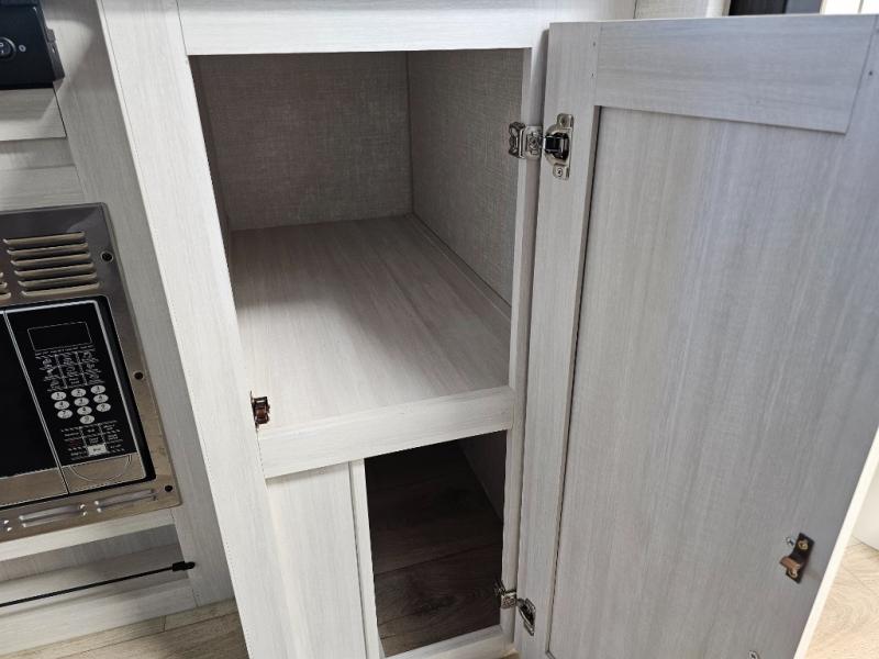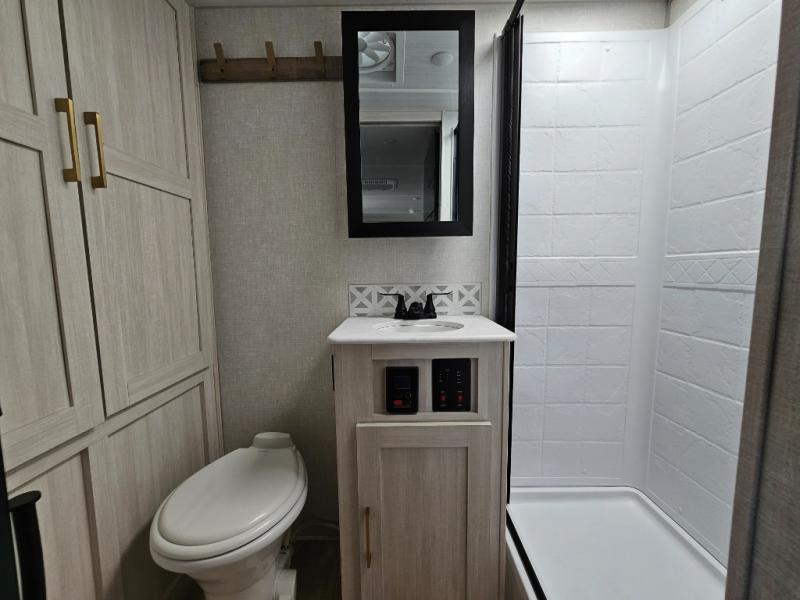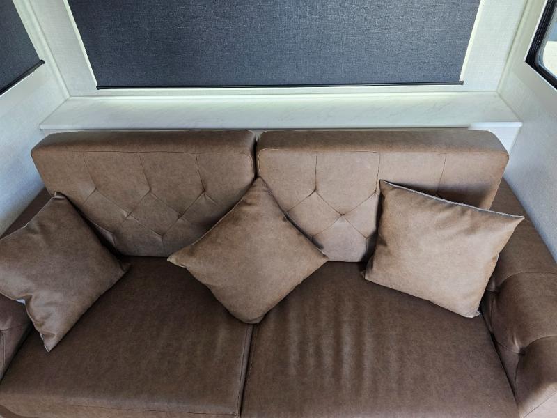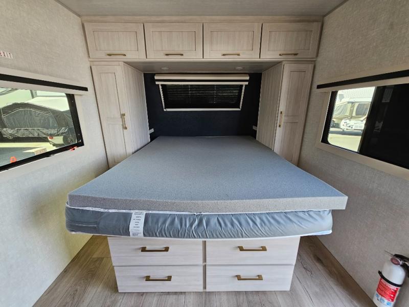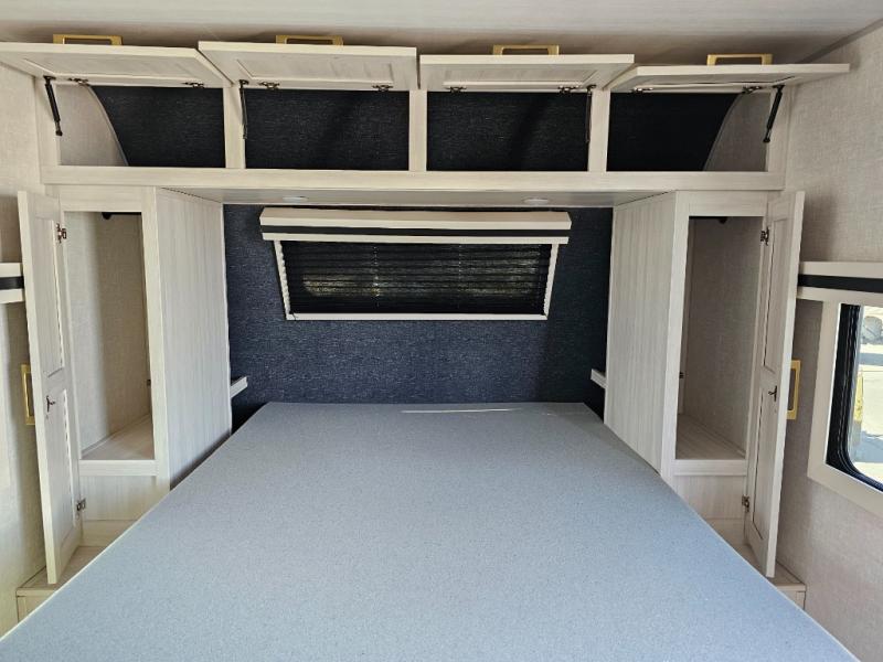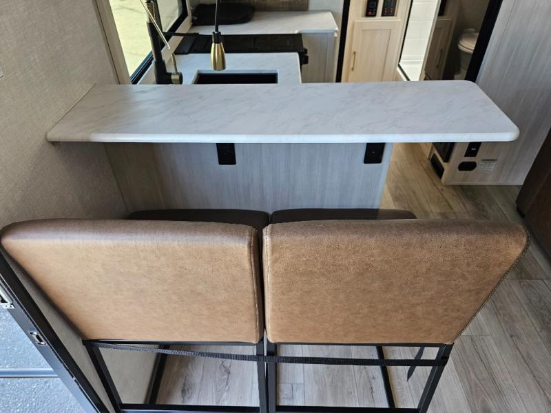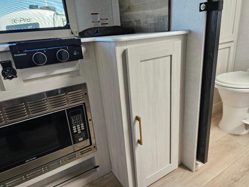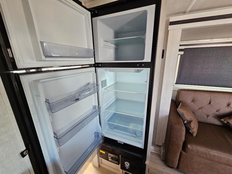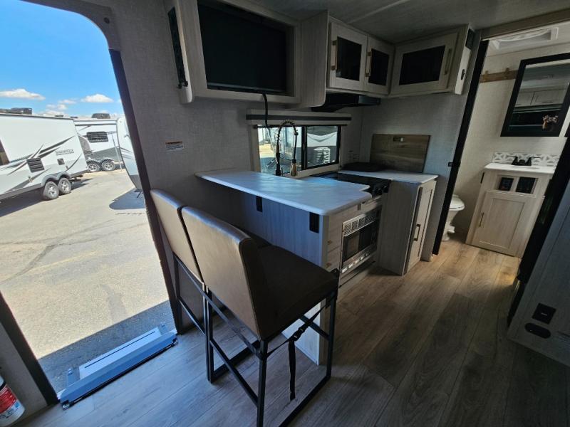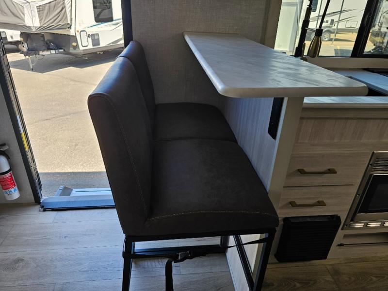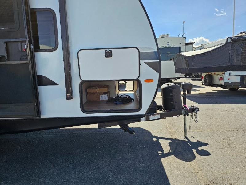 Hit the road with this Surveyor Legend trailer in tow, featuring a tri-fold sofa slide for added seating, sleeping, and interior space. You will also love the breakfast bar with two stools for dining. The queen bed up front will provide a great night's rest, and there is overhead storage at the head of the bed along with dual wardrobes for your things on either side. If you have an overnight guest or two little ones, they can sleep on the tri-fold sofa slide, and everyone will appreciate the privacy of the full rear bath. You will have everything needed each day to prepare meals, including a two burner cooktop, a convection microwave, and refrigerator for your perishables. The pass-through storage will be be perfect for fishing poles, outdoor chairs, yard games, plus there is additional outdoor storage along the rear curbside for your hiking gear!