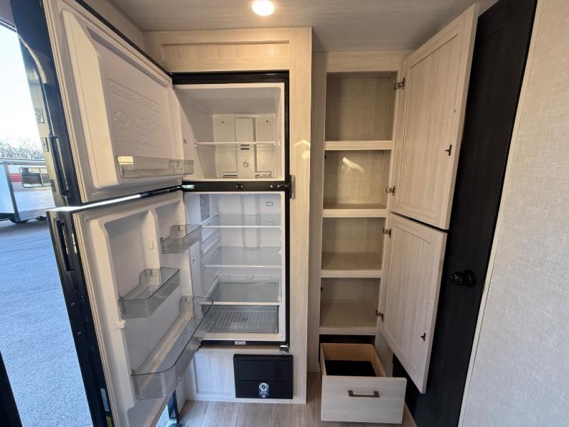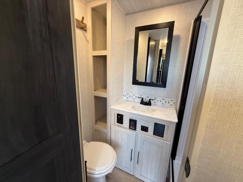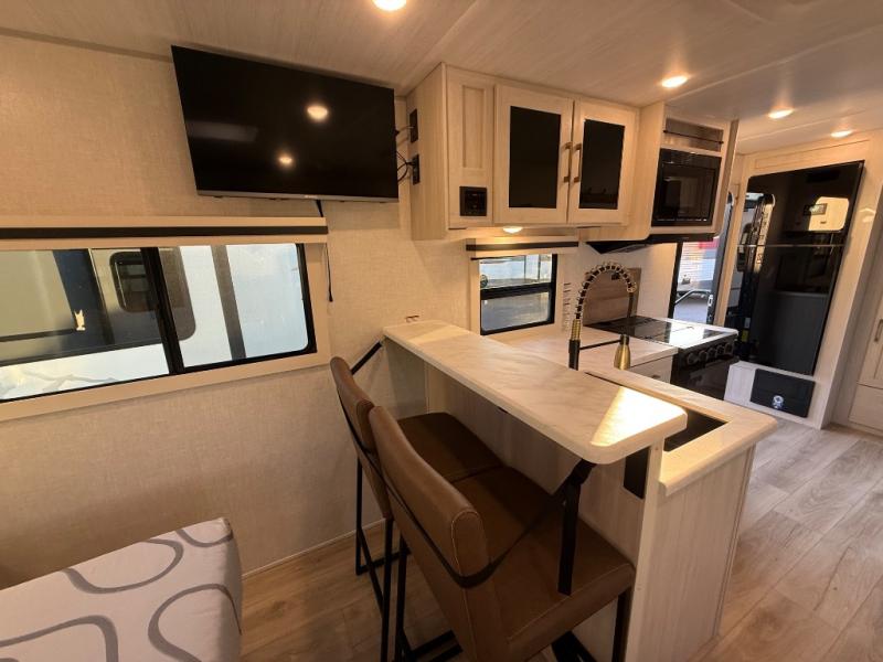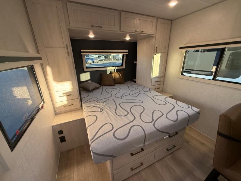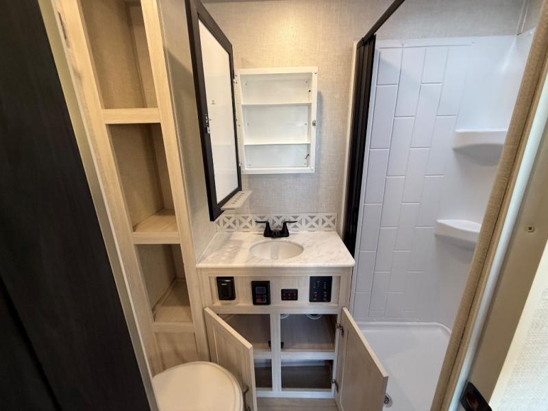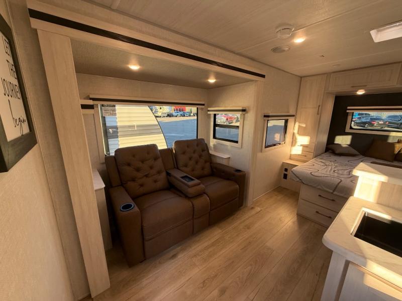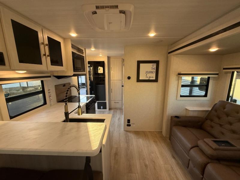 You're going to love every minute spent in this 25' travel trailer! The counter with stools will be the perfect place to enjoy your morning coffee at, plus there is a dinette slide for more seating space. You will get a great night's rest on the queen bed in the front bedroom, and the two wardrobes allow you to keep your clothes tidy. Further customize this trailer by adding the theater seating option or tri-fold sofa option in place of the dinette, and you'll enjoy the standard HD TV for late-night movies!