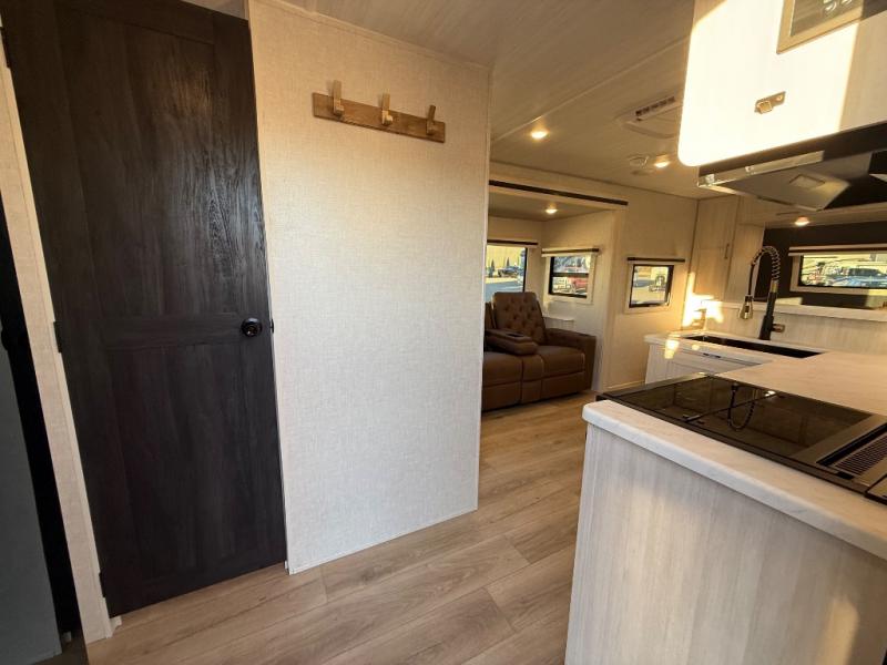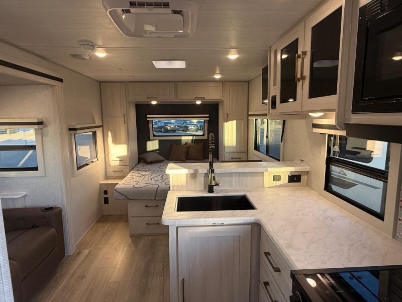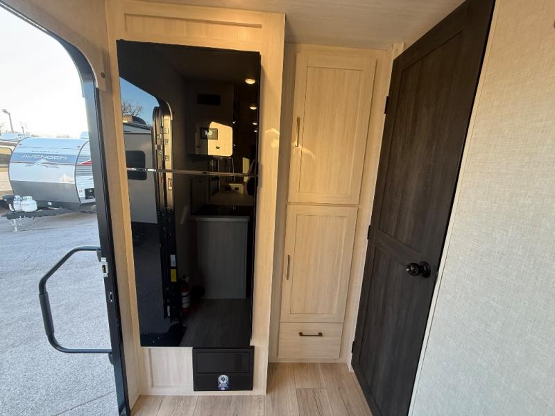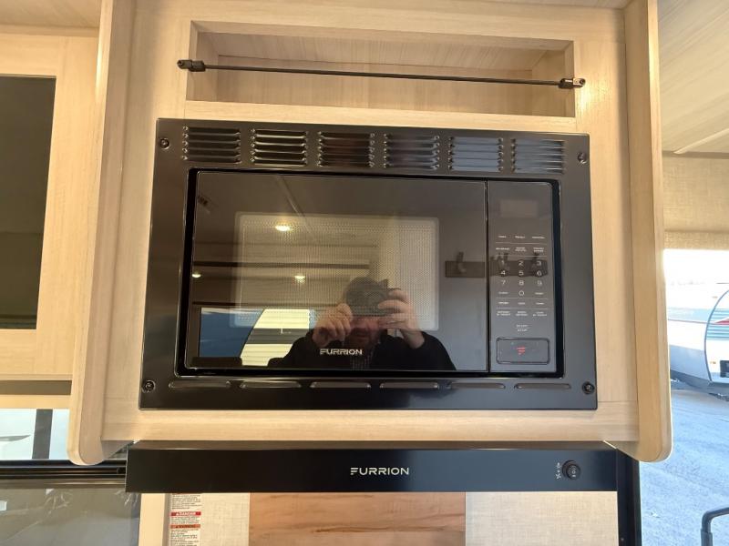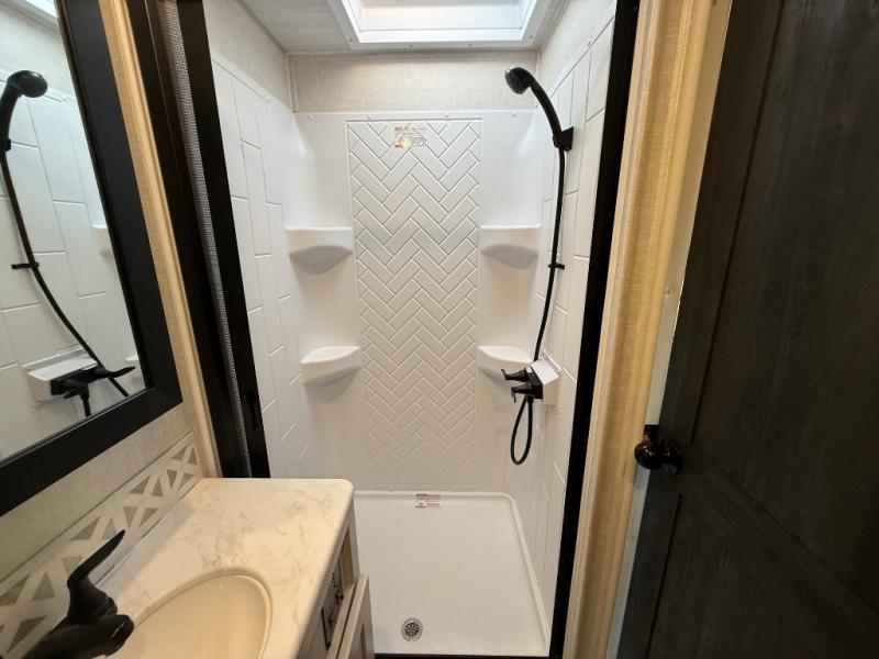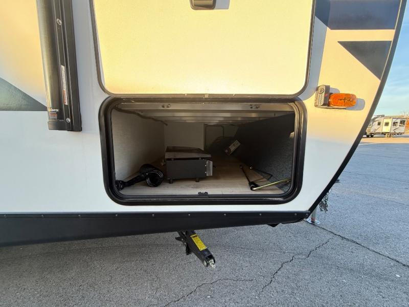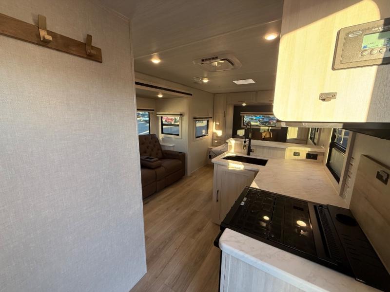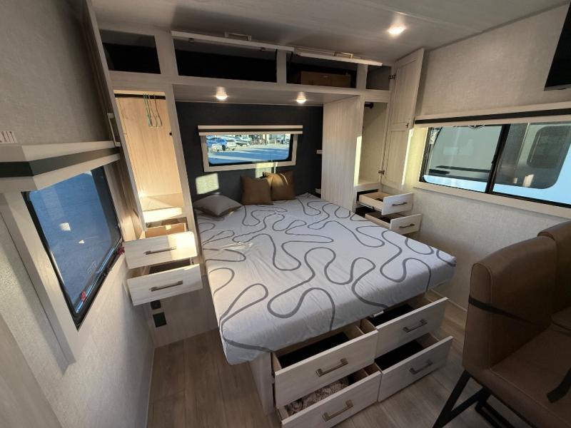 You're going to love every minute spent in this 25' travel trailer! The counter with stools will be the perfect place to enjoy your morning coffee at, plus there is a dinette slide for more seating space. You will get a great night's rest on the queen bed in the front bedroom, and the two wardrobes allow you to keep your clothes tidy. Further customize this trailer by adding the theater seating option or tri-fold sofa option in place of the dinette, and you'll enjoy the standard HD TV for late-night movies!