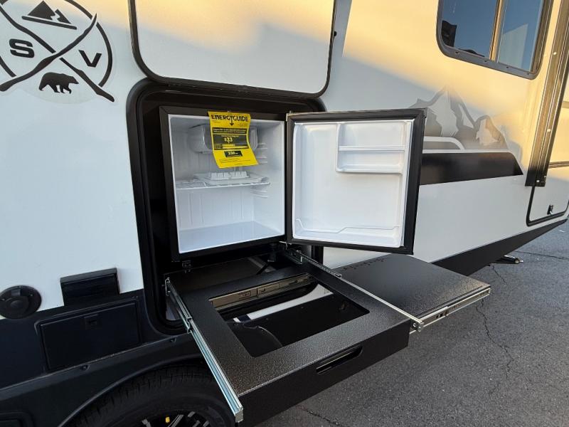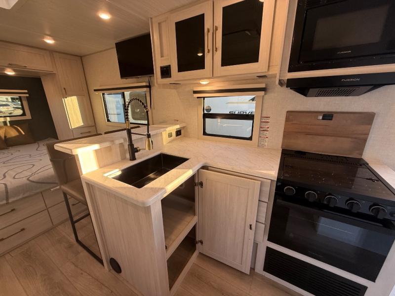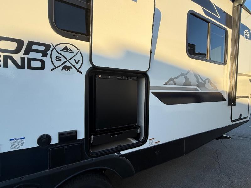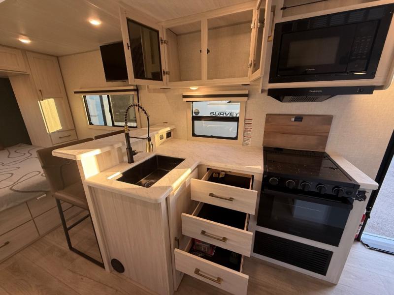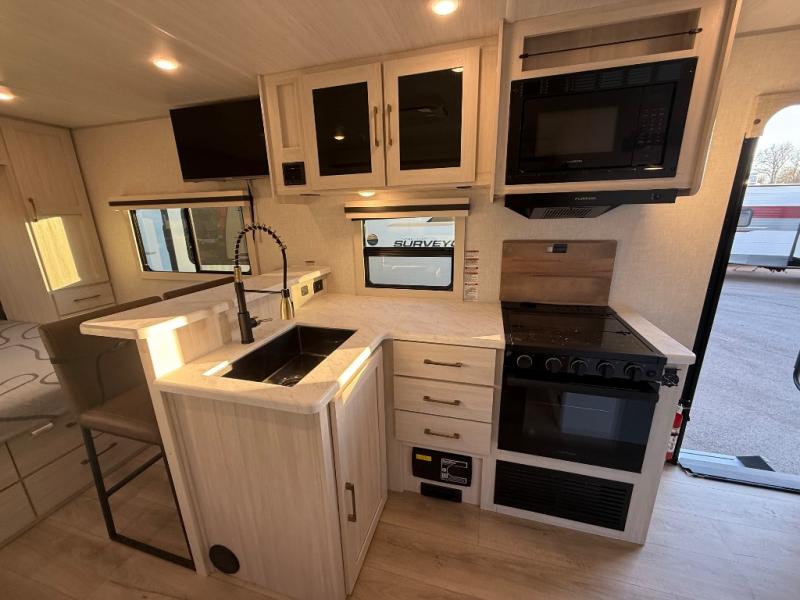 With any Surveyor Legend travel trailer by Forest River you will enjoy quality craftsmanship, convenient amenities, and at-home comforts. The Azdel composite walls provide a longer-lasting trailer, and the power tongue jack with a hitch light will get you back on the road in no-time. There are also Goodyear tires and a tire pressure monitoring system for hassle-free towing. Each model includes the Surveyor Legend Package that comes standard with oversized dinette storage access doors, front slam latch baggage doors, plus an automotive style tinted front windshield. You'll appreciate camping with a tankless water heater for endless hot showers, a 2" accessory hitch to bring bikes along, plus carpet-free interiors and a central vacuum system for easy clean up.