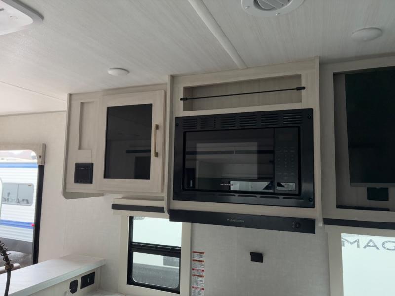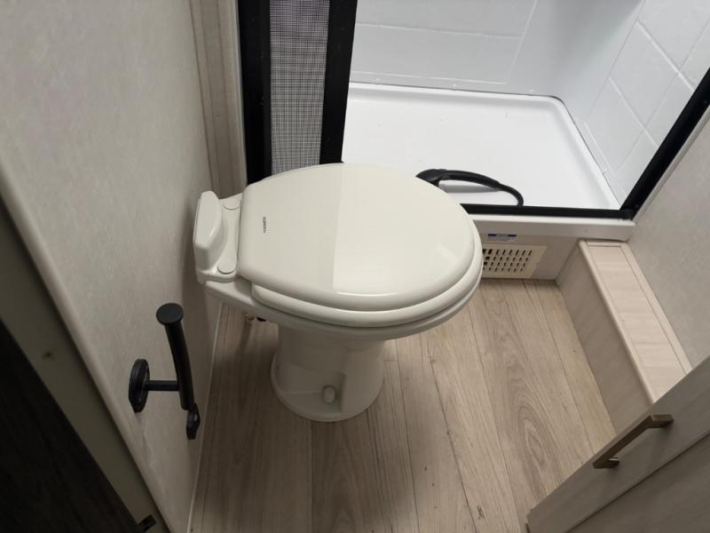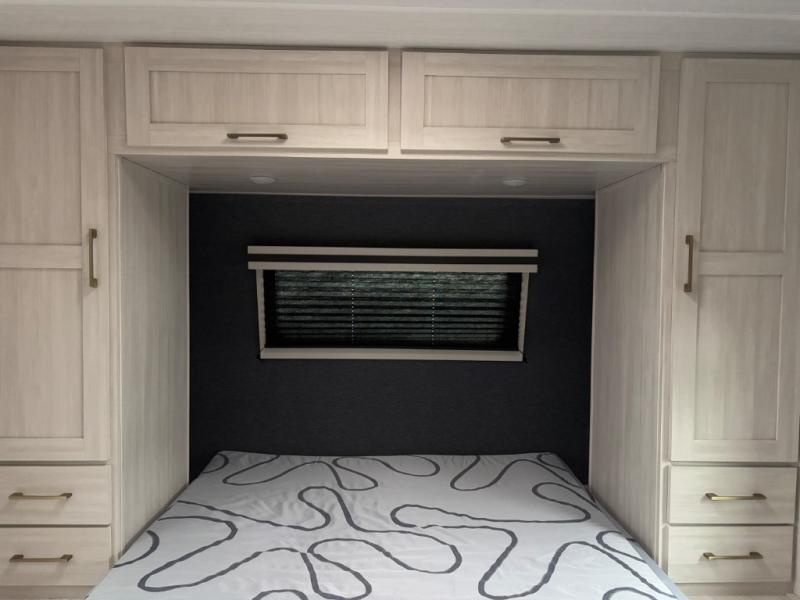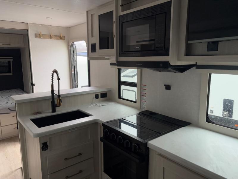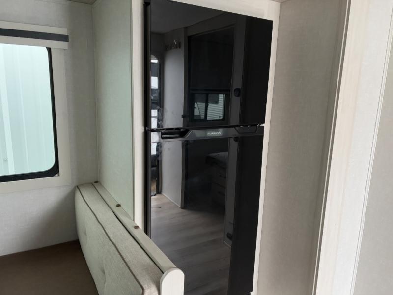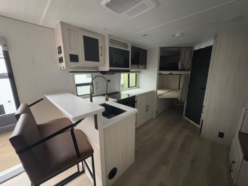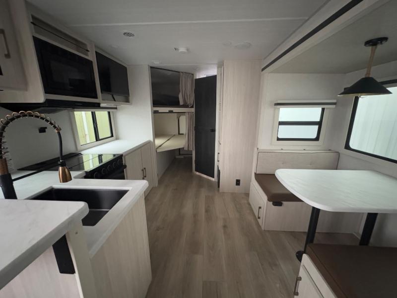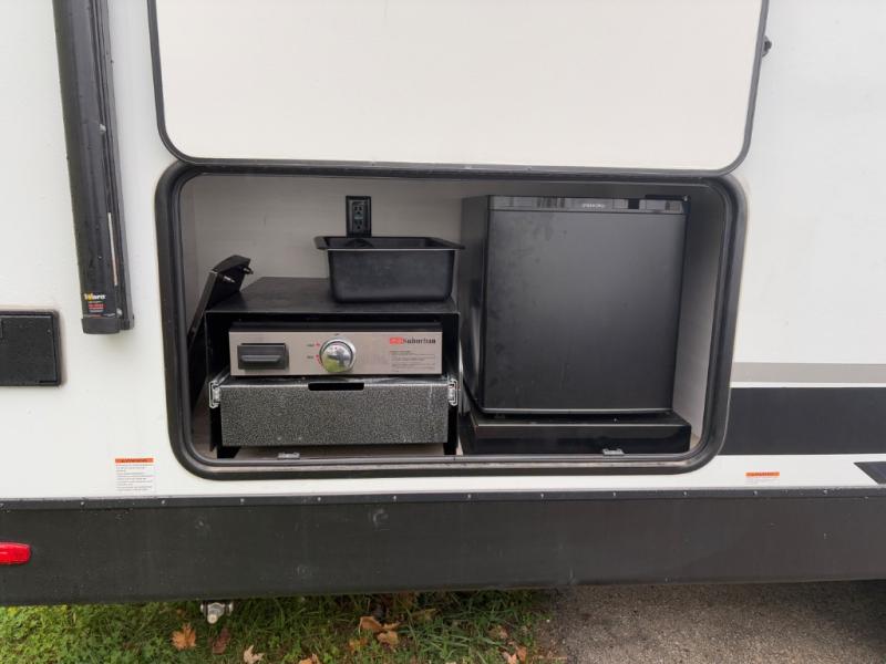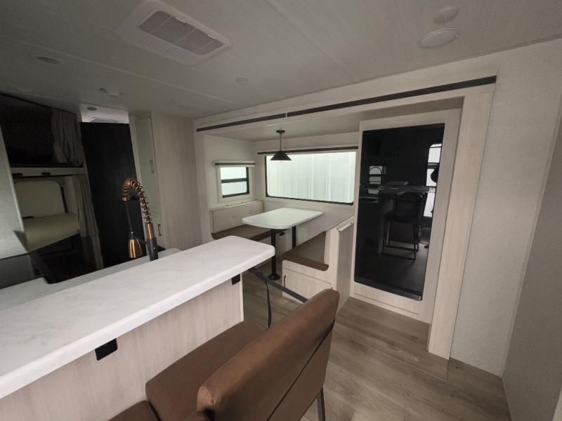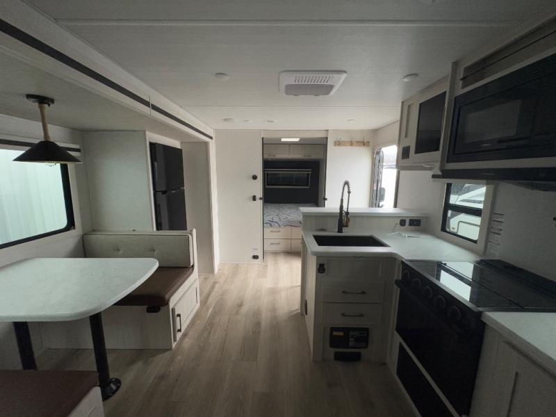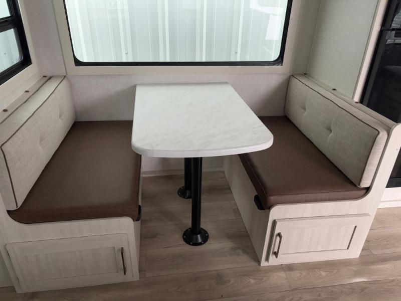 Every trip to the campground will be spent in comfort with this single slide out travel trailer. Once you arrive at the site, remove the kayaks or bikes from the rear storage door, start lunch on the outside kitchen, and put out the 15' power awning with LED lights. The interior includes a booth dinette slide with storage, a bar top with stools, plus an HD TV for movie nights. After a day of fun, head to the front private bedroom for a great night's rest on the queen bed, and you can store your belongings in the dual bedroom wardrobes!