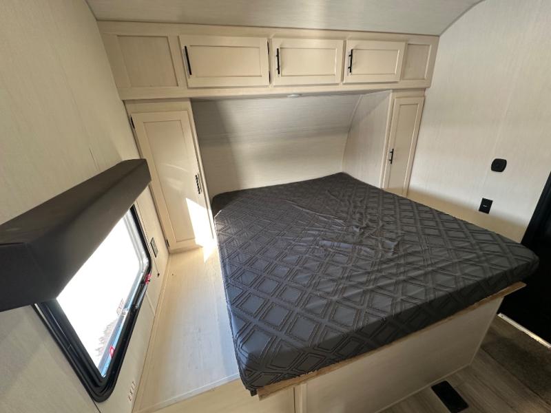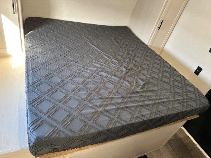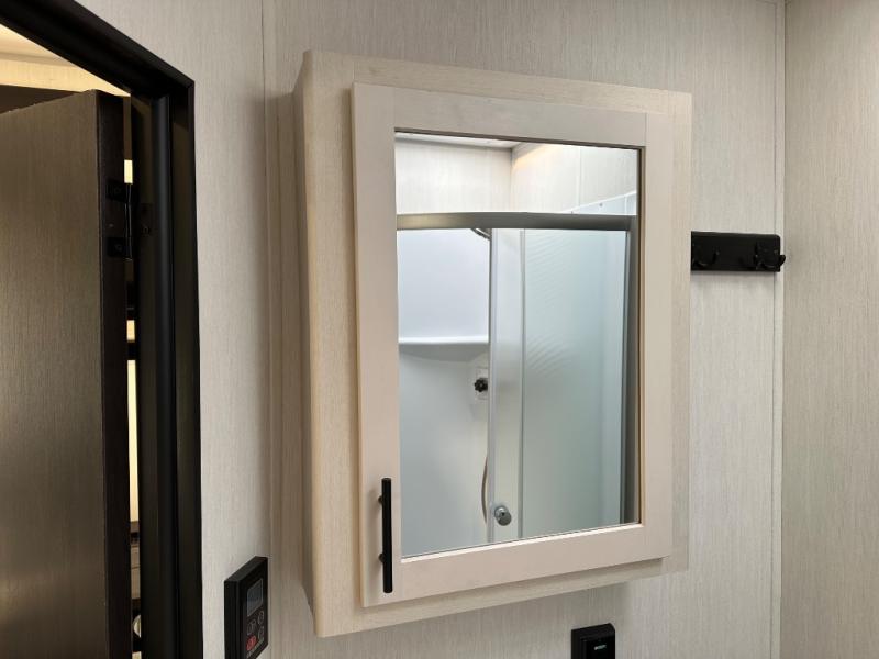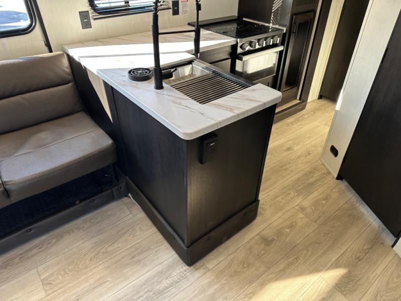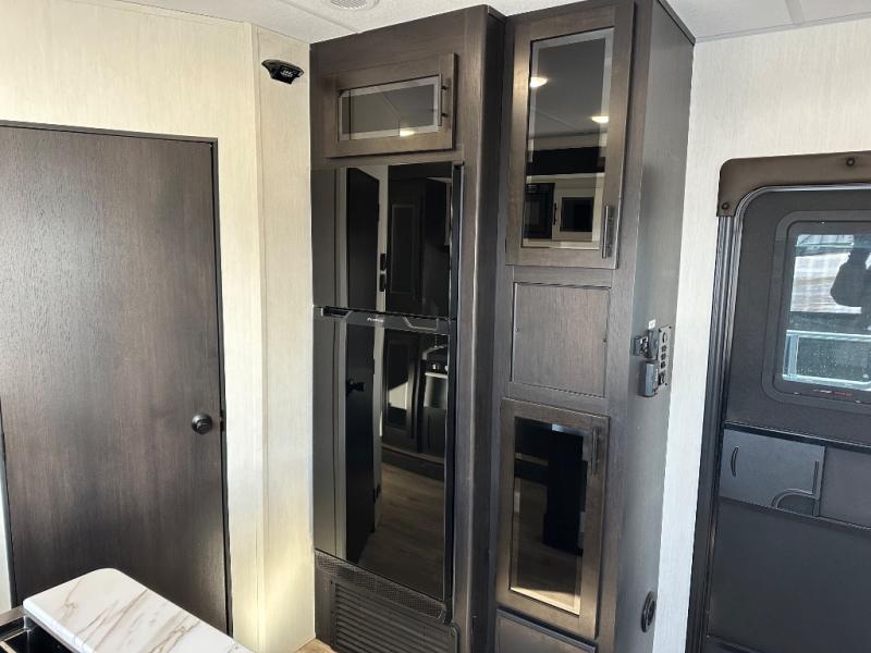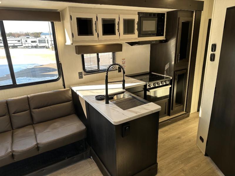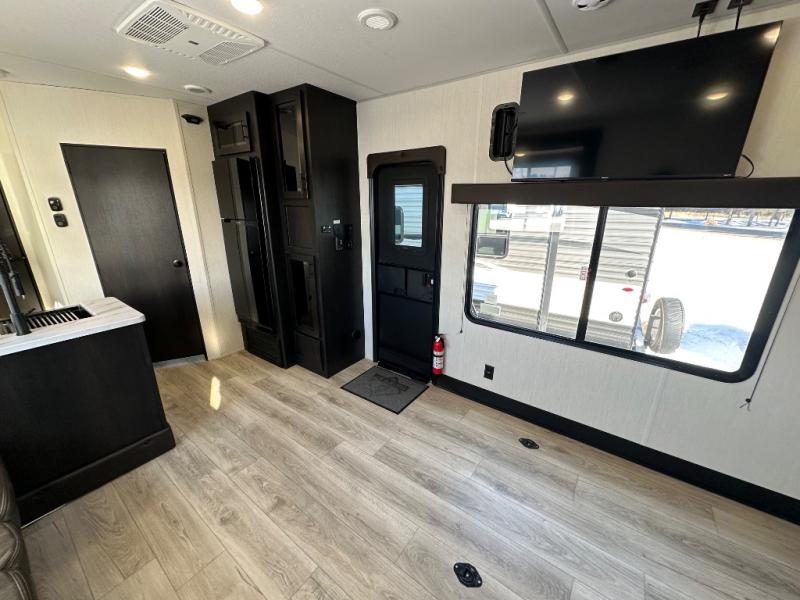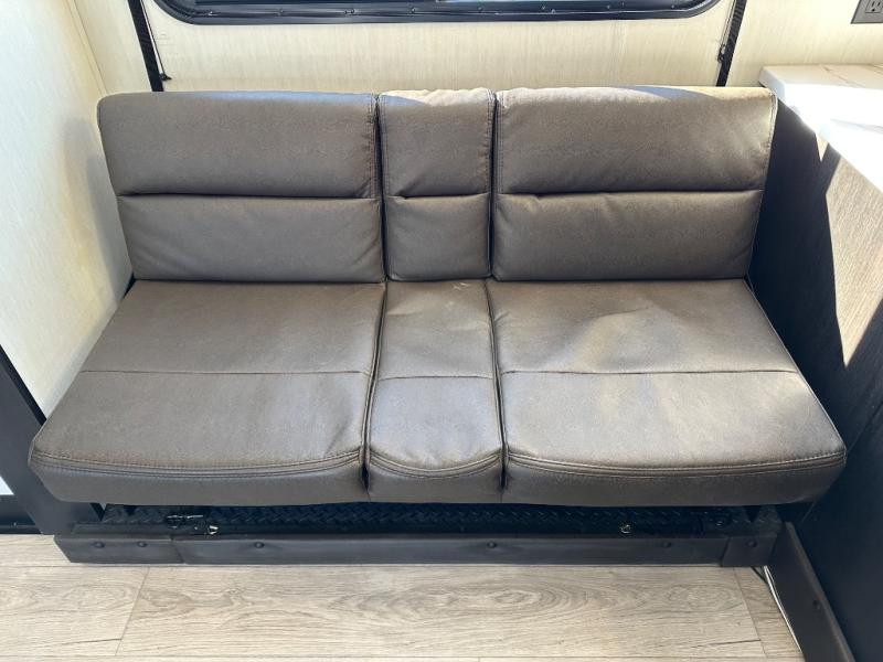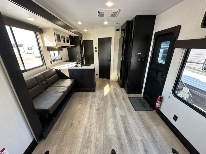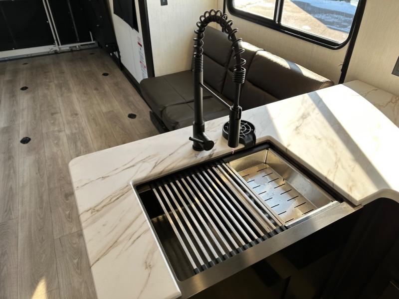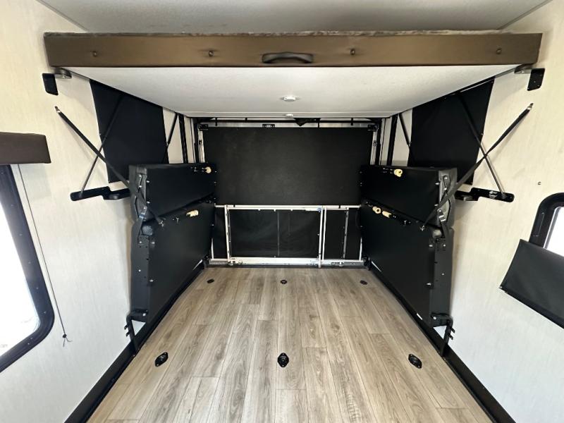 You're going to love this spacious toy hauler with a kitchen slide out! There is a 10' 6" garage with 15' 10" total garage space if you include the main living area where the flip-up sofa and optional lounge chairs are. Once your toys are unloaded, your crew can relax on the roll-over sofas, and at night they can sleep on the quick set queen bed system. You will enjoy the front master bedroom with a Rogue king bed, dual wardrobes, and a private entrance into the dual entry bath!
