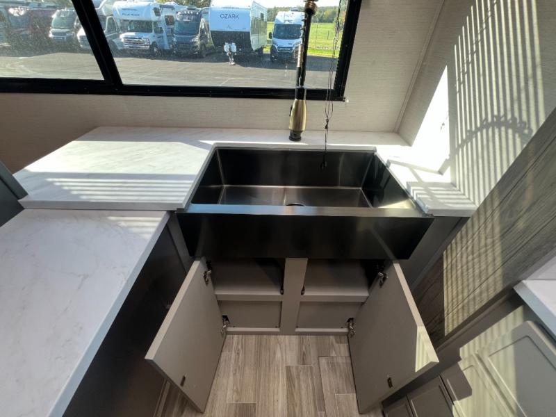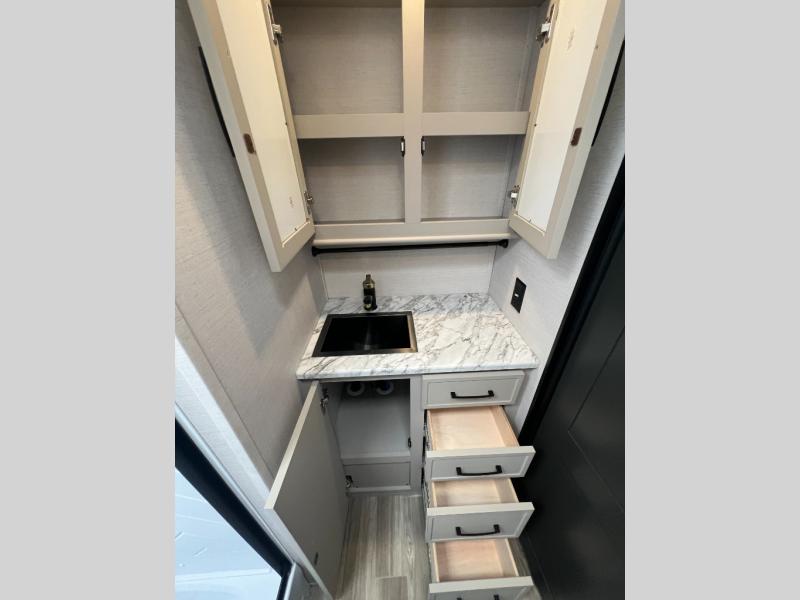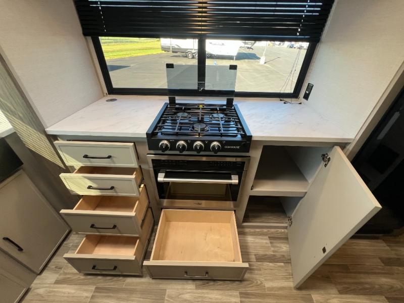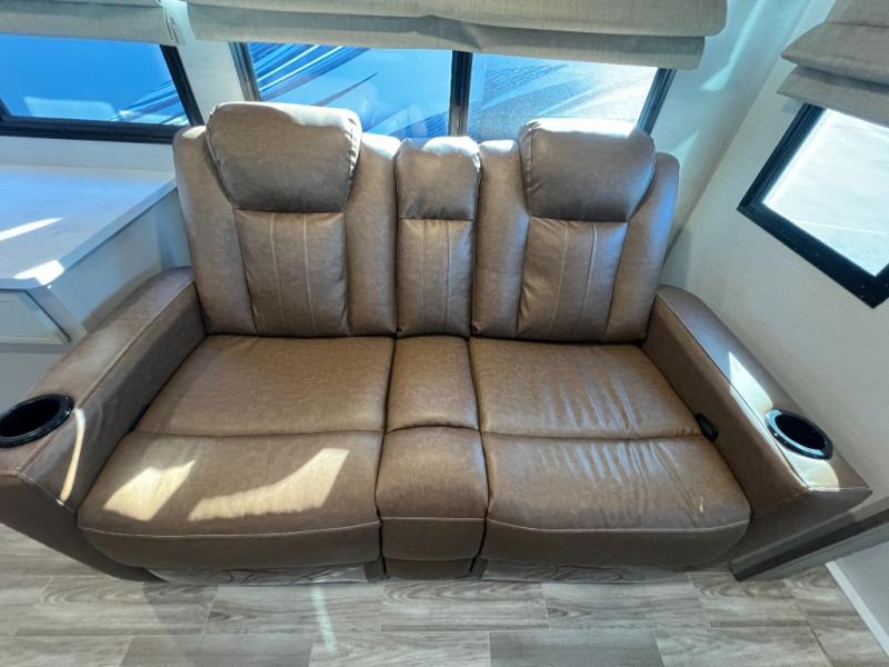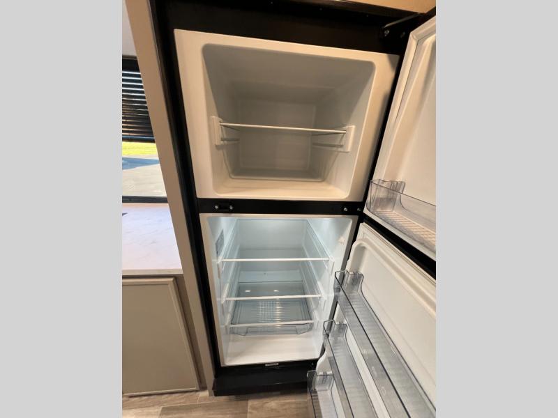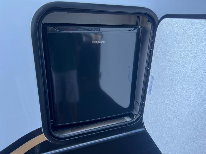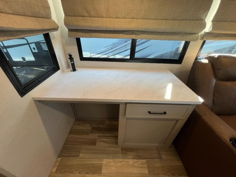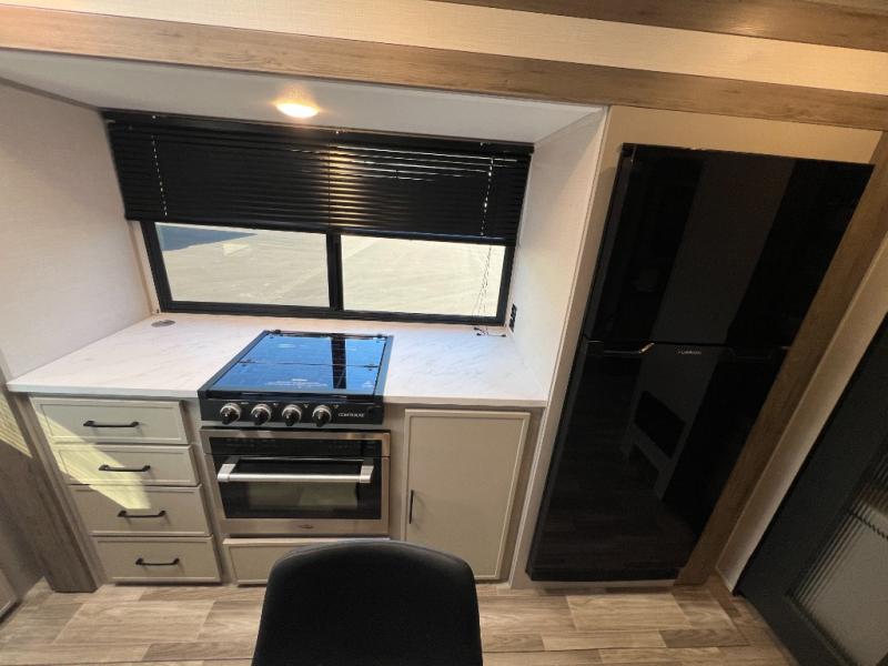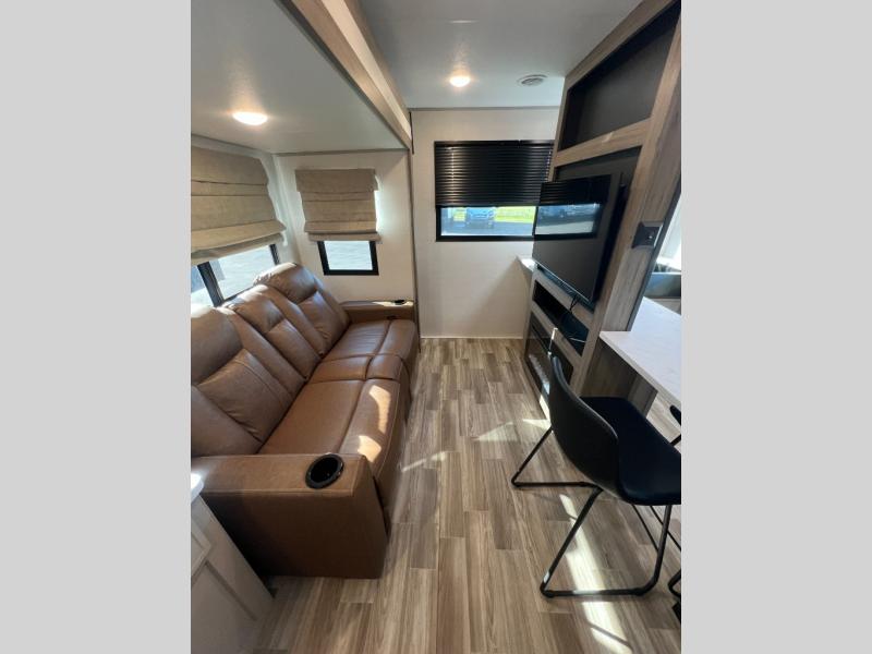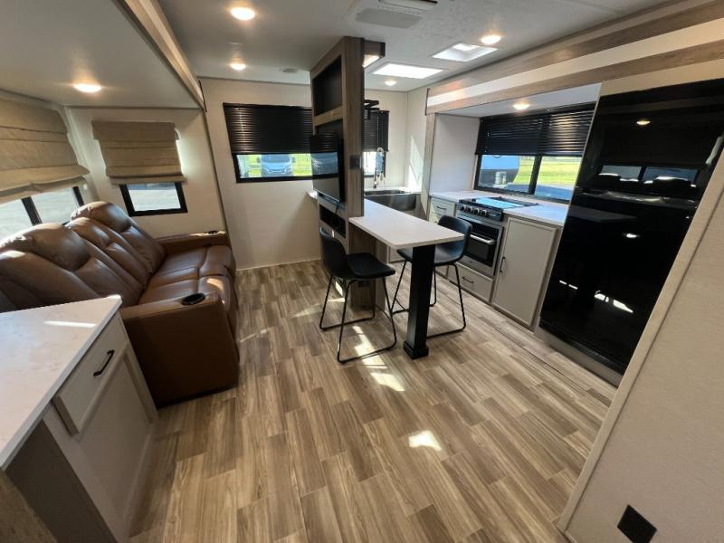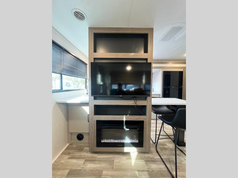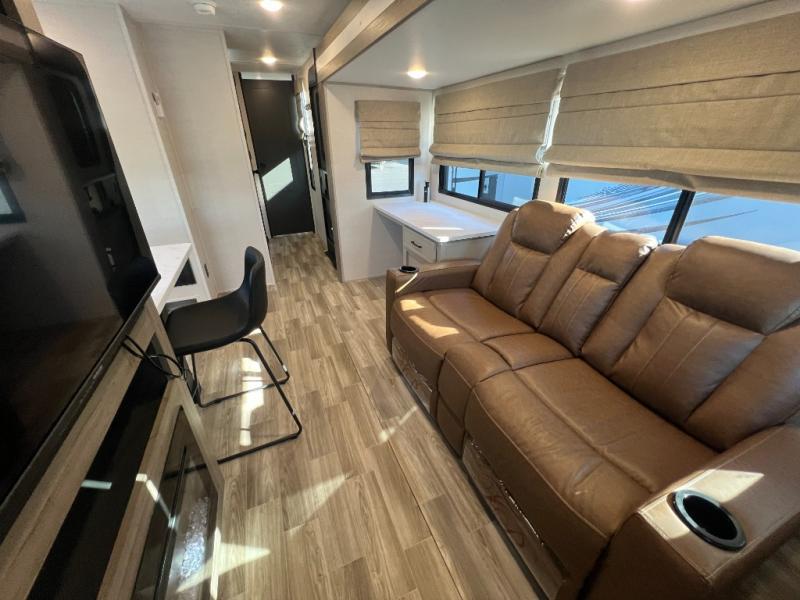 This Vibe travel trailer is perfect for your next getaway! Relax on the theater seating opposite the entertainment center with fireplace. A bar top counter provides plenty of space in the kitchen, where you will also love the fridge, electric oven, and spacious pantry. A desk area even allows you to work if you have to! At night retire to the front bedroom with its custom king bed. The full bath features a spacious 36" x 30" shower, linen closet, and even prep for an optional washer/dryer. Outside you will find dual awnings and an outside fridge so you can grab drinks on the go.