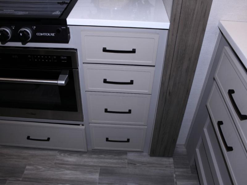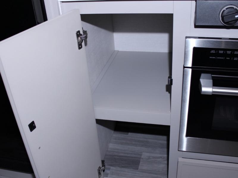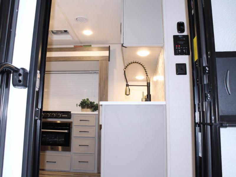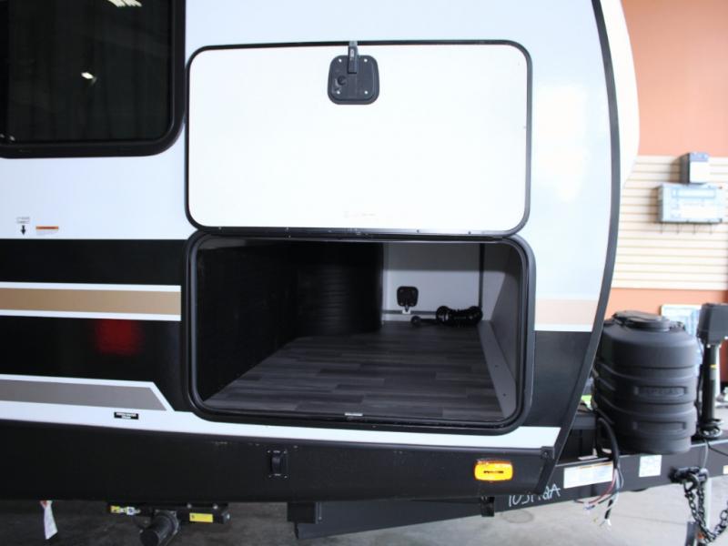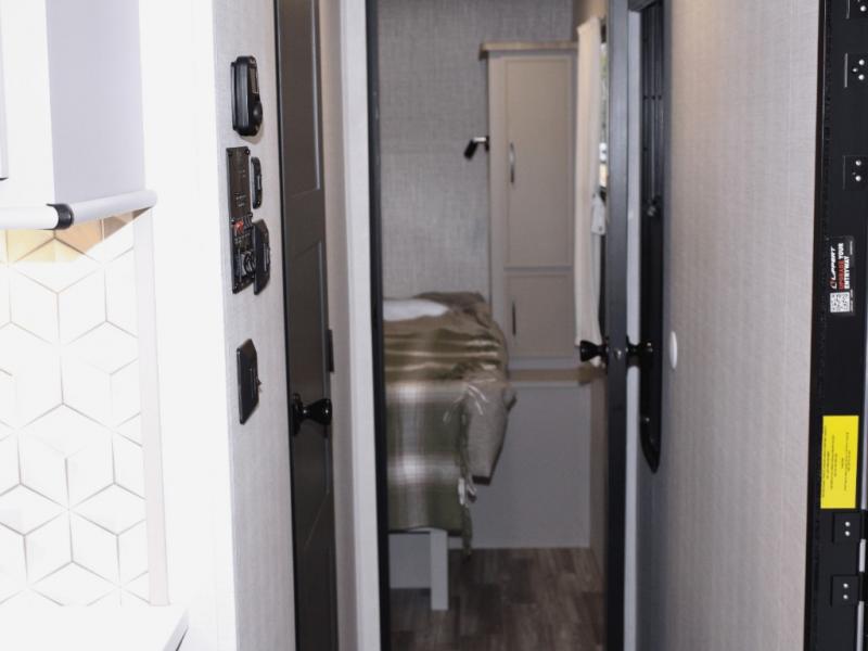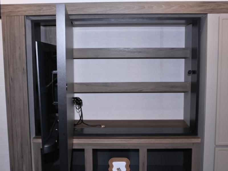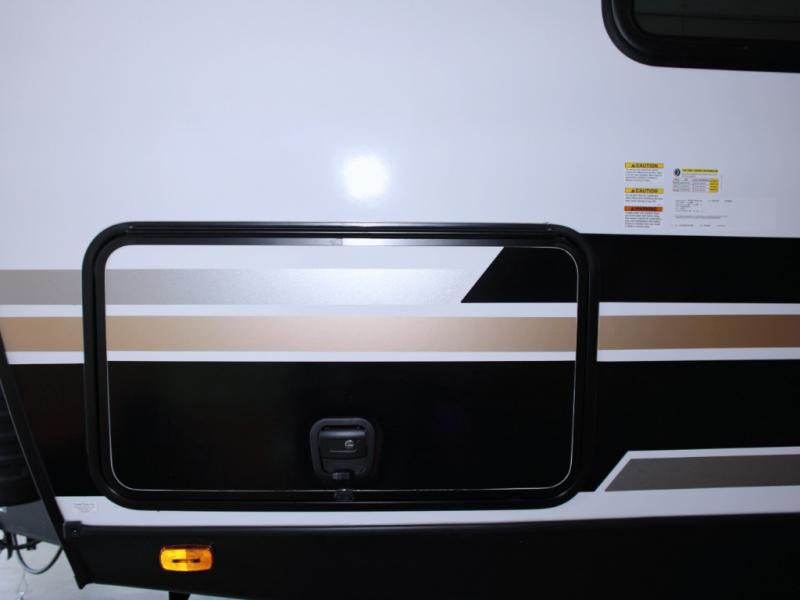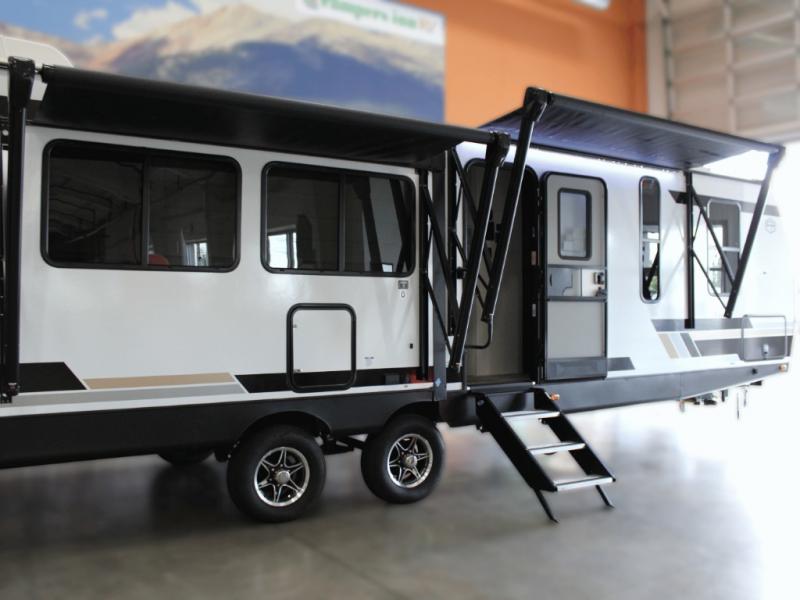 Two power awnings with LED lights provide the perfect shaded outdoor lounge area. The Sure-Step entry steps offer stability and safety, while the pass-through storage ensures you have room for all your gear. It’s the ideal setup for everything from tailgating to quiet nights under the stars.