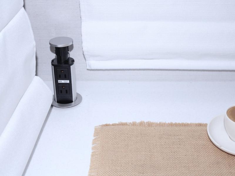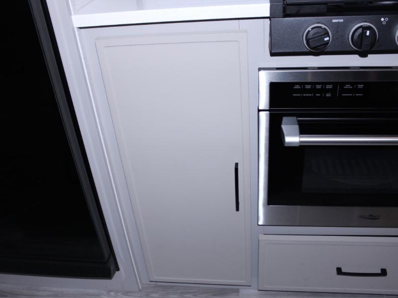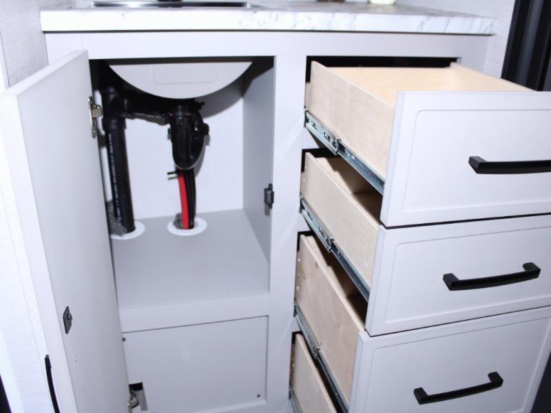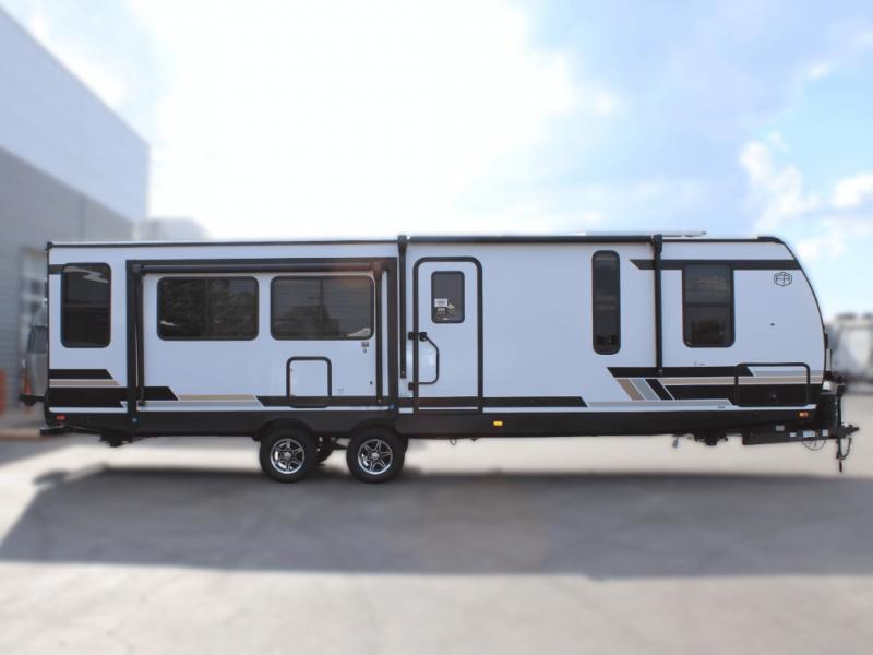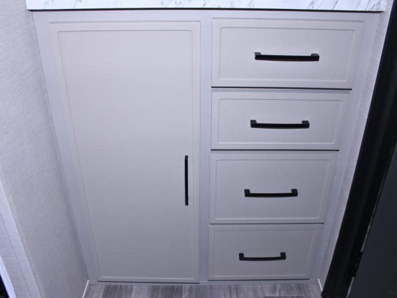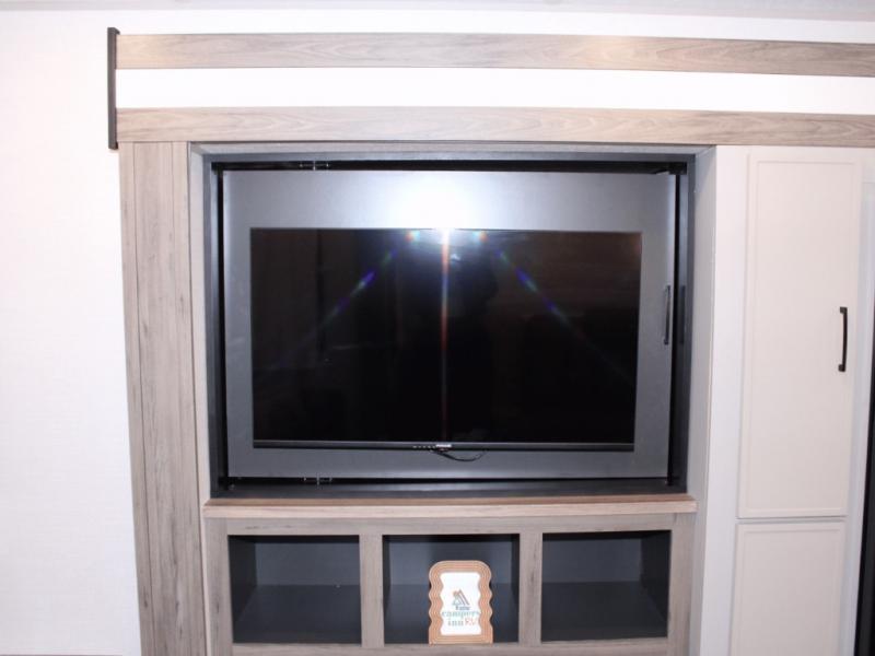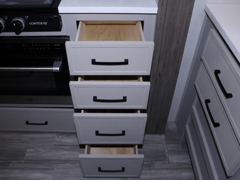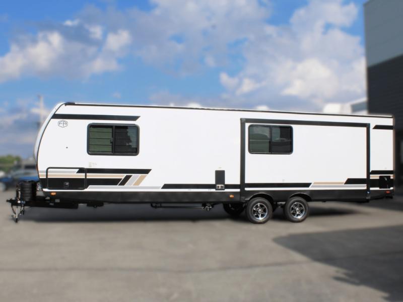 Two power awnings with LED lights provide the perfect shaded outdoor lounge area. The Sure-Step entry steps offer stability and safety, while the pass-through storage ensures you have room for all your gear. It’s the ideal setup for everything from tailgating to quiet nights under the stars.