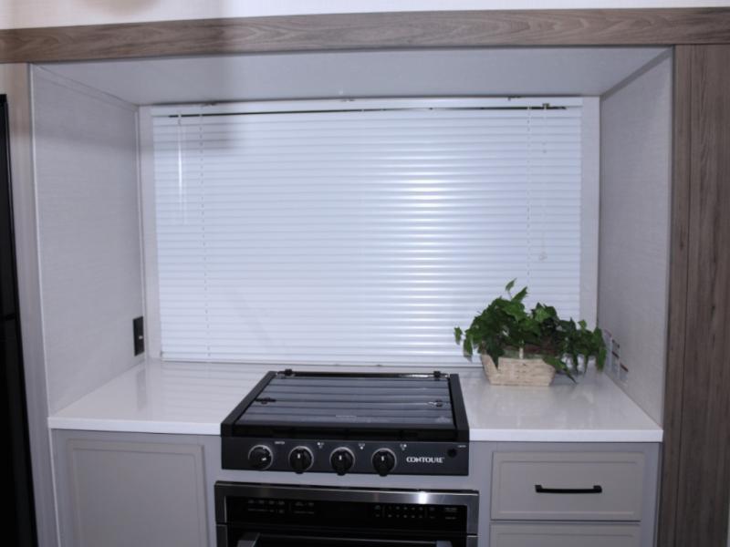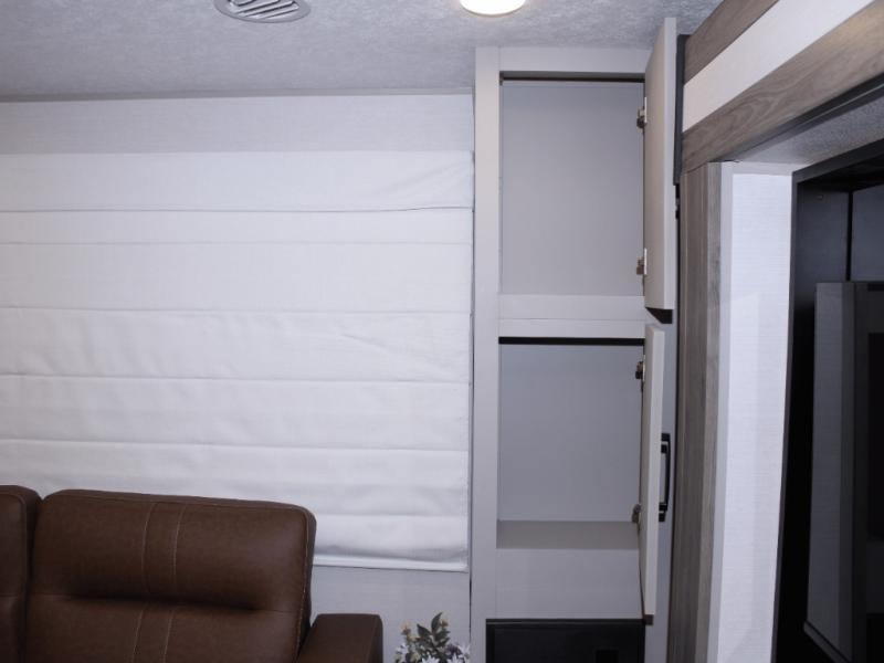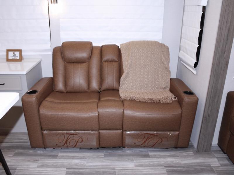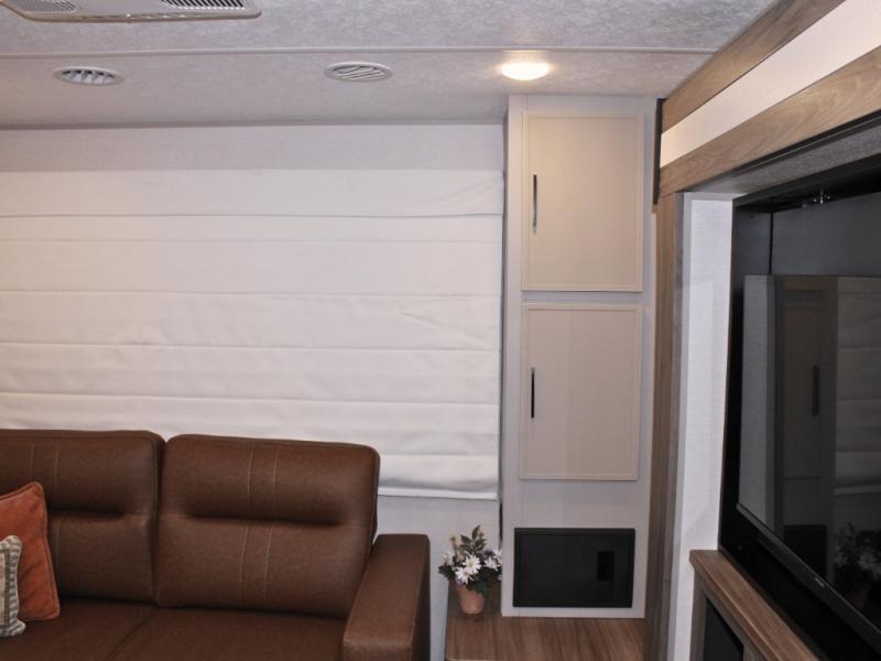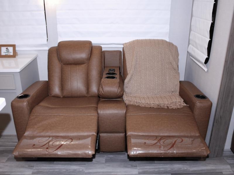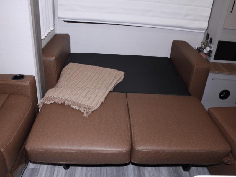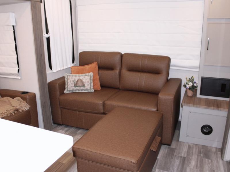 Inside, you’re greeted with premium furniture, decorative window treatments, and privacy shades throughout the living room and bedroom. The attention to detail and thoughtful layout makes this RV feel more like a home than a camper.