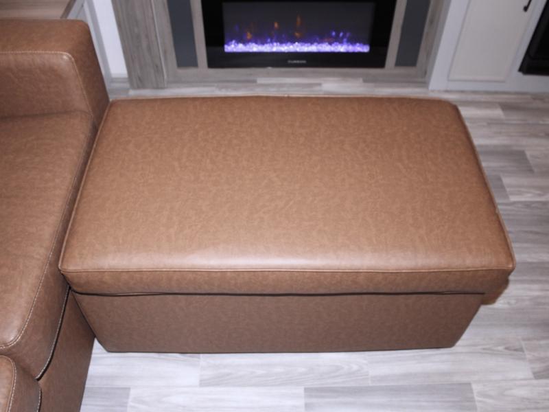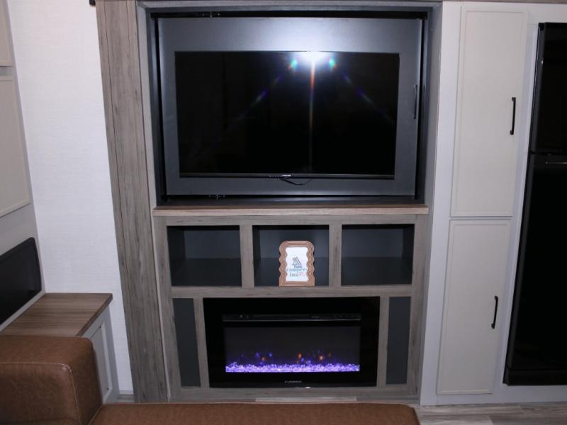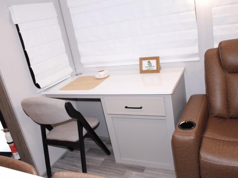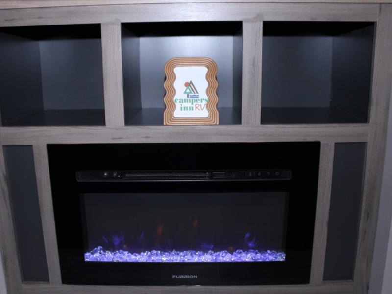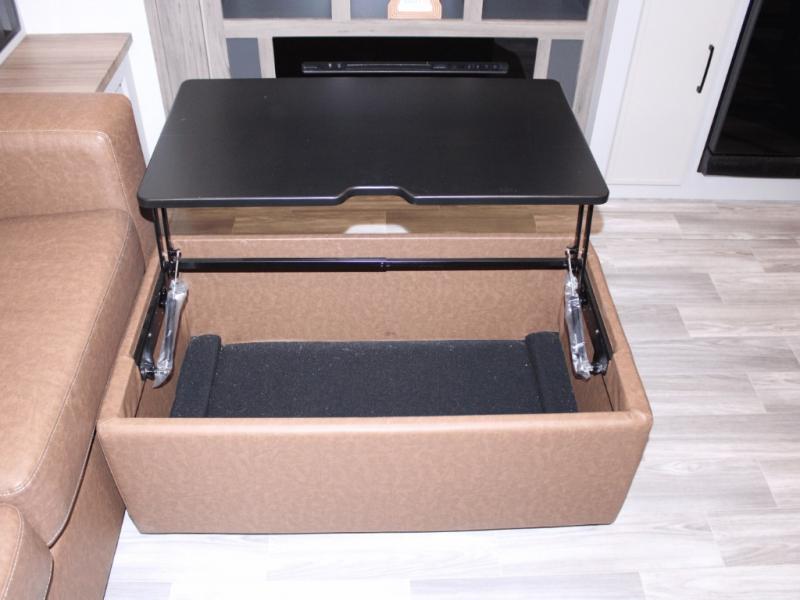 Enjoy wide-open living thanks to dual opposing slide-outs that make the living area feel roomy and inviting. Kick back in the theater seating, cozy up on the sleeper sofa, or get some work done at the built-in desk and chair—perfect for remote workers or trip planning. A fireplace with a TV above adds warmth and entertainment, while the large skylight fills the space with natural light.
