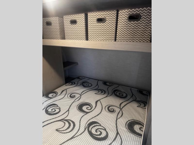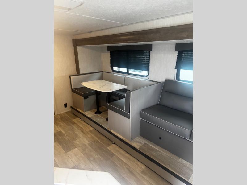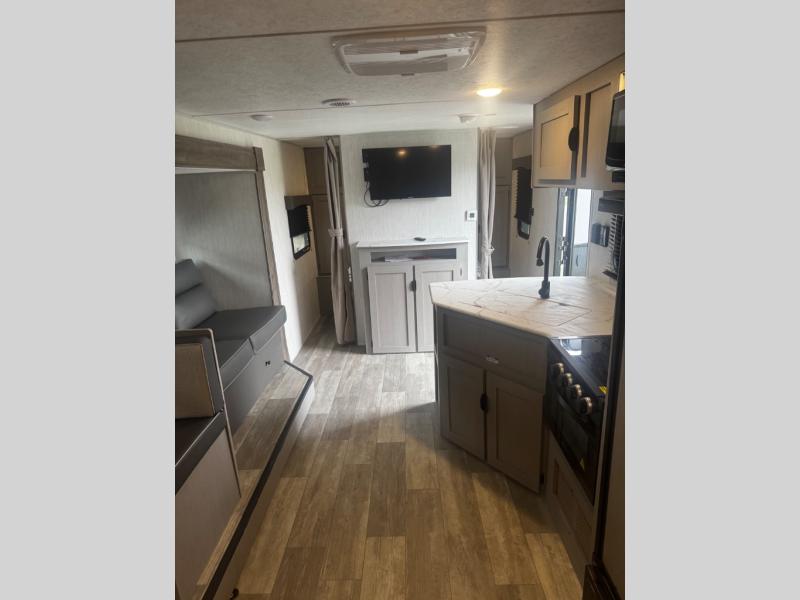 Pack your bags and head to the campground in this spacious travel trailer for eight! The owners will love having their own space in the front private bedroom, complete with an RV queen bed and dual wardrobes and shelves. There are double-size bunks in the rear corner, with the full bath in the other rear corner for easy nighttime use. Everyone can meet in the combined living area and kitchen while the cook makes breakfast. There is a sofa and booth dinette within the large slide out and an entertainment center with an optional fireplace if you want to make this space more cozy. This unit also includes a large pantry with washer and dryer prep, giving you the option to add these appliances, and an optional camp kitchen can be added for the cook who loves being outdoors!