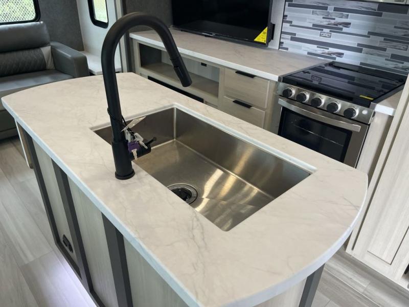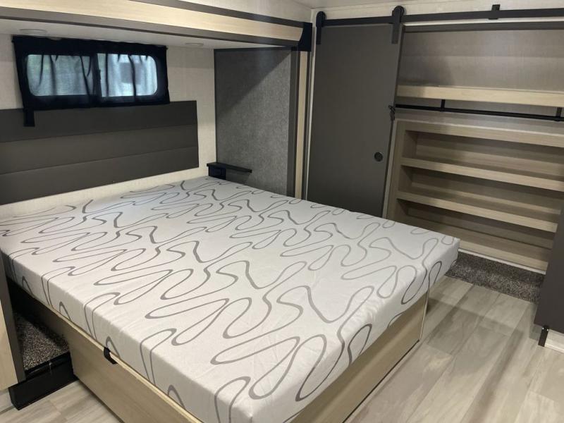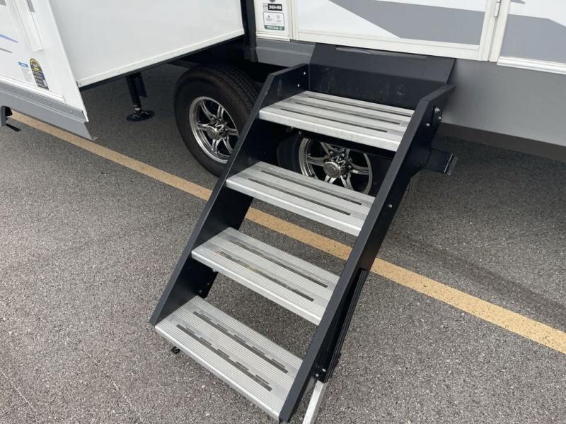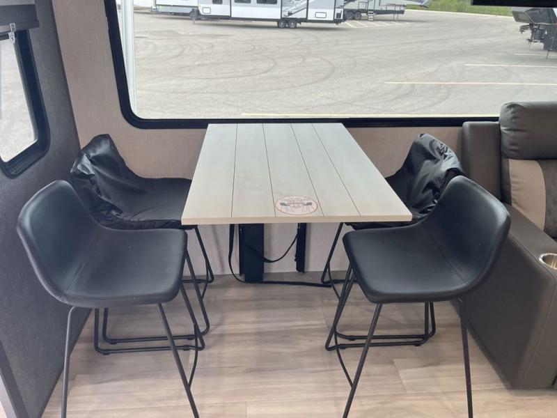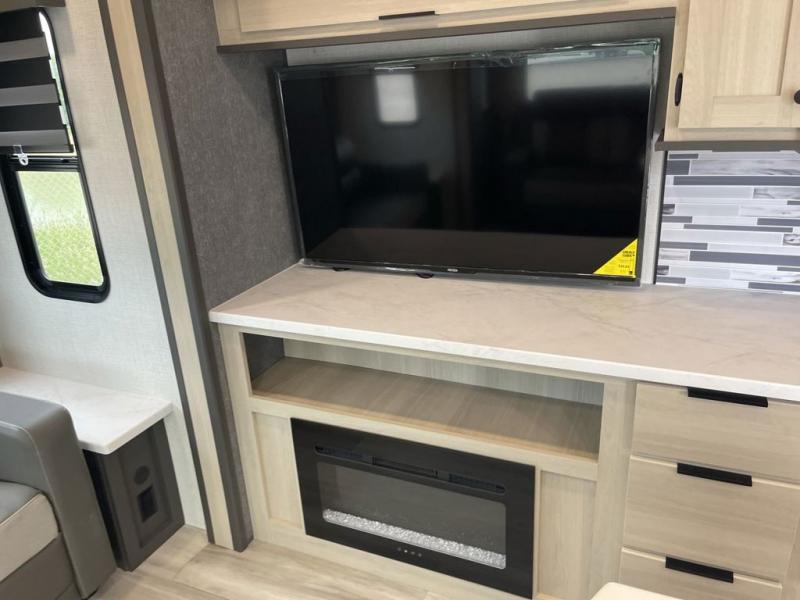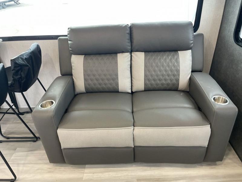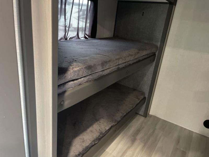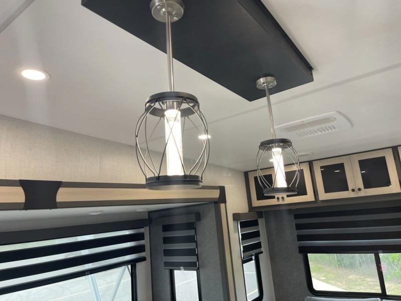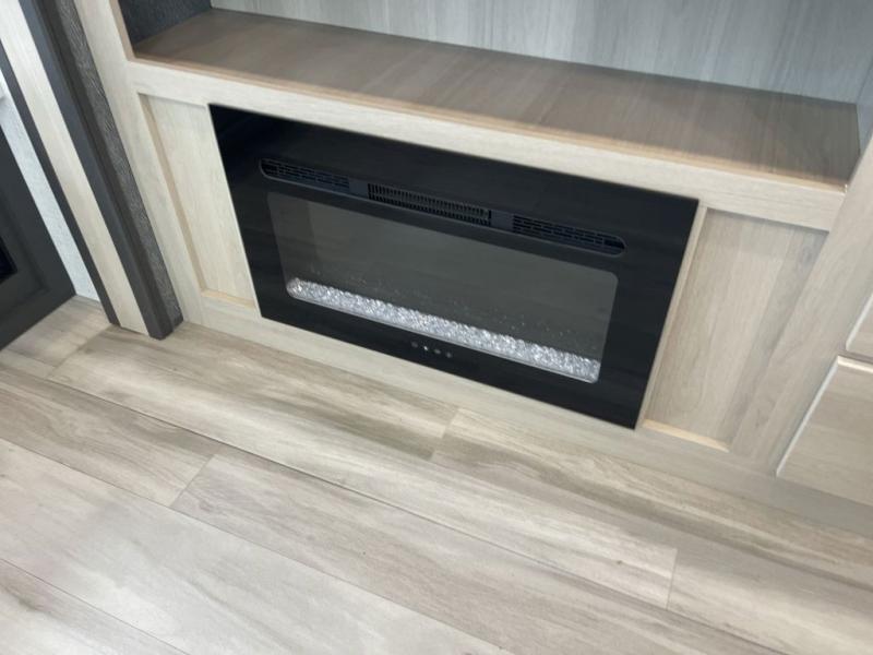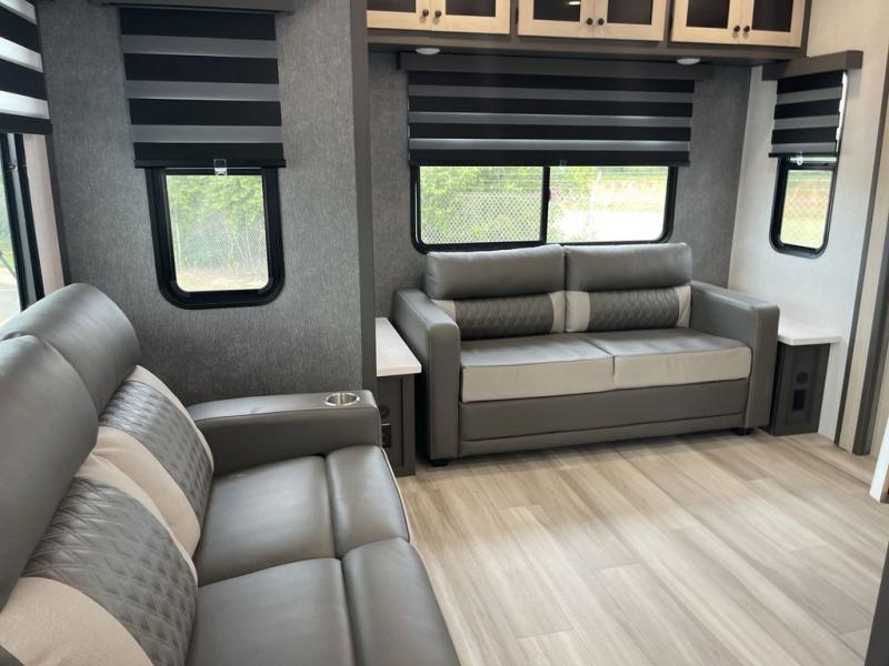Wow! You won't believe the features found in this luxury fifth wheel that can sleep up to nine each night! Your guests or the kids will absolutely love the middle bunkroom with triple bunks and a loft above for even more sleeping or storage space. There is also a pull-out desk here, which will allow you to utilize this space as an office as well! You'll have your own space in the front private bedroom on the king bed slide out, and there is a walk-in wardrobe to keep your clothes tidy. There is even washer and dryer prep for the option to keep those clothes clean! The chef of your group will have everything they need to prepare meals, including a 21" 2-in-1 oven range, an over-the-range microwave, a 16 cu. ft. 12V refrigerator, plus a kitchen island for more counter space. In the evenings, your crew can get cozy on the rear sofa and theater seats across from the entertainment center and fireplace, or you might just play a game at the hi-top table and chairs!