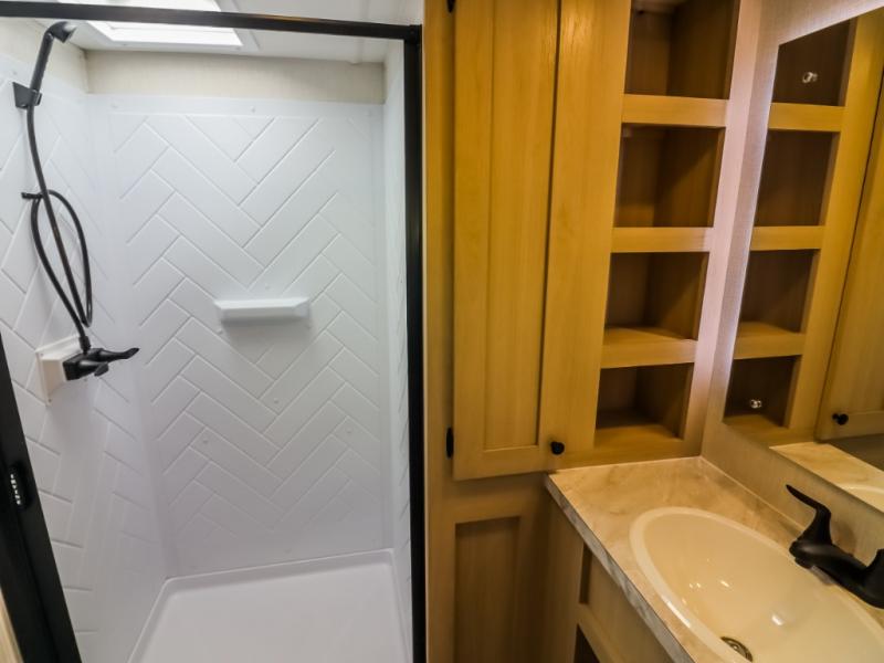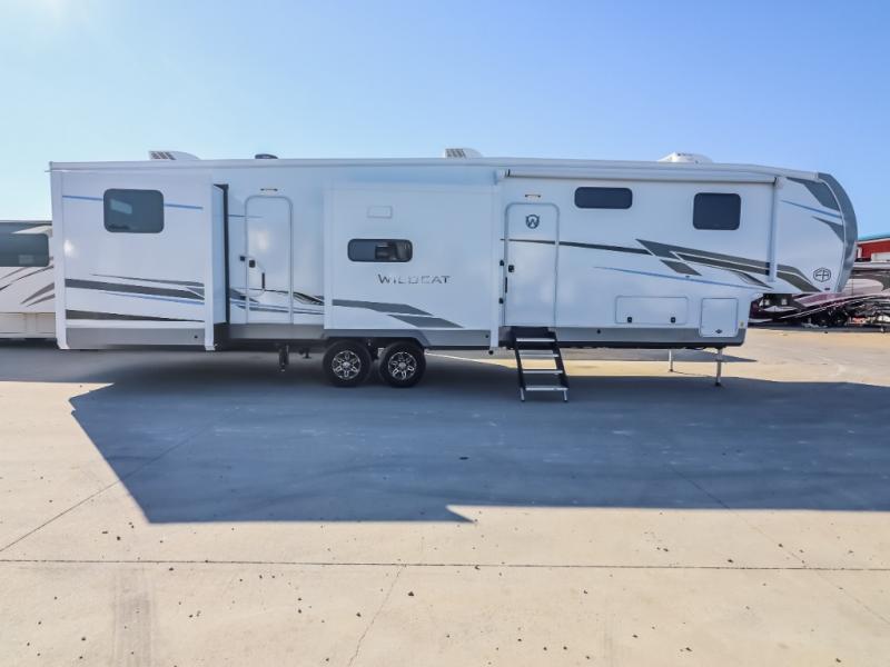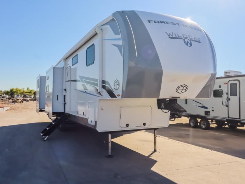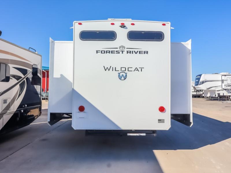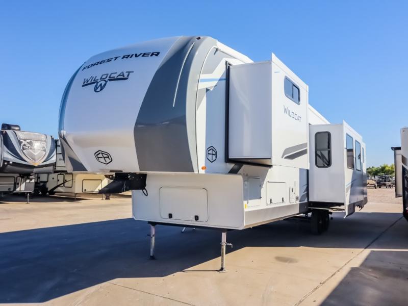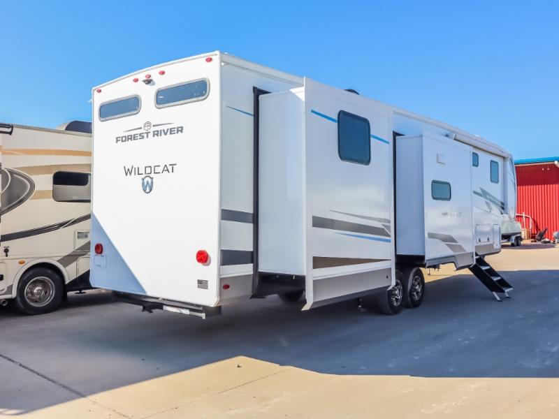 With any Wildcat fifth wheel by Forest River you will enjoy affordable luxury at every turn. These models are constructed with residential fiberglass insulation in the roof and floor, a sectioned ABS plastic underbelly armor, and a vacuum bonded, welded aluminum structure for added strength and durability. You will also find seamless roto-cast holding tanks, an outdoor shower, and 4-point auto leveling for quick and easy setup. Each model includes a best-in-class, high-efficiency 35,000 BTU furnace, along with a 18,000 BTU ducted A/C, with second and third A/C prep, plus an on-demand tankless water heater for added convenience. There are carpet-free living spaces, residential backsplash, motion lighting throughout, and many more comforts!