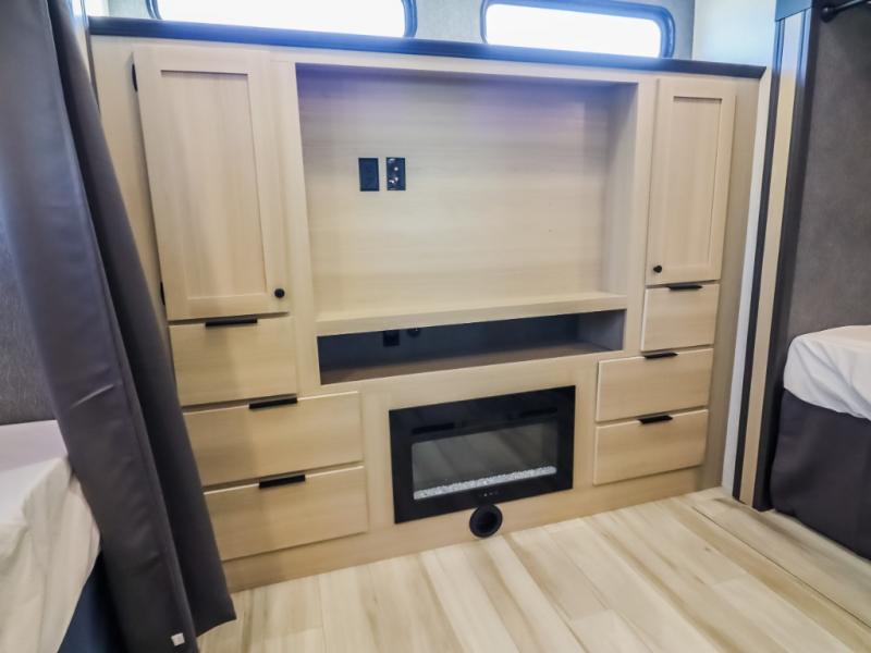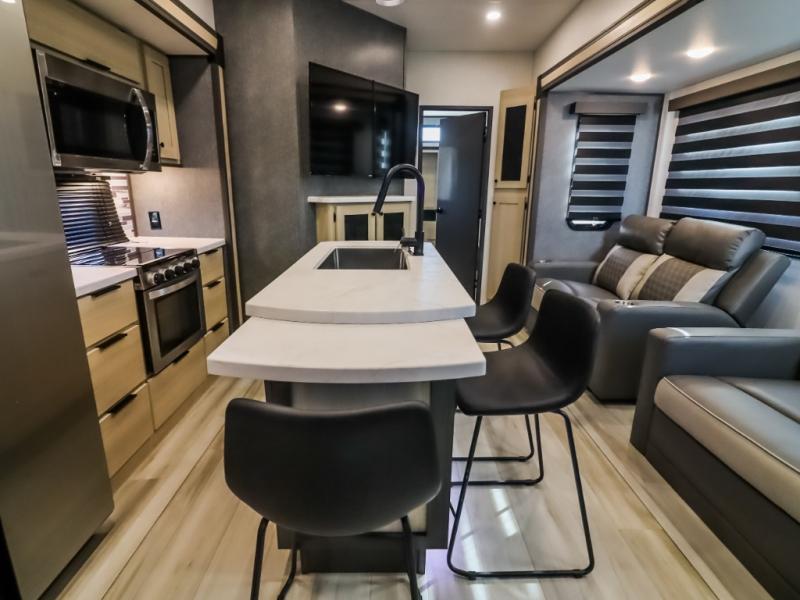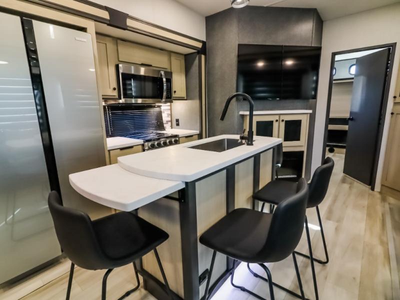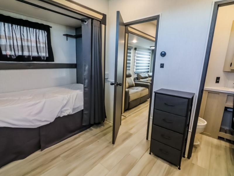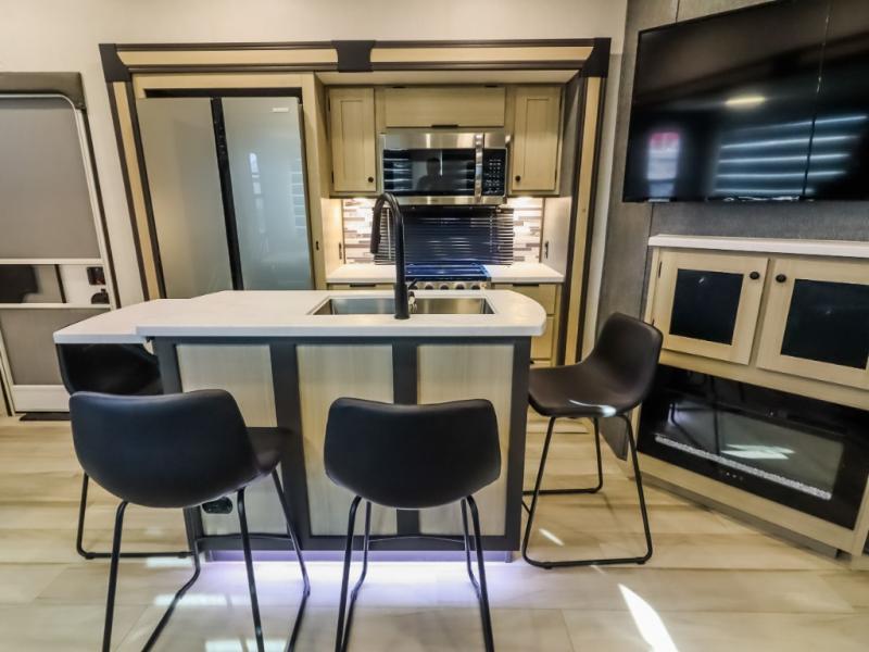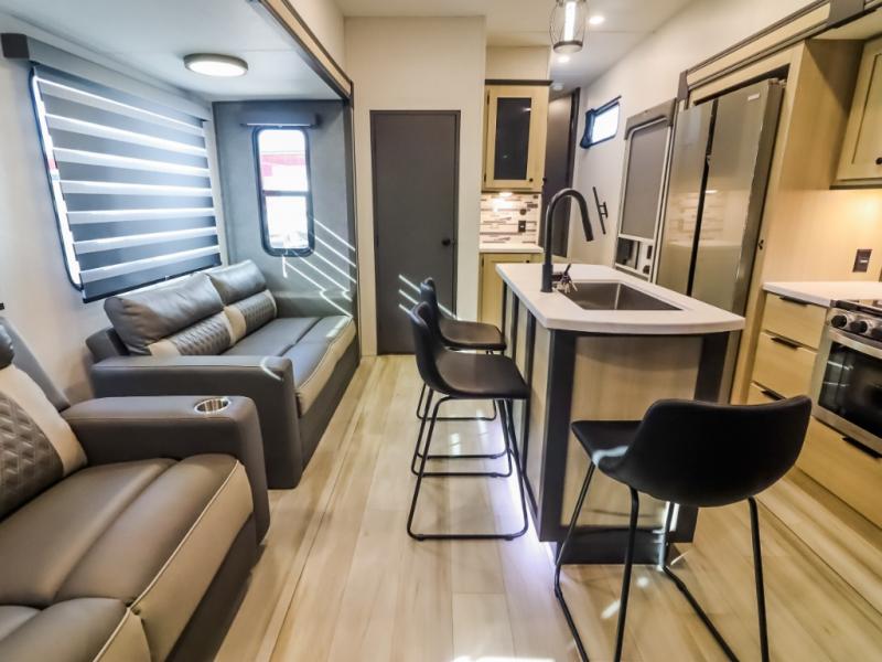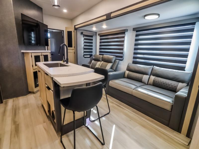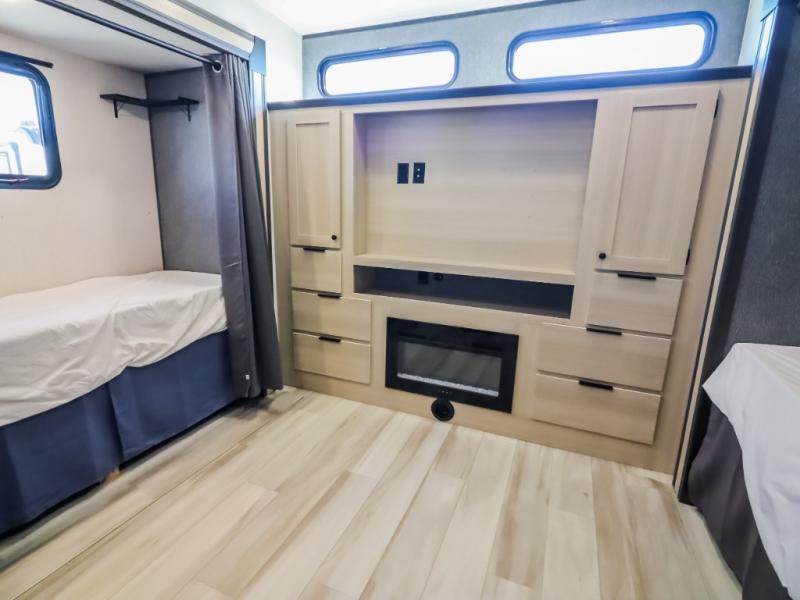 This fifth wheel's name describes it perfectly; it's the best! Your guests will love the rear private bunkhouse with dual opposing slides, bunk beds, plus a hide-a-bed sofa and an entertainment center with dual wardrobes. There is even a half bath with its own exterior entry door! You will have the front private bedroom all to yourselves with a king bed slide out and a walk-in wardrobe with washer and dryer prep. And the full bath is close by for easy nighttime use. The combined middle kitchen and living room will be a space everyone can meet in since there is a hi-top table and chairs and theater seating, an entertainment center with a fireplace, plus a kitchen island where snacks can be set out.