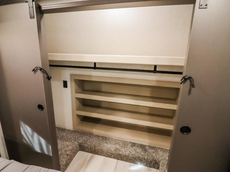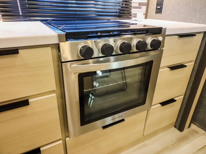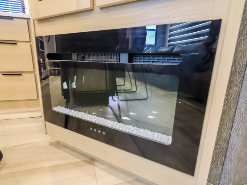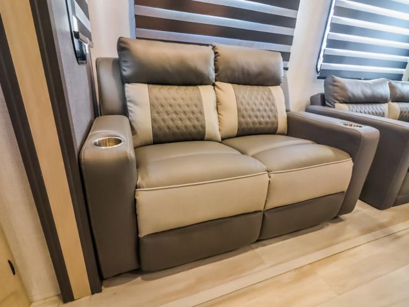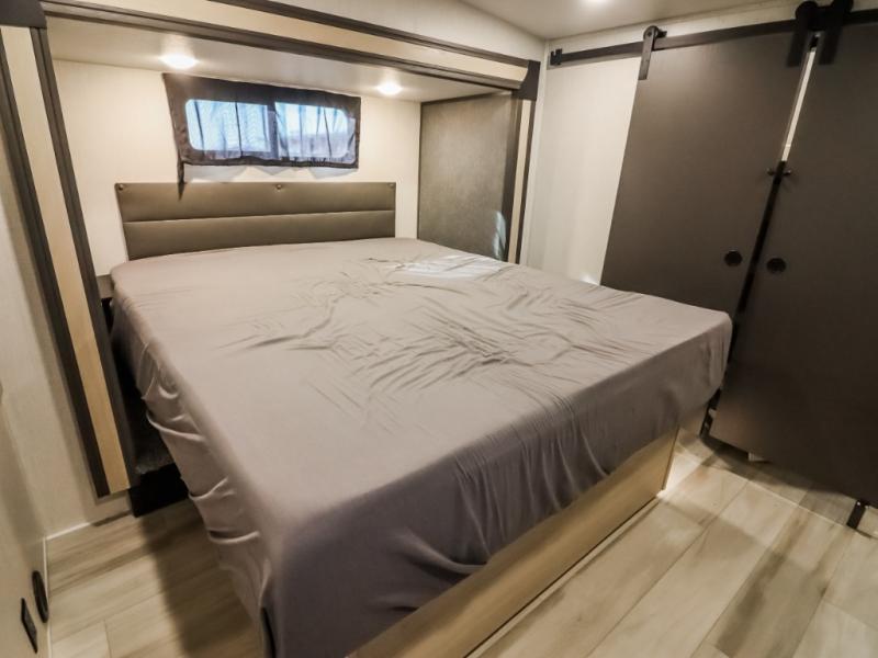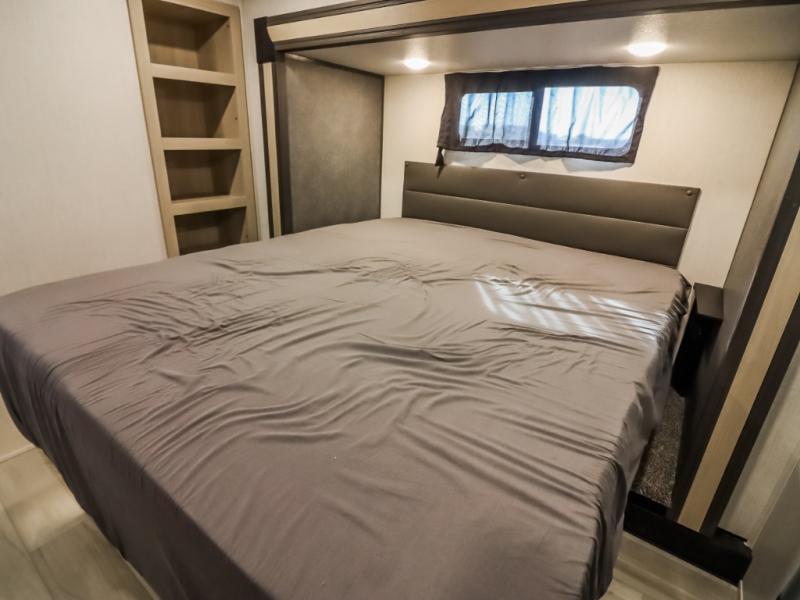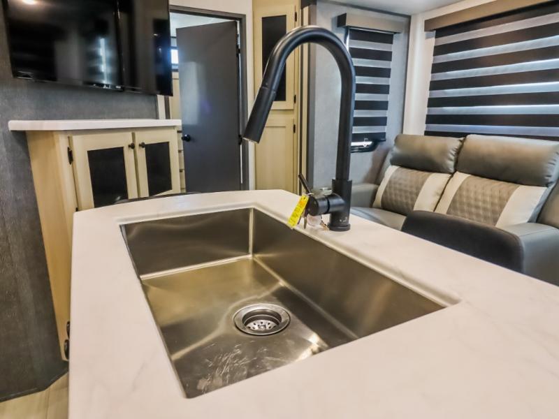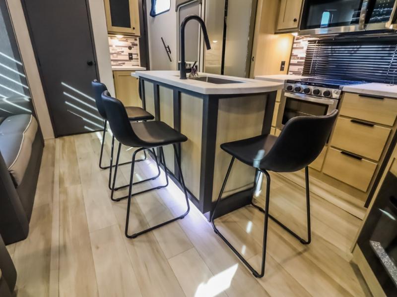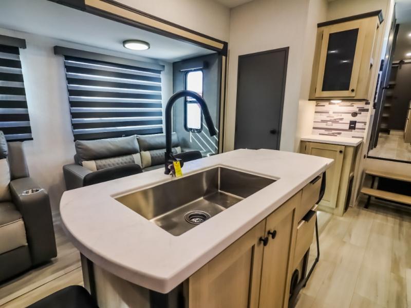 This fifth wheel's name describes it perfectly; it's the best! Your guests will love the rear private bunkhouse with dual opposing slides, bunk beds, plus a hide-a-bed sofa and an entertainment center with dual wardrobes. There is even a half bath with its own exterior entry door! You will have the front private bedroom all to yourselves with a king bed slide out and a walk-in wardrobe with washer and dryer prep. And the full bath is close by for easy nighttime use. The combined middle kitchen and living room will be a space everyone can meet in since there is a hi-top table and chairs and theater seating, an entertainment center with a fireplace, plus a kitchen island where snacks can be set out.