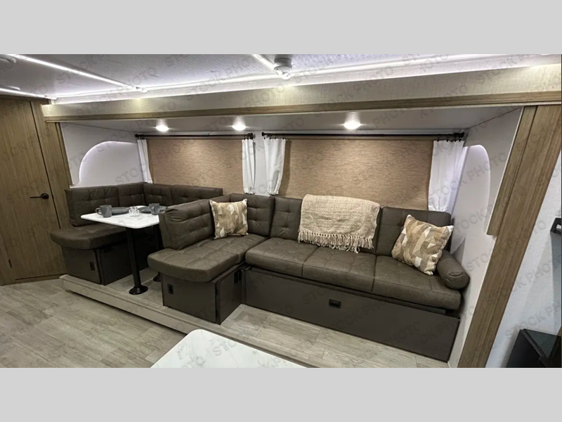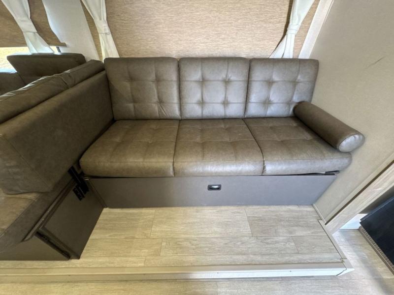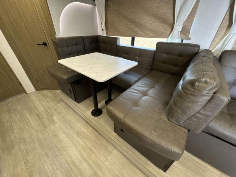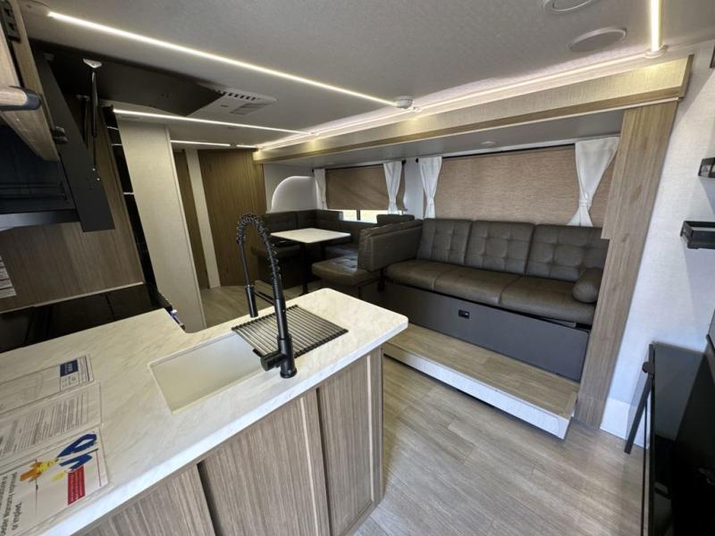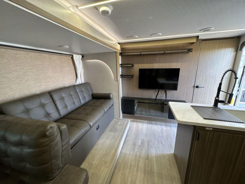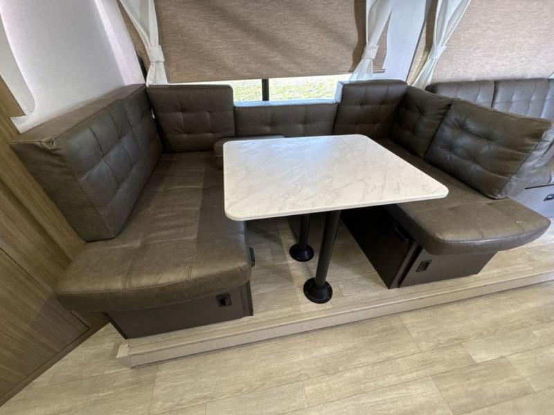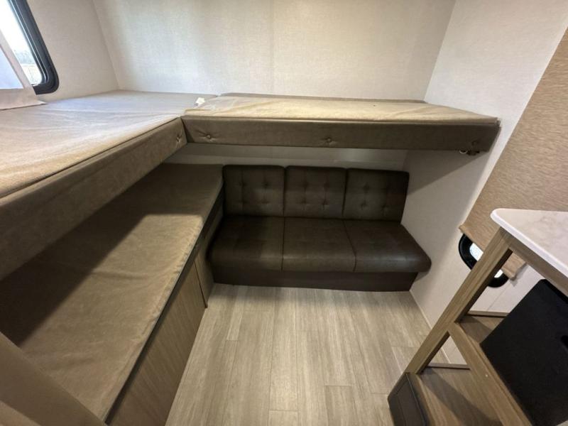 If you like to travel with a large crew, choose this Wildwood X-Lite travel trailer! This trailer has two private sleeping spaces with a private bedroom up front and a private bunkhouse in the back. Not only does the bunkhouse have three bunk beds, but it also has a closet for storage and a jiffy sofa for lounging. In the main living area, there is a large slide that holds the U-shaped dinette and sofa. These pieces of furniture are a part of the Versa Lounge, and you can customize them to function as you need them to. The panoramic windows surround the dinette and sofa so that you can take in the scenic views while you relax. You even have an outdoor camp kitchen to make it more convenient.