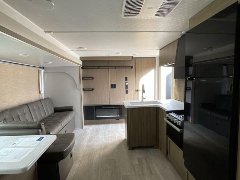 Hurry back to the campsite with this Wildwood travel trailer! With plenty of conveniences all throughout, this model gives you room and amenities to sleep eight people comfortably. You can choose from the custom king bed with Versa Tilt up front in the private bedroom, the set of double-size bunks in the back, of the Versa-Lounge in the main living area. Plus, cooking for everyone will be a breeze in the fully-equipped kitchen or optional exterior kitchen!
