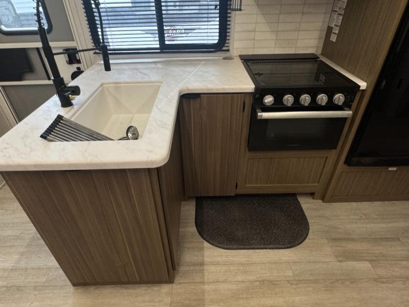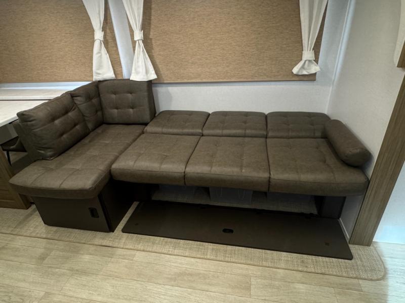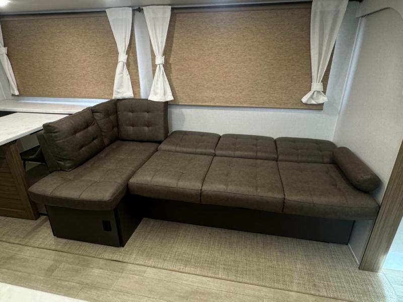 When you're ready to upgrade your RV to a unit with more sleeping space and comfort, choose this Wildwood travel trailer, and you'll never look back. After setting up camp, put out the large slide and prepare lunch indoors or outside at the exterior camp kitchen, and the 18' power awning will shade you from the sun. The kids will find all their snacks in the walk-in pantry, and they can grab a cold drink from the refrigerator. The Versa-Lounge and Versa Flex table offer plenty of seating, dining, and sleeping space. This model features a rear private bunkhouse with a Versa queen bed and two Versa bunks, and you will love the front private bedroom that includes a custom king bed with Versa-Tilt and dual bedside closets.