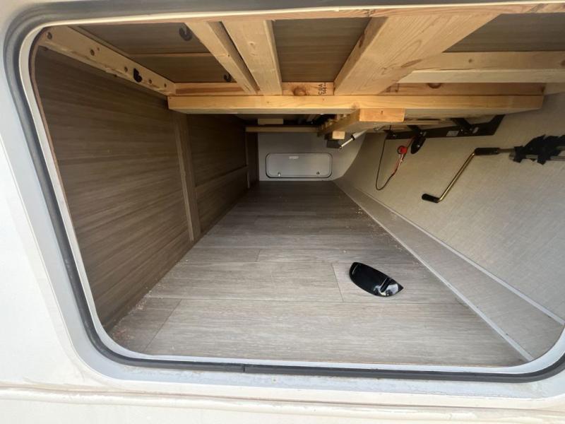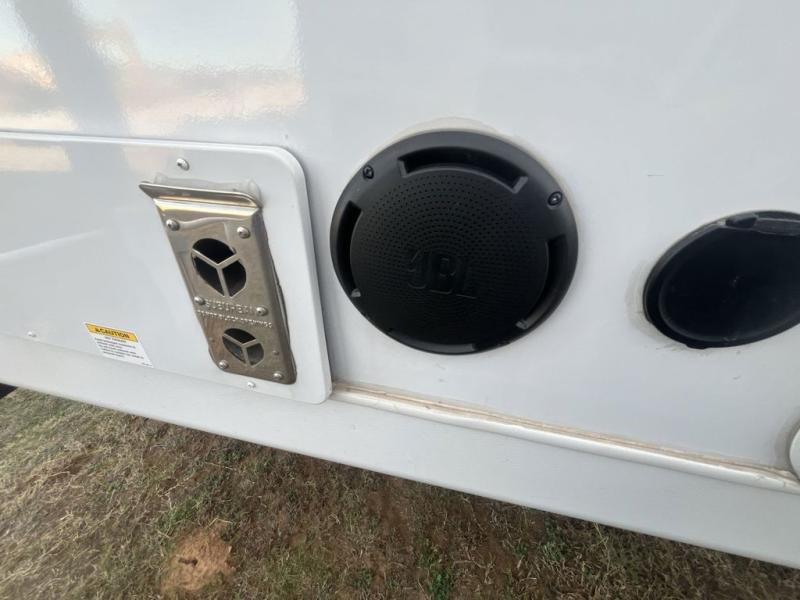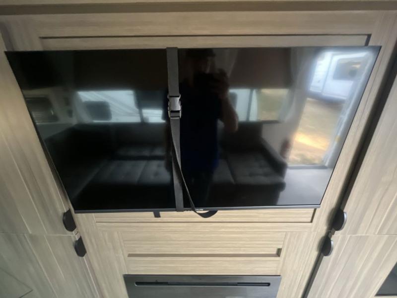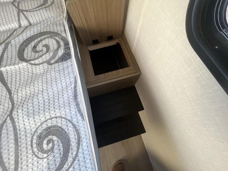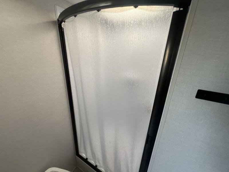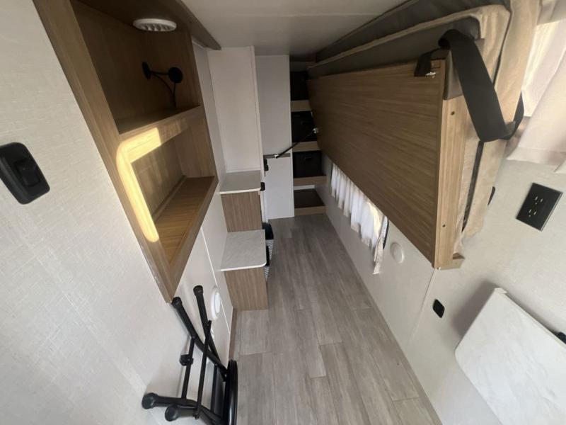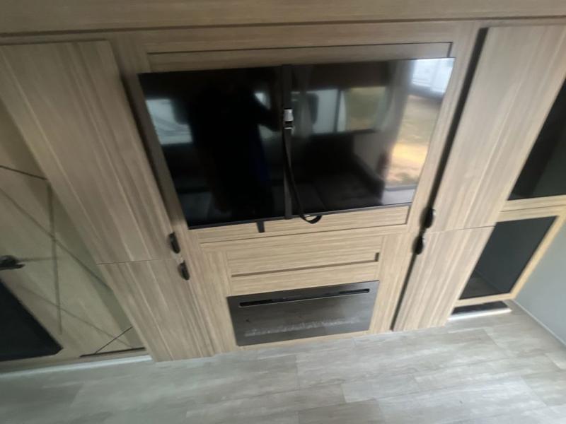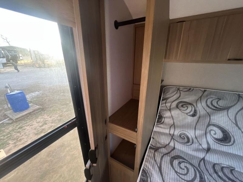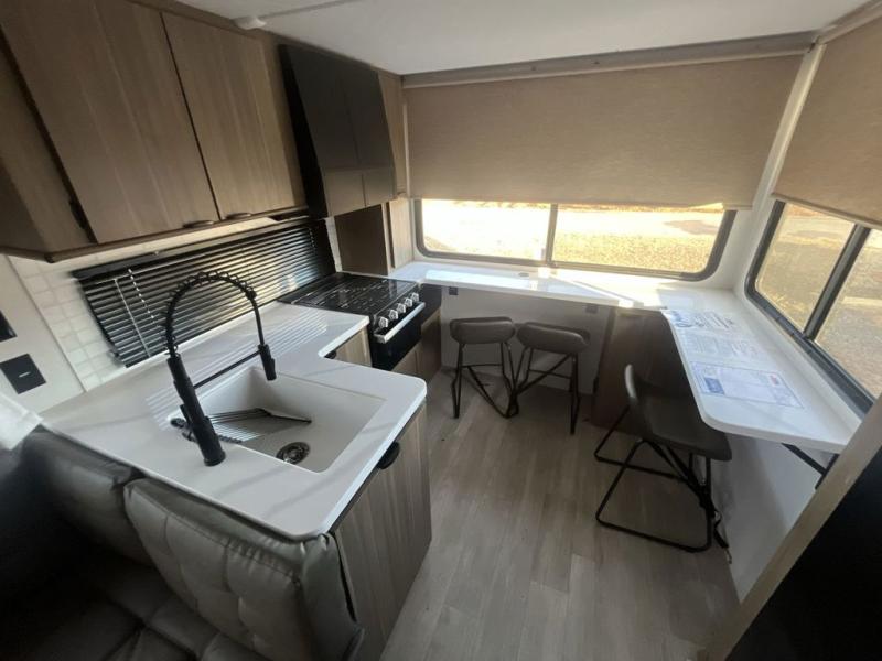 Your family of four to five will enjoy this Wildwood View bunk model. The large Slide features a refrigerator, pantry, and entertainment center with a door leading to a bunk space including a 30" x 70" flip-up bunk with a mattress pad below, storage cubbies for your things, and a desk with bar stool. The rear kitchen area offers wrap-around counterspace with four bar stools, and there is an exterior camp kitchen if the weather is nice and you want to cook outside! A walk-in shower will let you freshen up each day, and the Versa-Tile custom king bed in the front private bedroom is sure to bring a great night's rest. There is also a closet and overhead storage plus a wardrobe with washer/dryer prep option.