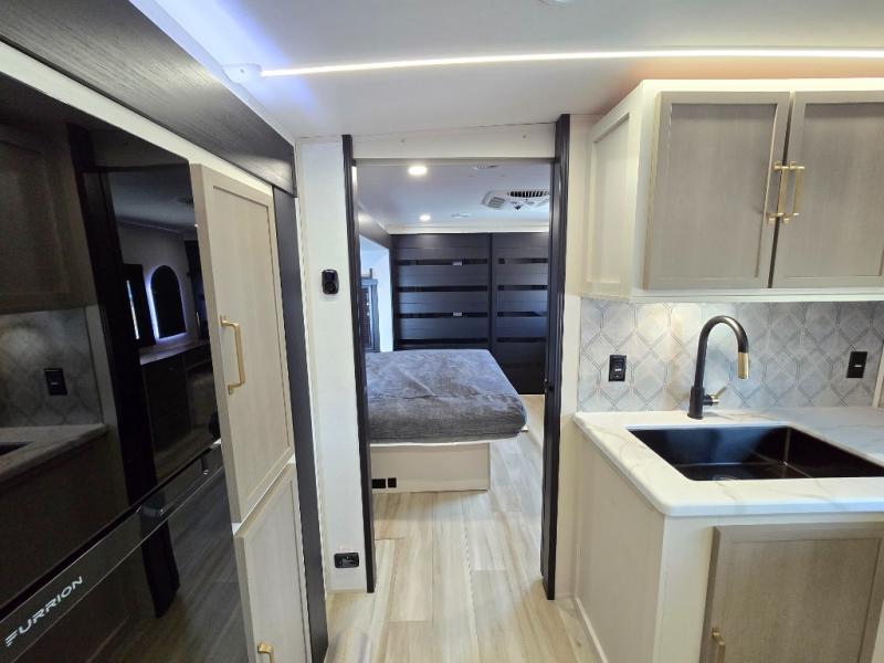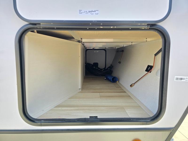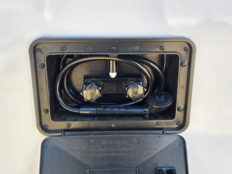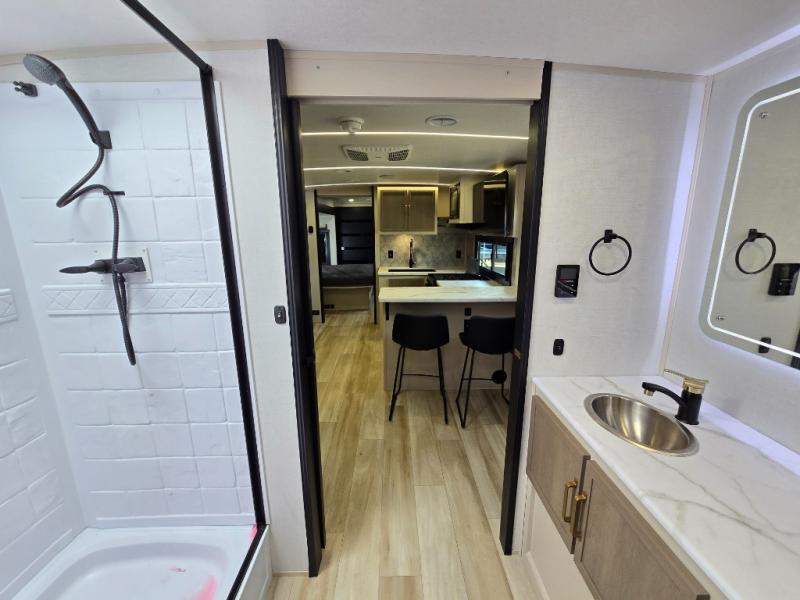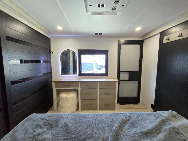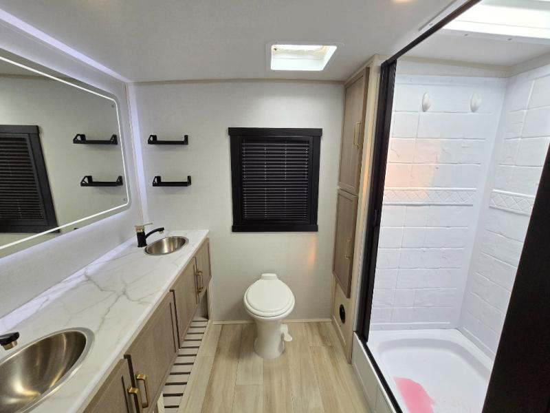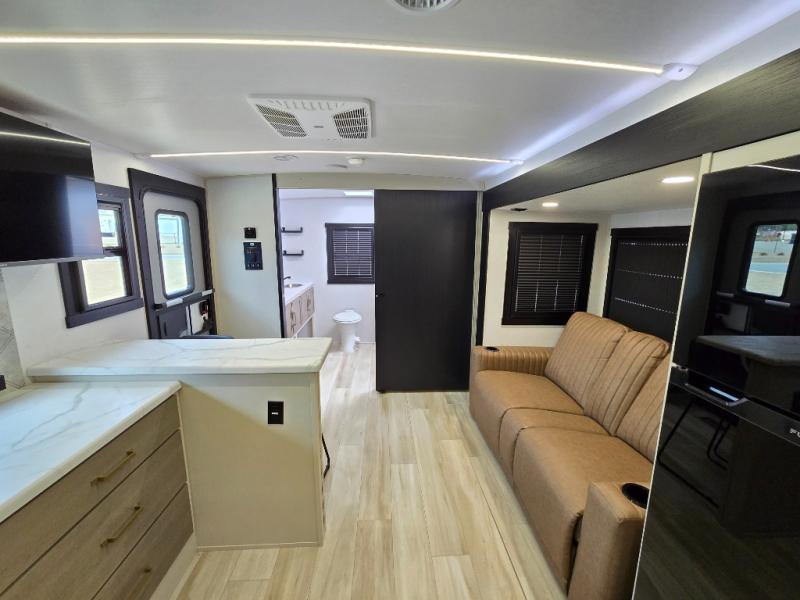 It won't be hard to find comfort in this dual entry travel trailer for two! The front bedroom includes one of the entry doors, a king bed slide out, and a large front wardrobe with washer and dryer prep if you want to add those appliances. You can relax in the main living room and combined kitchen that includes a large slide out and theater seating, or you can relax outside under the 21' awning! There is also an outside kitchen with a griddle and refrigerator if you enjoy cooking outdoors. Once you've headed back inside for the night, you can freshen up in the full rear bath before bed. Here, you'll find dual bath sinks, a linen closet, and a walk-in shower with skylights for more natural lighting!