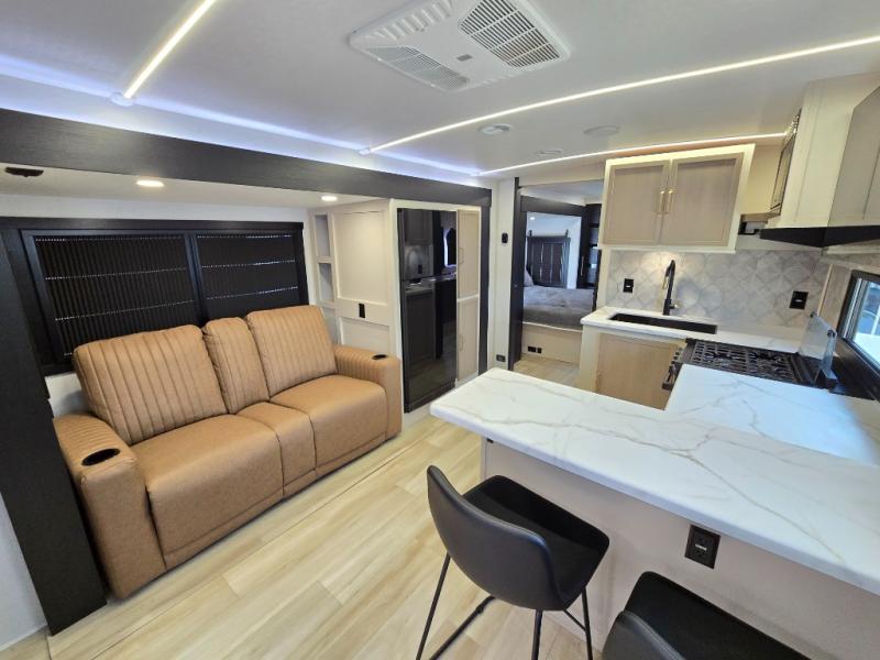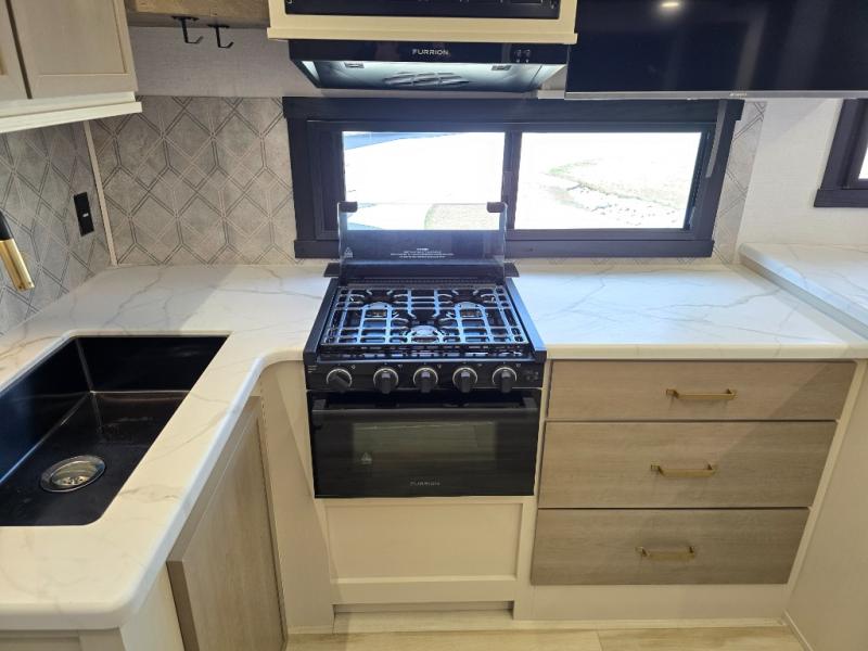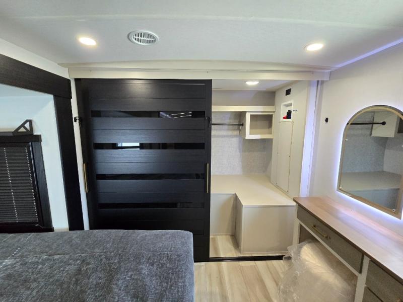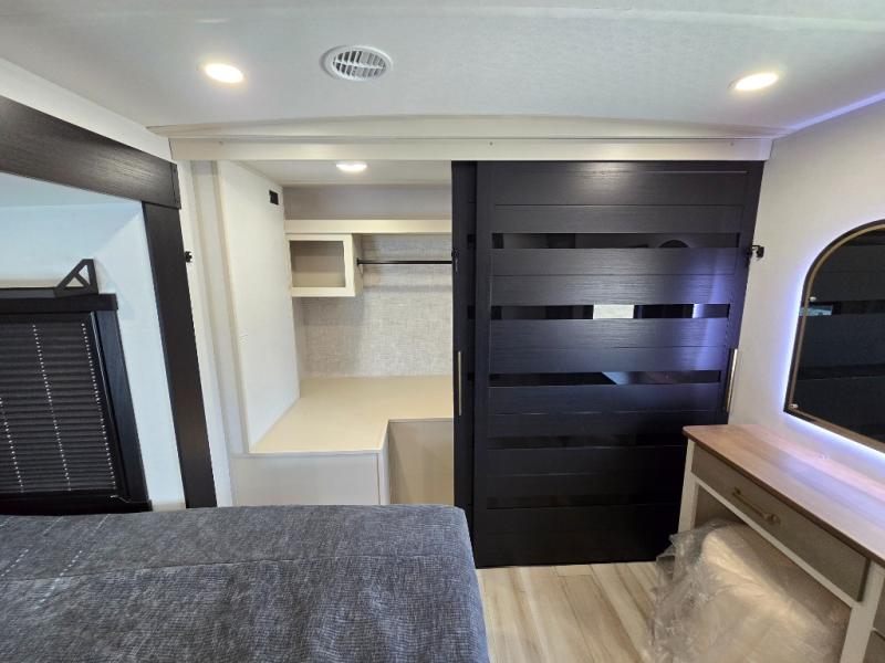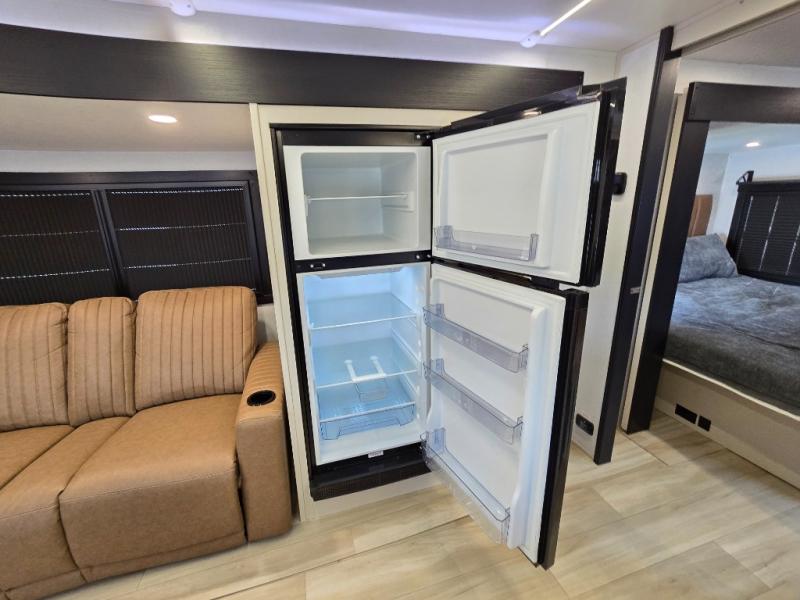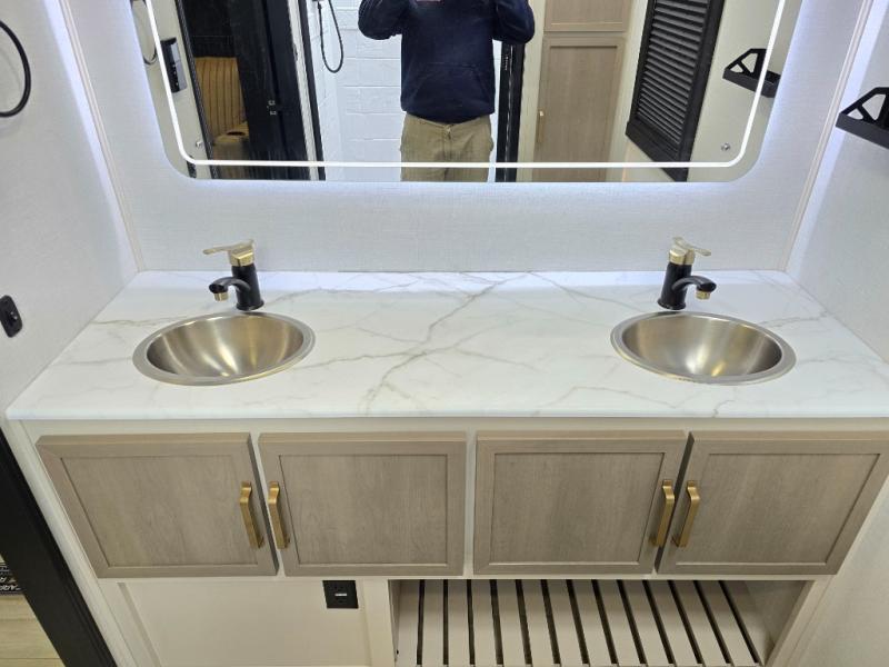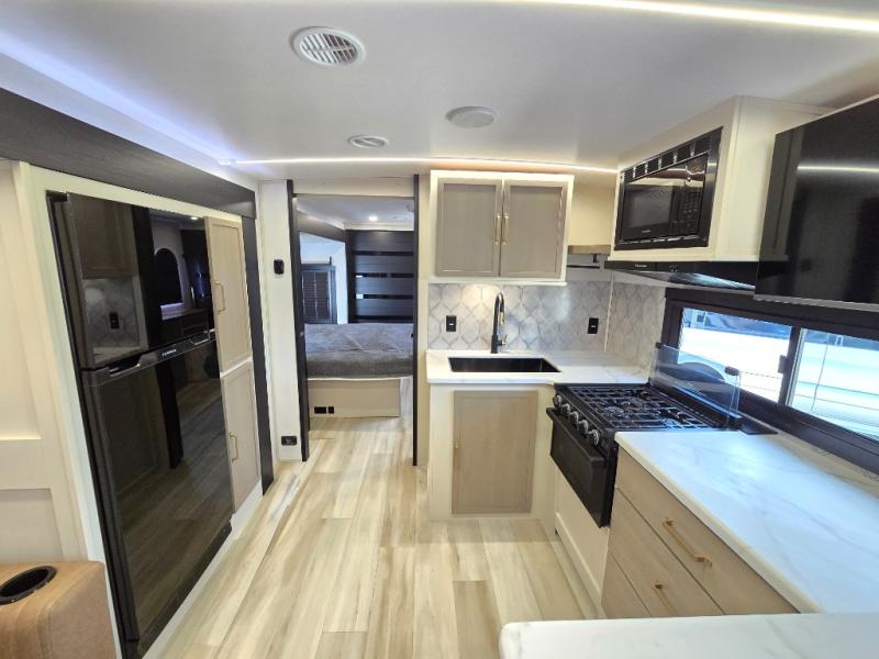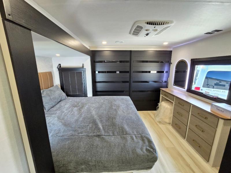 It won't be hard to find comfort in this dual entry travel trailer for two! The front bedroom includes one of the entry doors, a king bed slide out, and a large front wardrobe with washer and dryer prep if you want to add those appliances. You can relax in the main living room and combined kitchen that includes a large slide out and theater seating, or you can relax outside under the 21' awning! There is also an outside kitchen with a griddle and refrigerator if you enjoy cooking outdoors. Once you've headed back inside for the night, you can freshen up in the full rear bath before bed. Here, you'll find dual bath sinks, a linen closet, and a walk-in shower with skylights for more natural lighting!