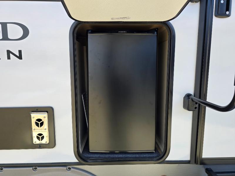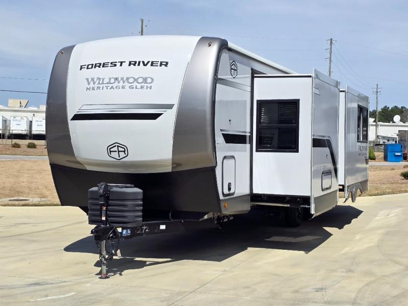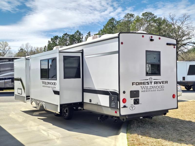 With any Wildwood Heritage Glen travel trailer by Forest River, the quality construction, attention to detail and design along with a bright and welcoming interior allows you to relax in comfort with conveniences while exploring outdoors. Each model includes a WeatherShield one piece fiberglass roof, Maxxis radial tires, and an enclosed underbelly with 12V tank heaters on all holding tanks for added protection. You will appreciate the on-demand tankless water heater, along with the 15K BTU Quite Cool A/C and 50 Amp service with a brace for a second A/C. There is an outside shower with hot and cold water, solar prep, a power tongue jack, plus many more exterior conveniences. Head inside to enjoy matte gold hardware, wood door casings in place of plastic door casings, and full length barreled ceilings for additional head room.